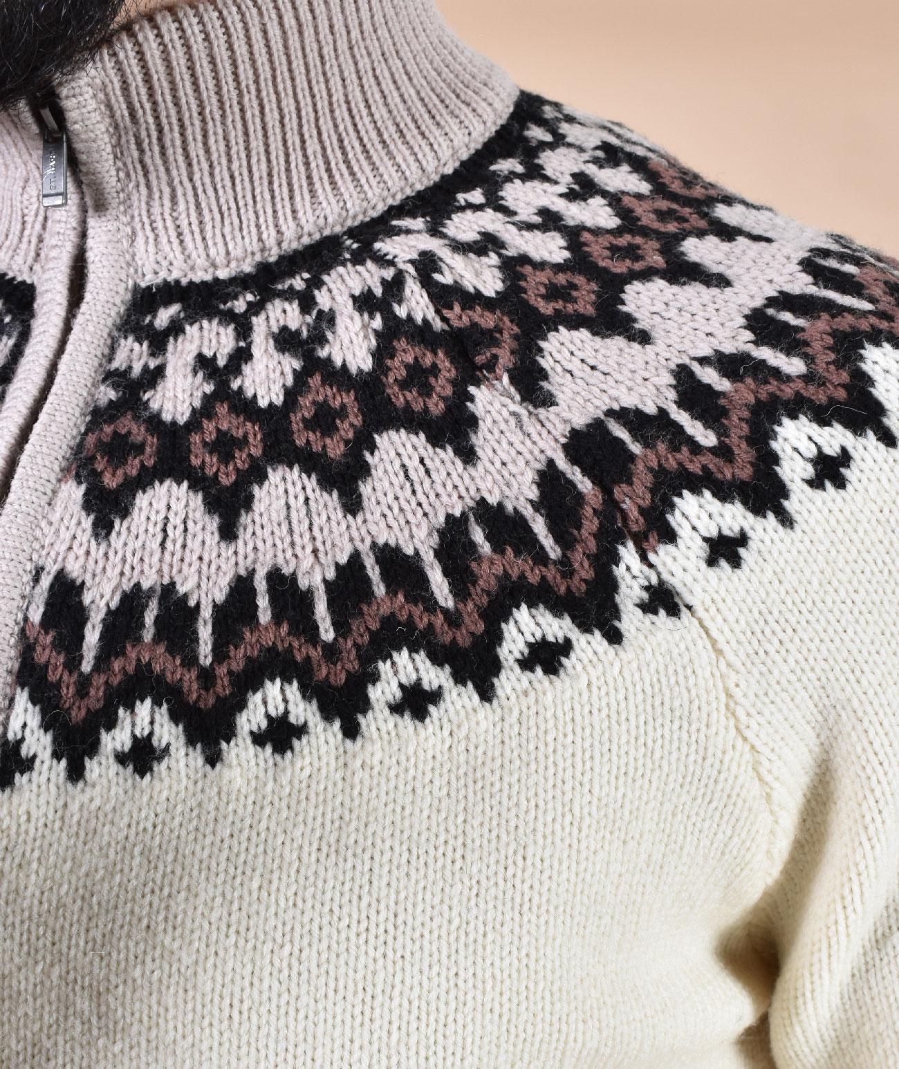 Maglia in lavorazione spessa vestibilità regolare, colore bianco con fantasia jacquard, collo alto con apertura zip. Tessuto morbido e soffice, non provoca pungitura a contatto con la pelle. Composizione 100% lana vergine. Collezione Autunno/Inverno 2026 Il modello in foto è alto 1.80 x 81 kg, veste taglia L