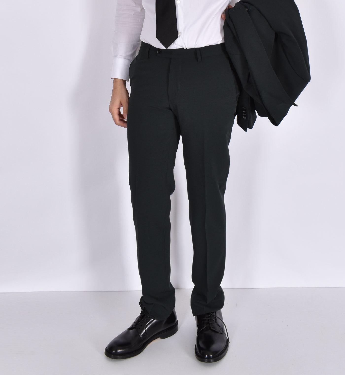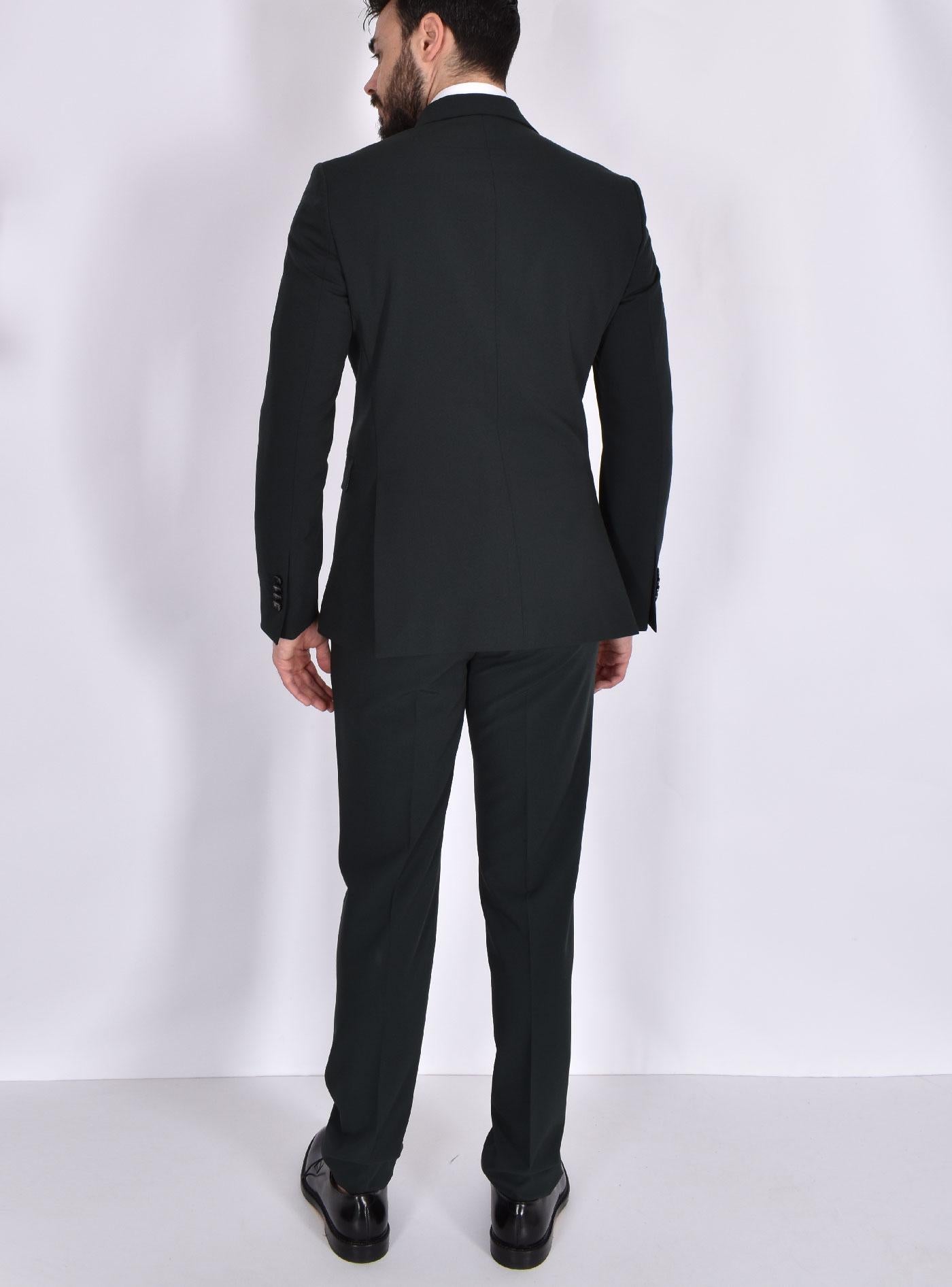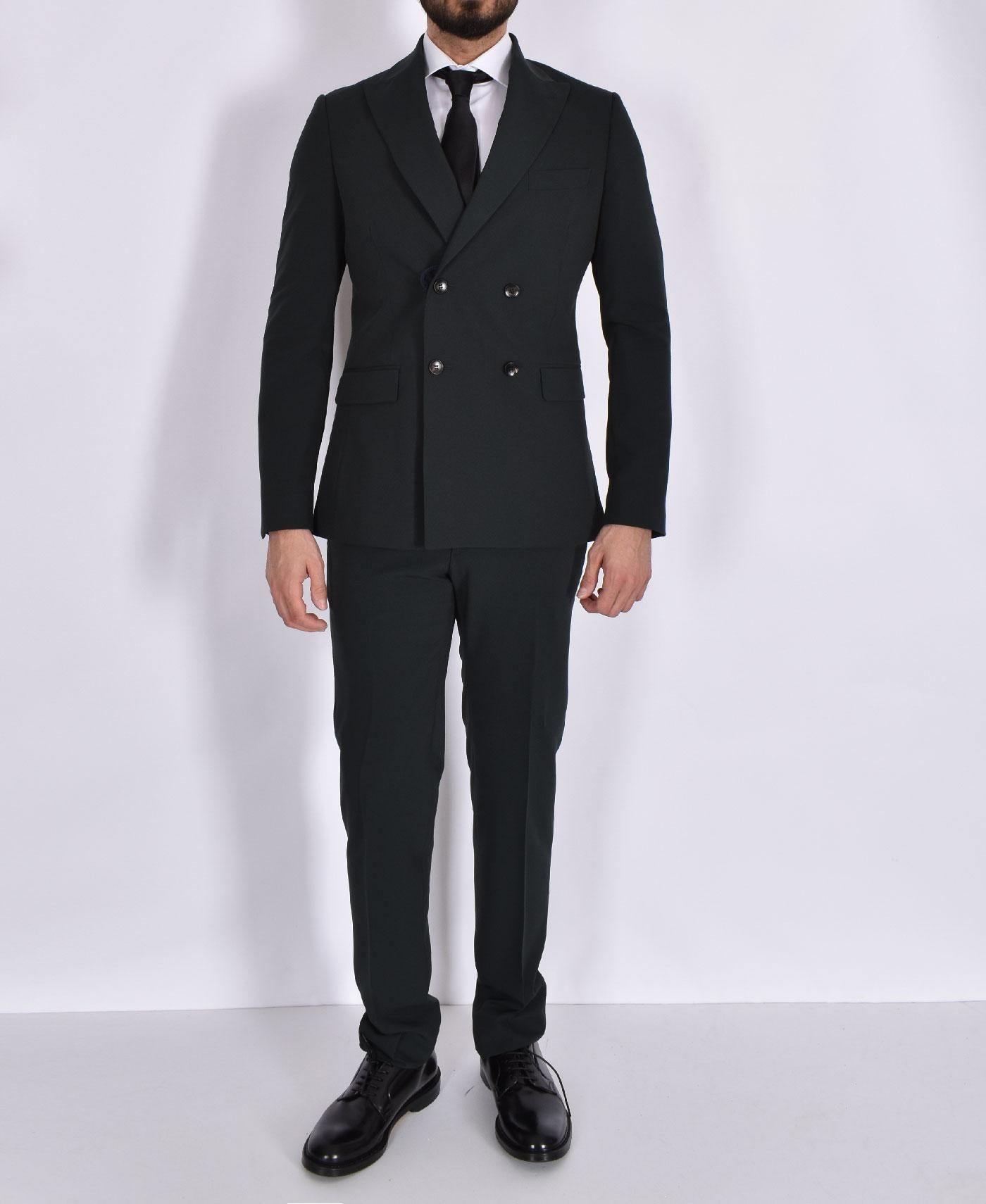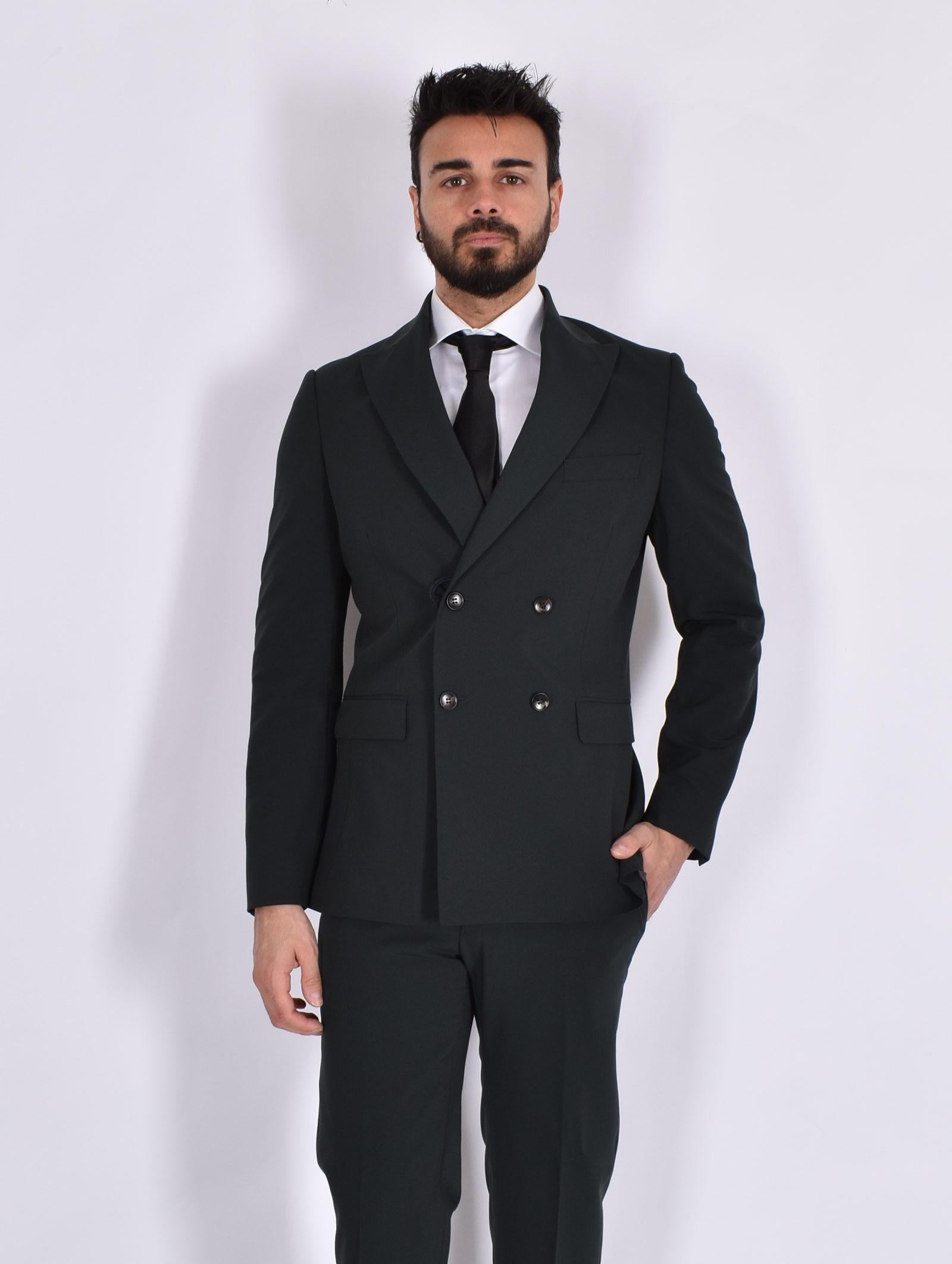 Abito modello doppiopetto, vestibilità slim, colore verde. Composizione 70% PL, 24%VI, 6% EA.