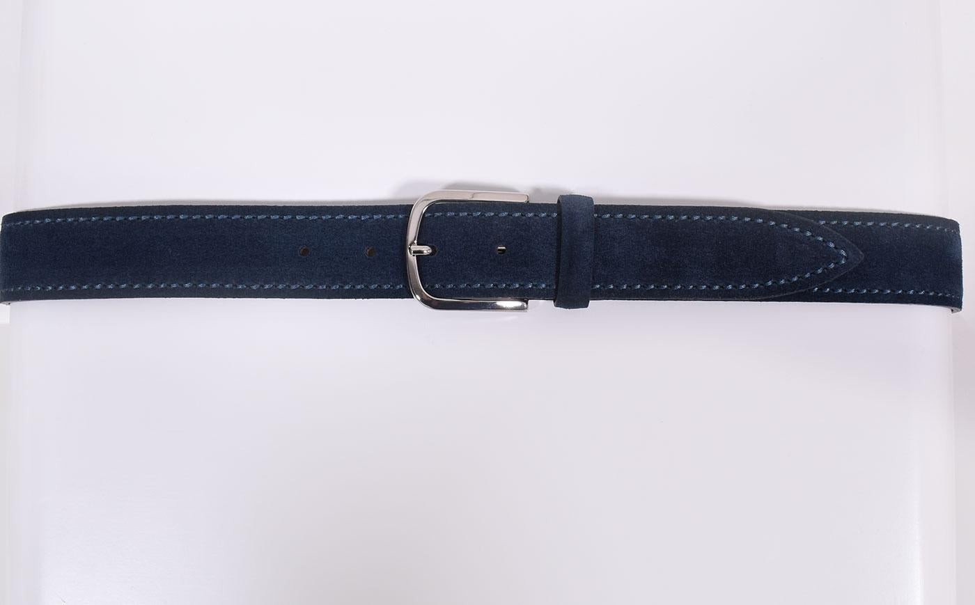 Cintura in pelle scamosciata colore blu notte, fibbia in nichel. Larghezza 3,5 cm. Made in Italy.