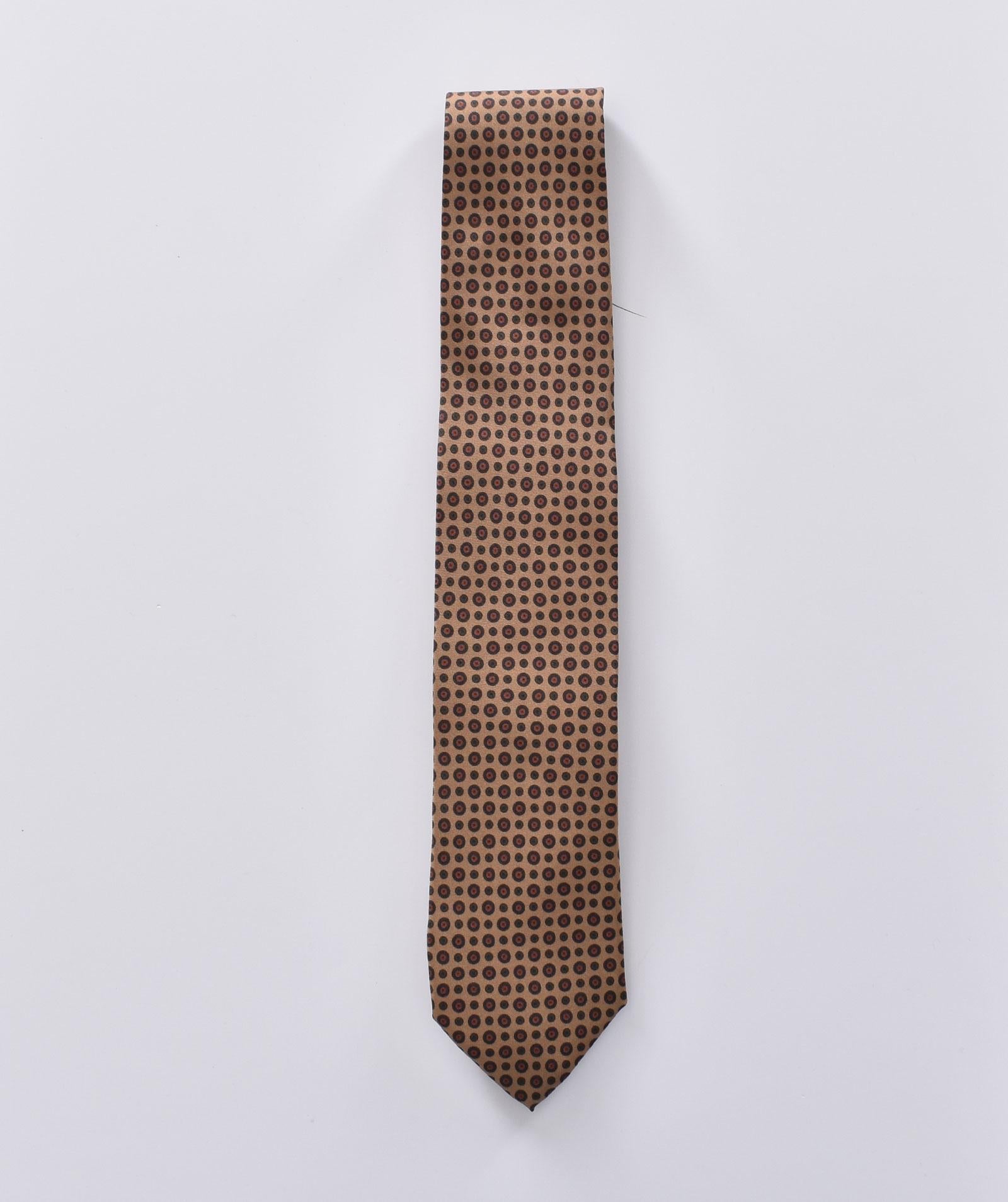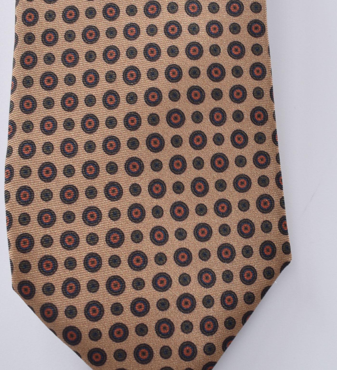 Cravatta in 100% seta lavorata e foderata a mano, colore sabbia con fantasia cerchi. Larghezza orlo 8 cm. Made in Italy