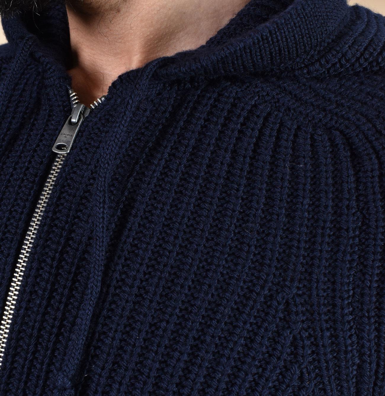 Felpa in maglia lavorazione spessa, colore blu notte, cappuccio regolabile con coulisse e cerniera a doppio cursore. Usabile anche come giubbino. Vestibilità slim. Tessuto morbido e soffice, non provoca fastidio a contatto con la pelle. Composizione 100% lana. Made in Italy. Collezione Autunno/Inverno 2026