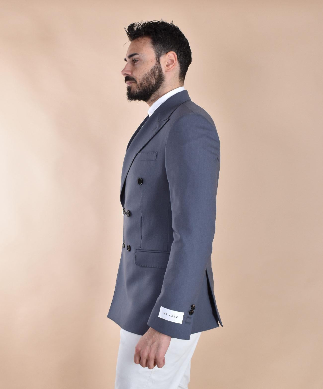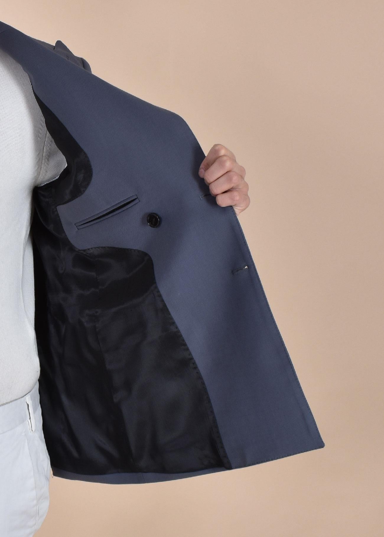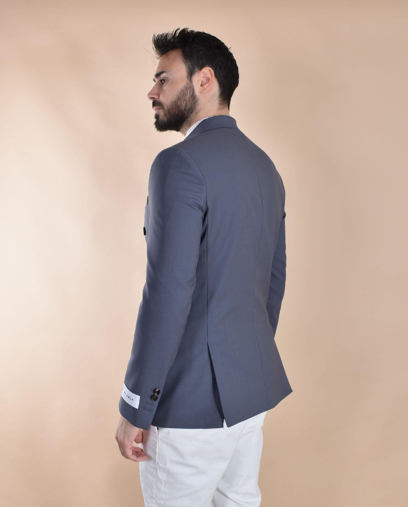 Giacca modello doppiopetto vestibilità slim. Composizione 54% lana vergine, 44% poliestere, 2% elastan. Made in Italy.