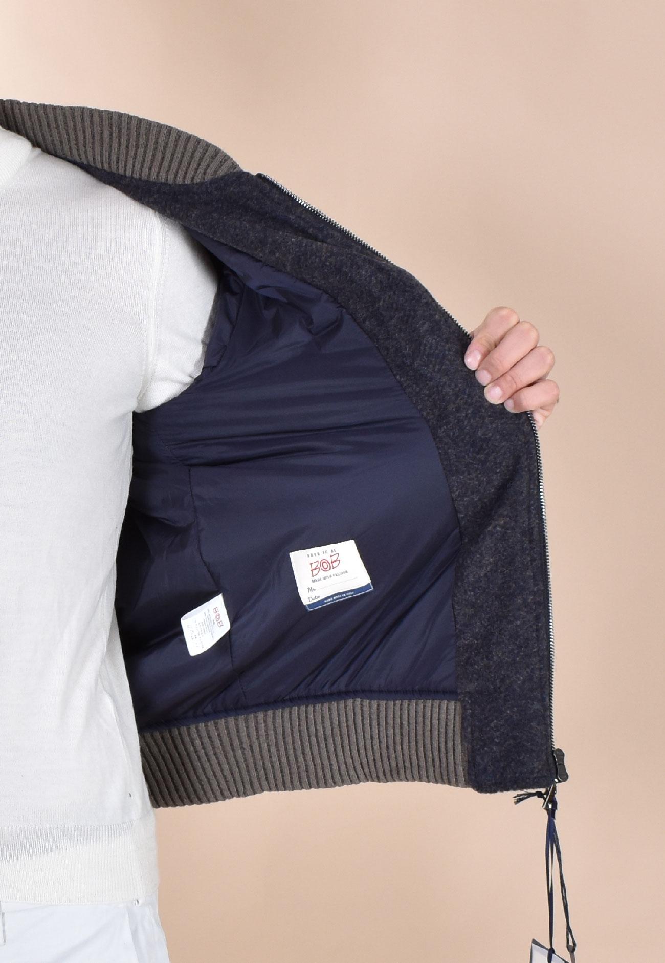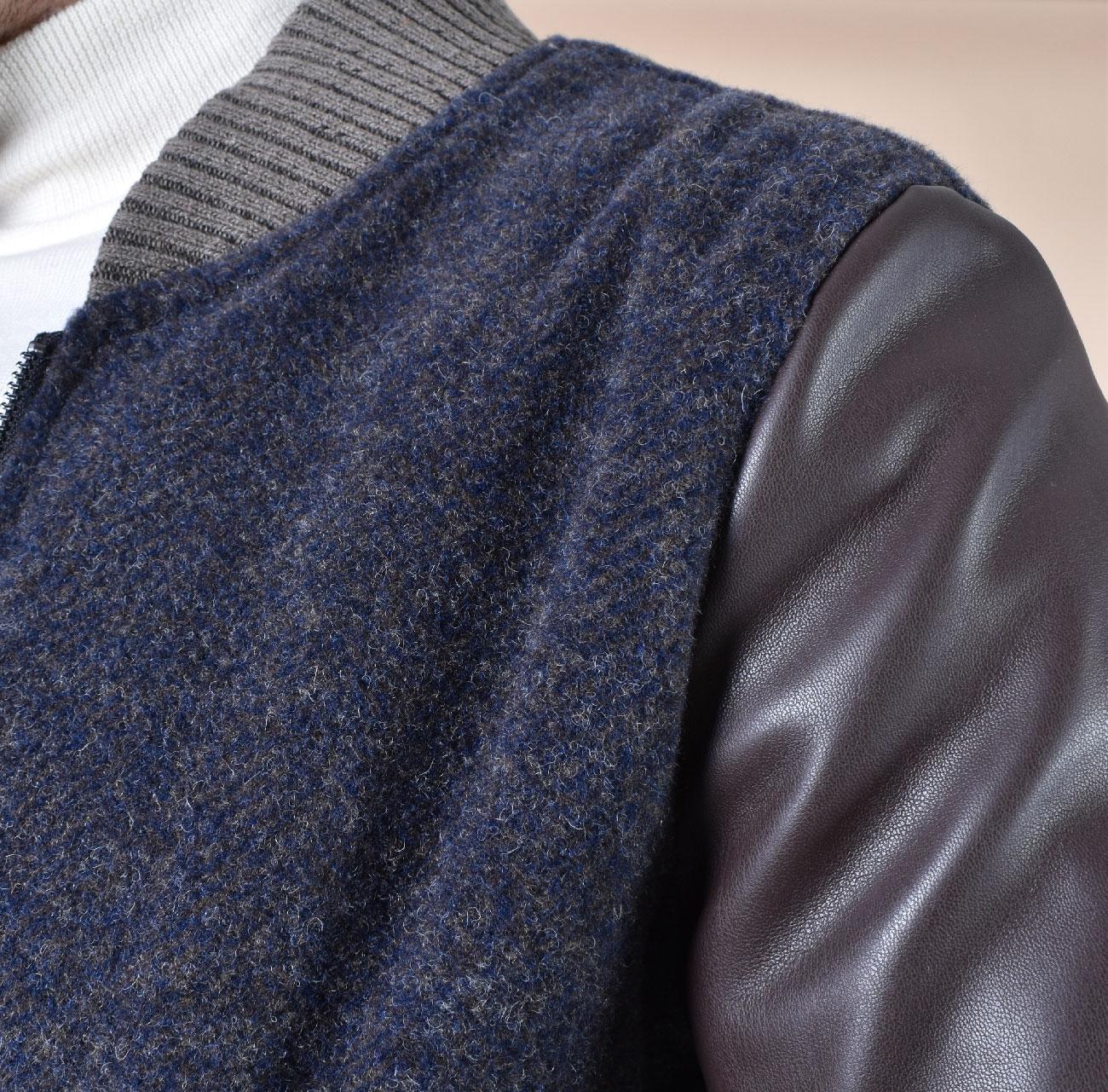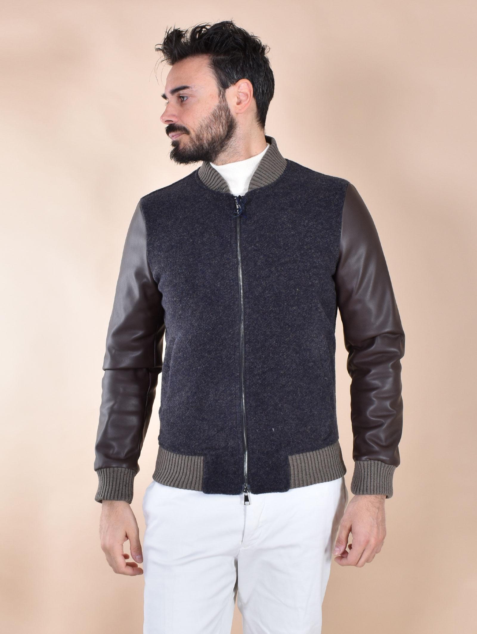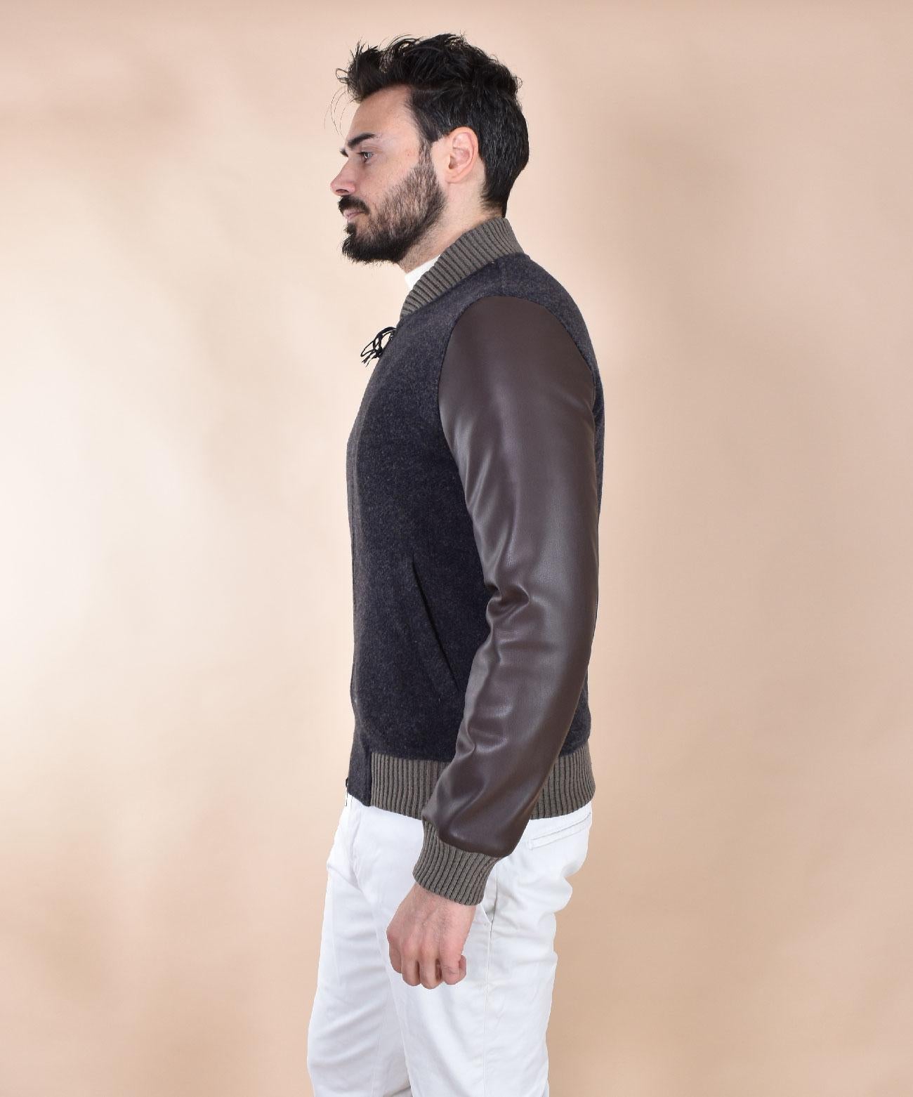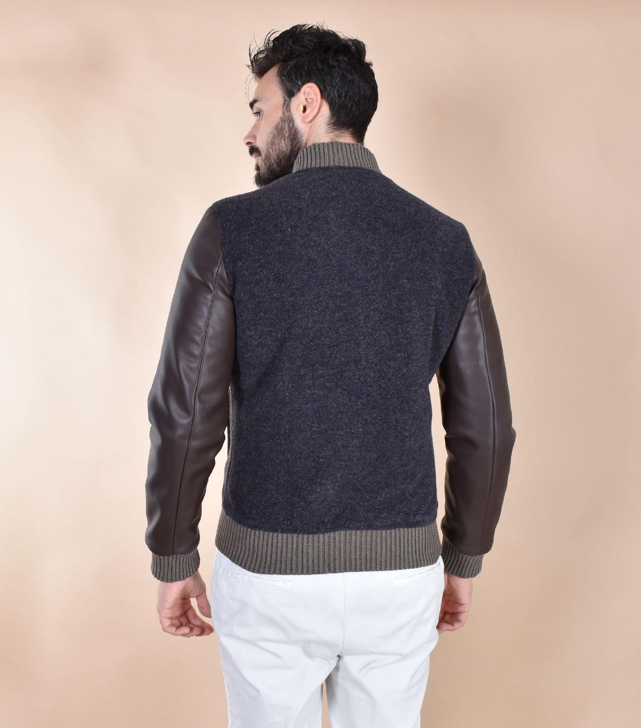 Giubbotto modello college in doppio tessuto, busto in lana vergine e maniche a contrasto in pelle. Colore marrone e blu. Vestibilità slim. Made in Italy.