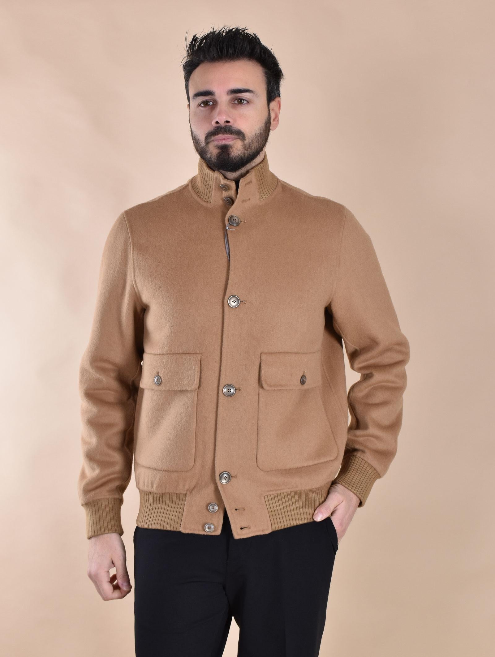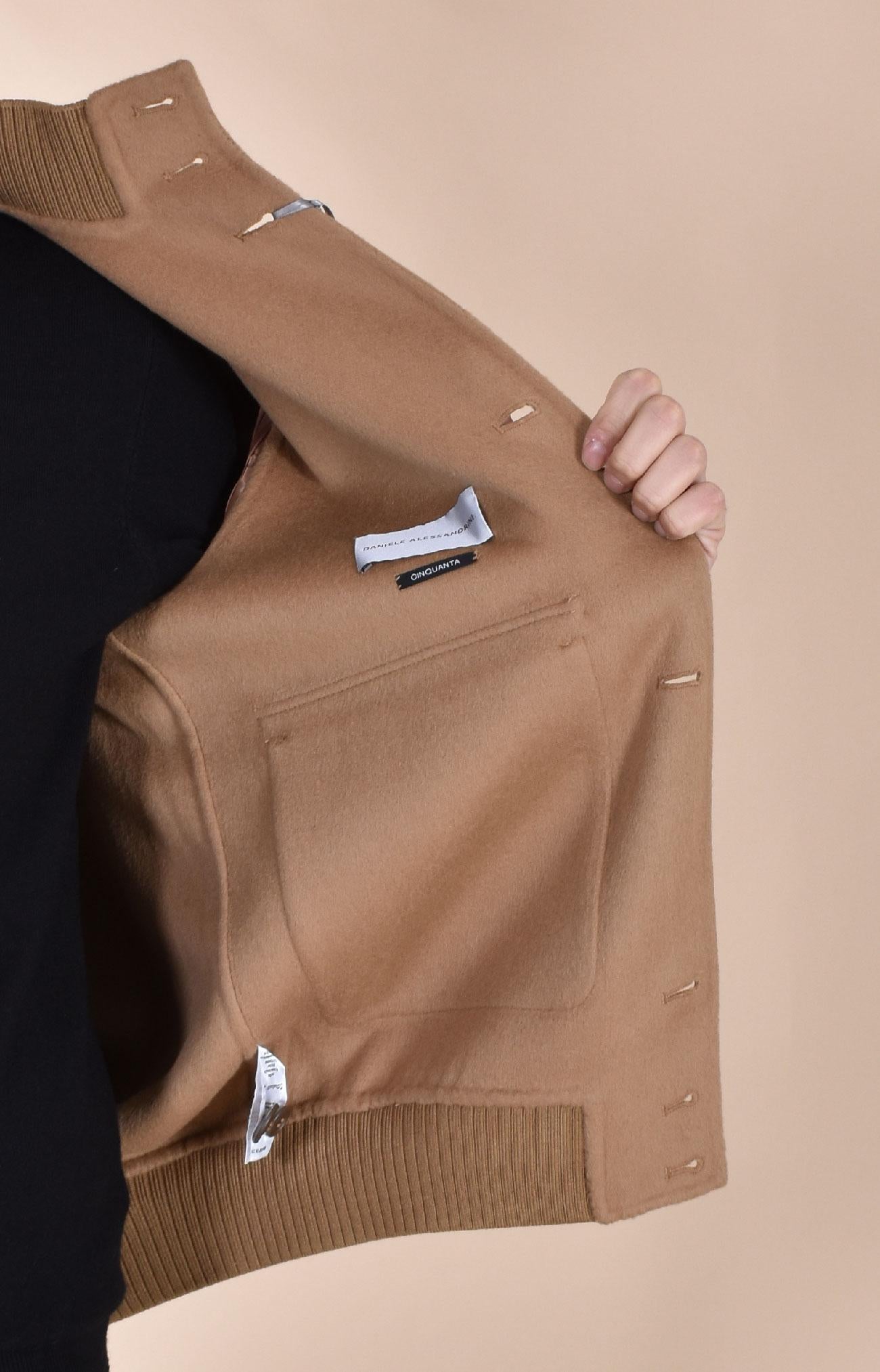Giubbotto modello bomber in lana follata, colore cammello. COmposizione 50% lana, 40% poliestere, 10% altre fibre. Made in Italy.
