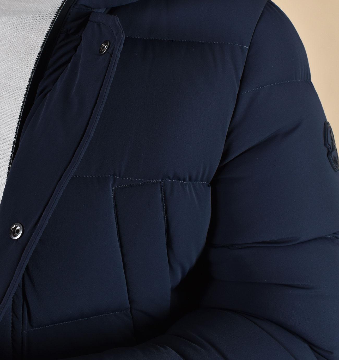 Piumino lungo modello parka imbottito 90% piumino d'anatra, 10% piuma, modello superlight. Colore blu notte. Vestibilità regolare.