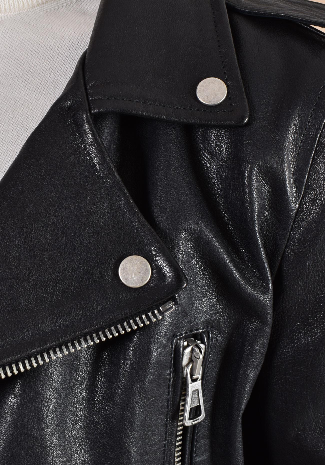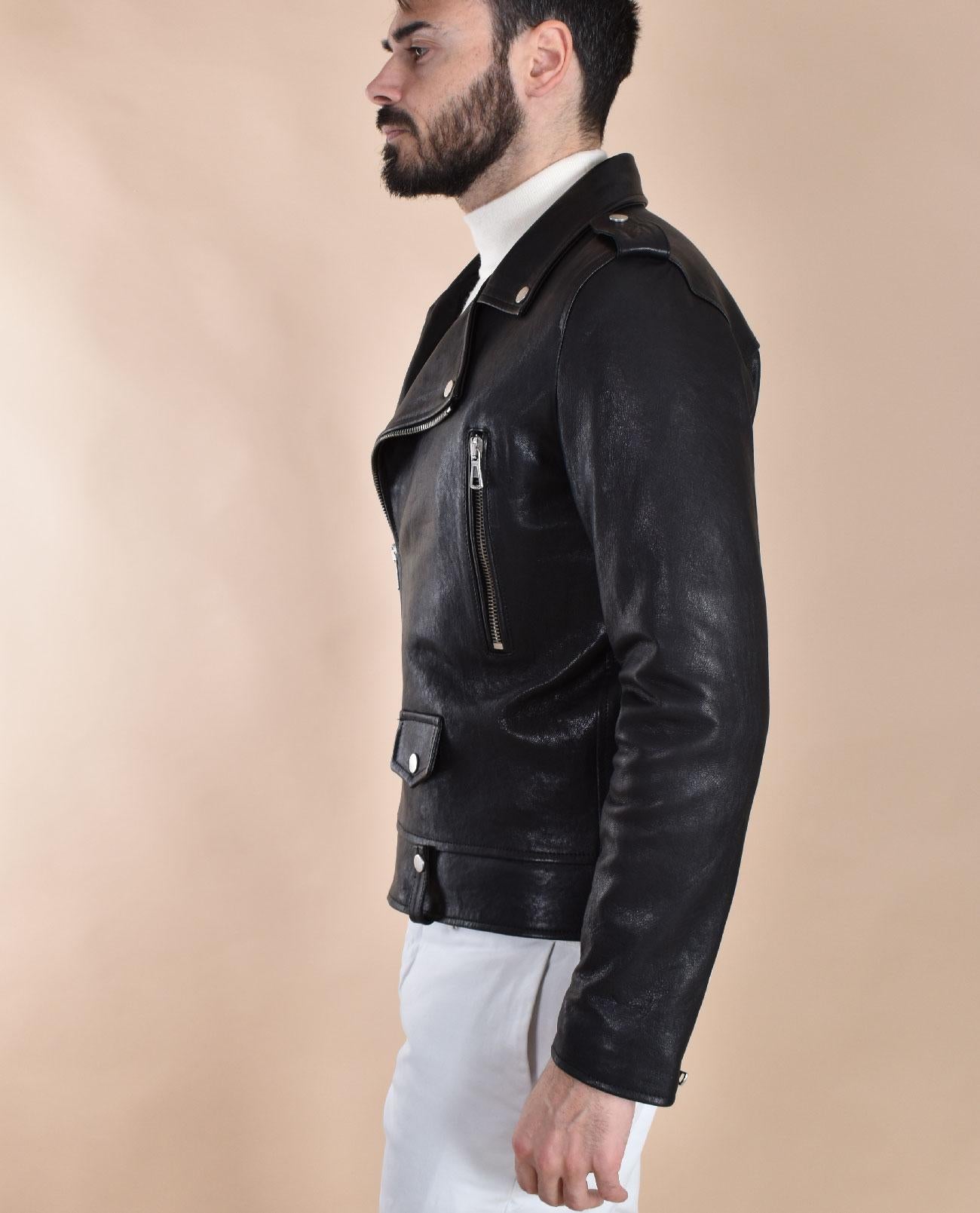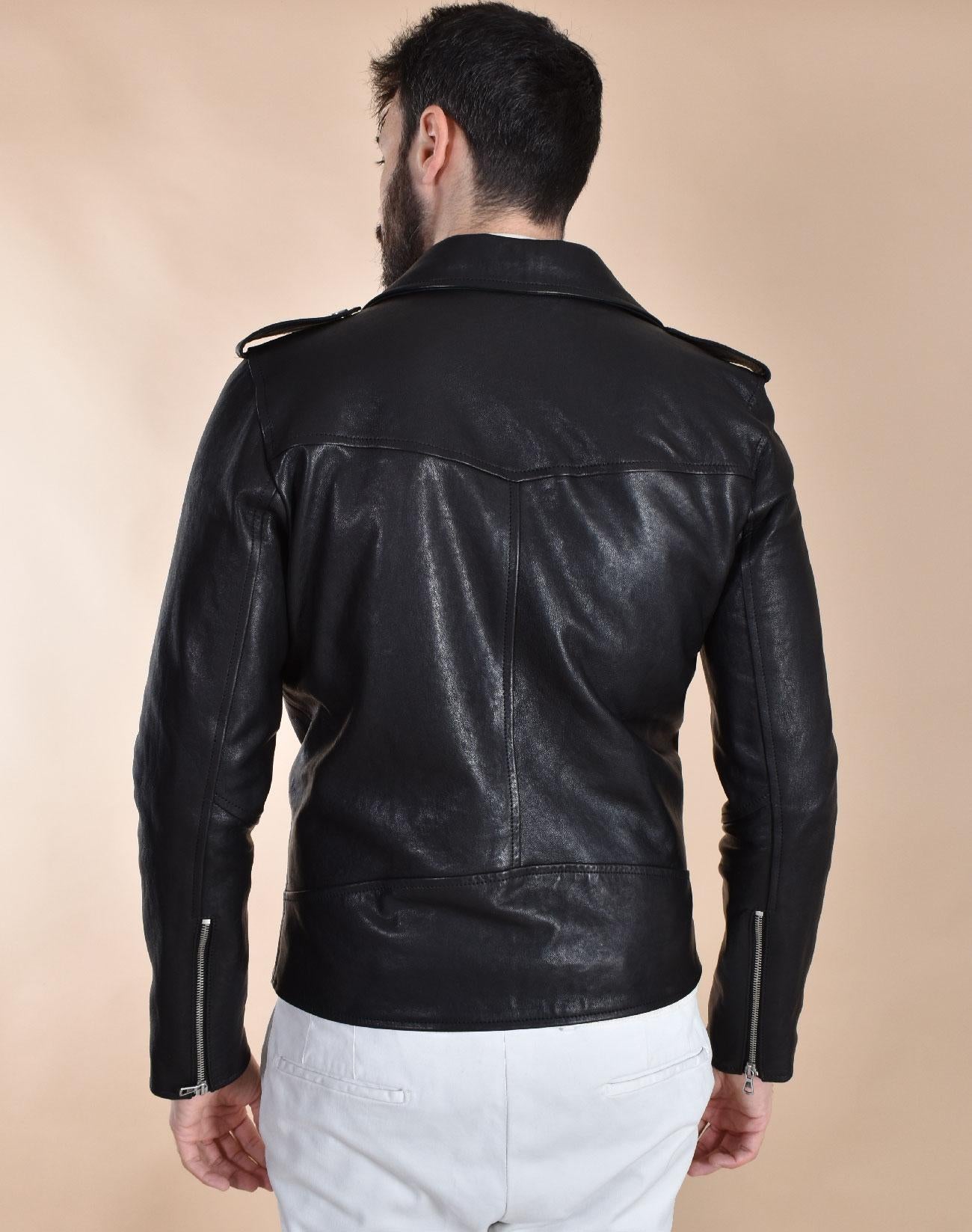 Giubbotto modello chiodo in vera pelle effetto lavato, colore nero, vestibilità slim. Cerniera a doppio cursore.