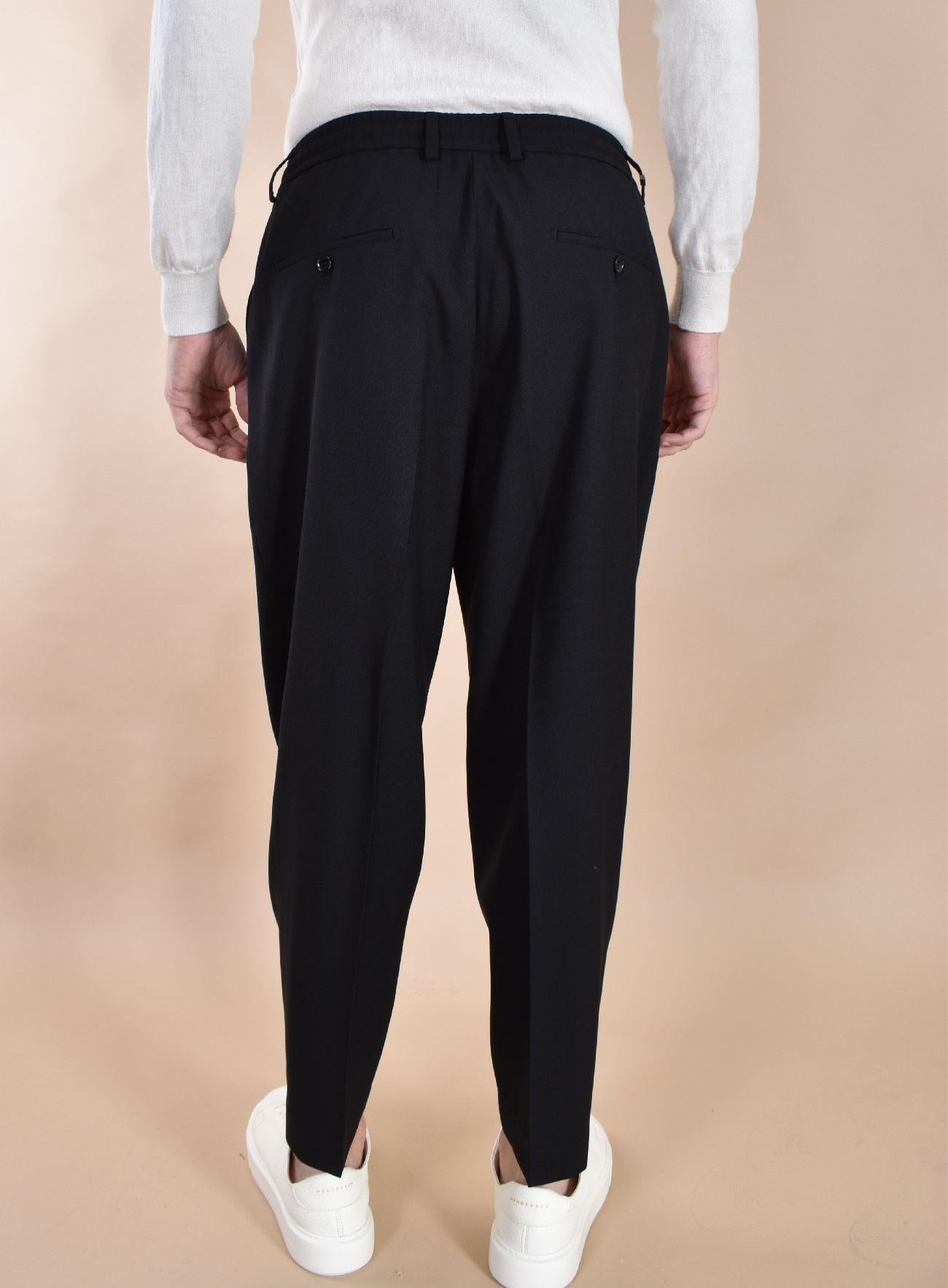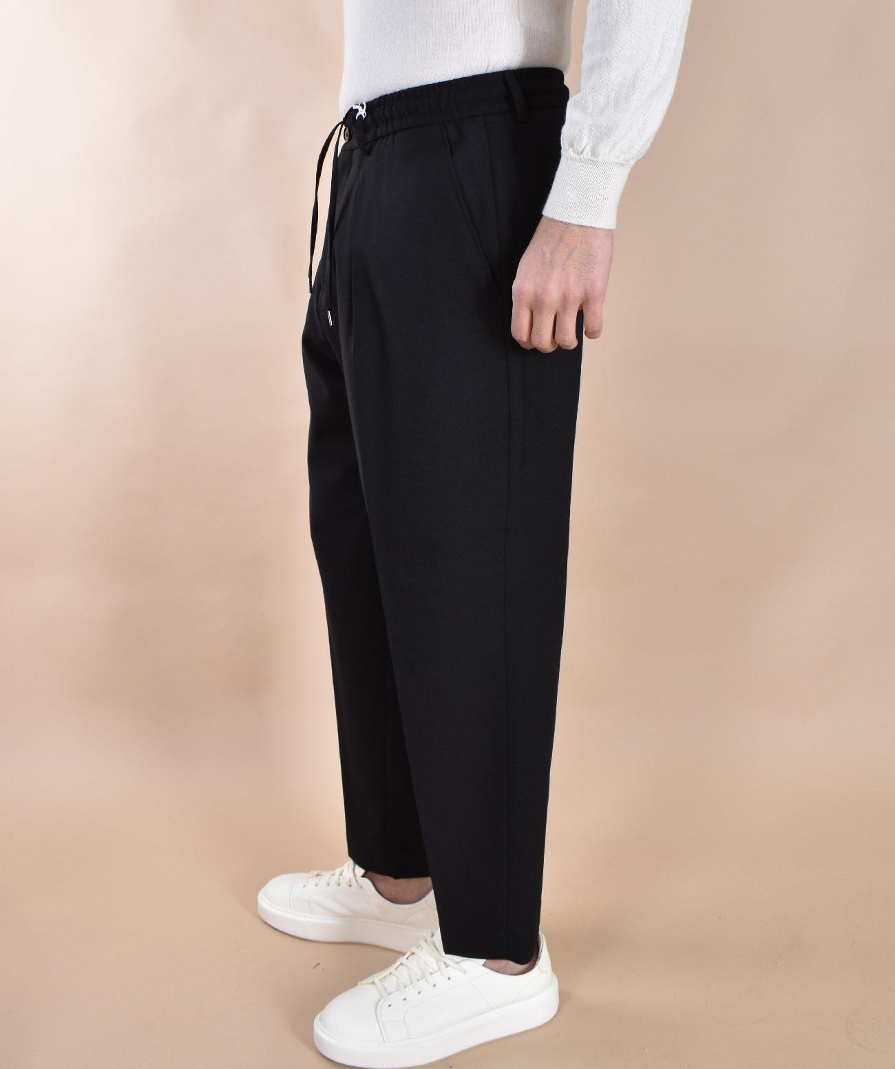 Pantalone tasche america vestibilità larga e corta, colore nero, pinces sul davanti. Chiusura in vita con cerniera e doppio bottone. Elastico sul retro, coulisse regolabile. Composizione 100% lana vergine. Made in Italy.
