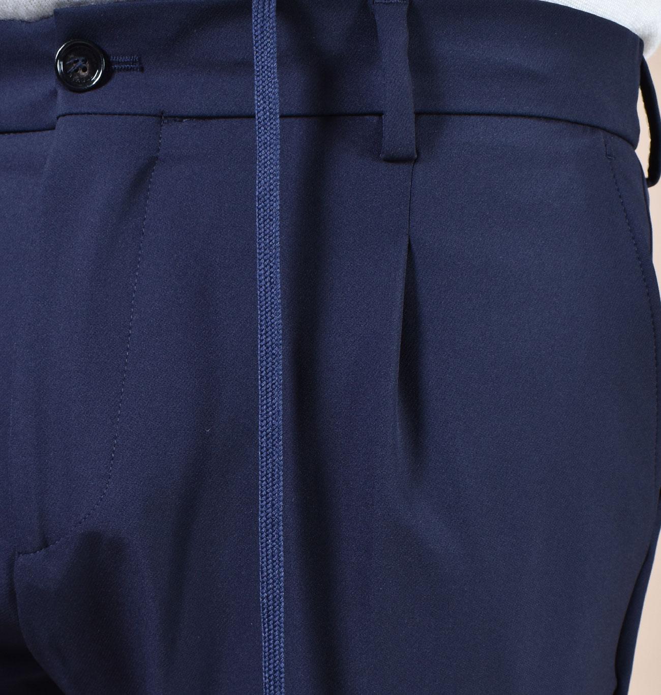 Pantalone vestibilità slim e corta, tasche america, chiusura in vita con cerniera e bottone, con laccio. COlore blu notte. Elastico sul retro. Composizione 88% poliammi,e, 12% elastan. Made in Italy. Collezione Autunno/Inverno 2026