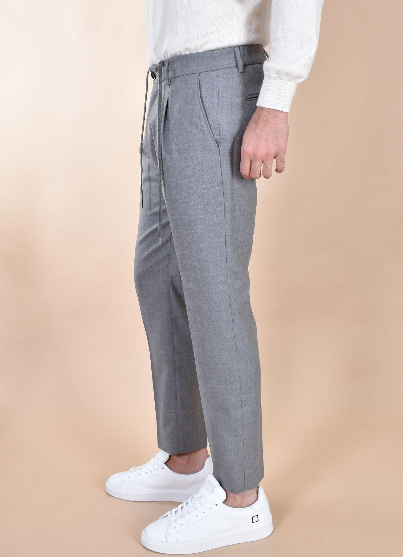 Pantalone tasche america vestibilità slim e corta, colore grigio chiaro. Chiusura in vita con cerniera, doppio bottone, pinces sul davanti. Elastico sul retro. Tessuto 54%lana vergine, 45% poliestere, 1% elastan. Made in Italy. Collezione Autunno/Inverno 2026