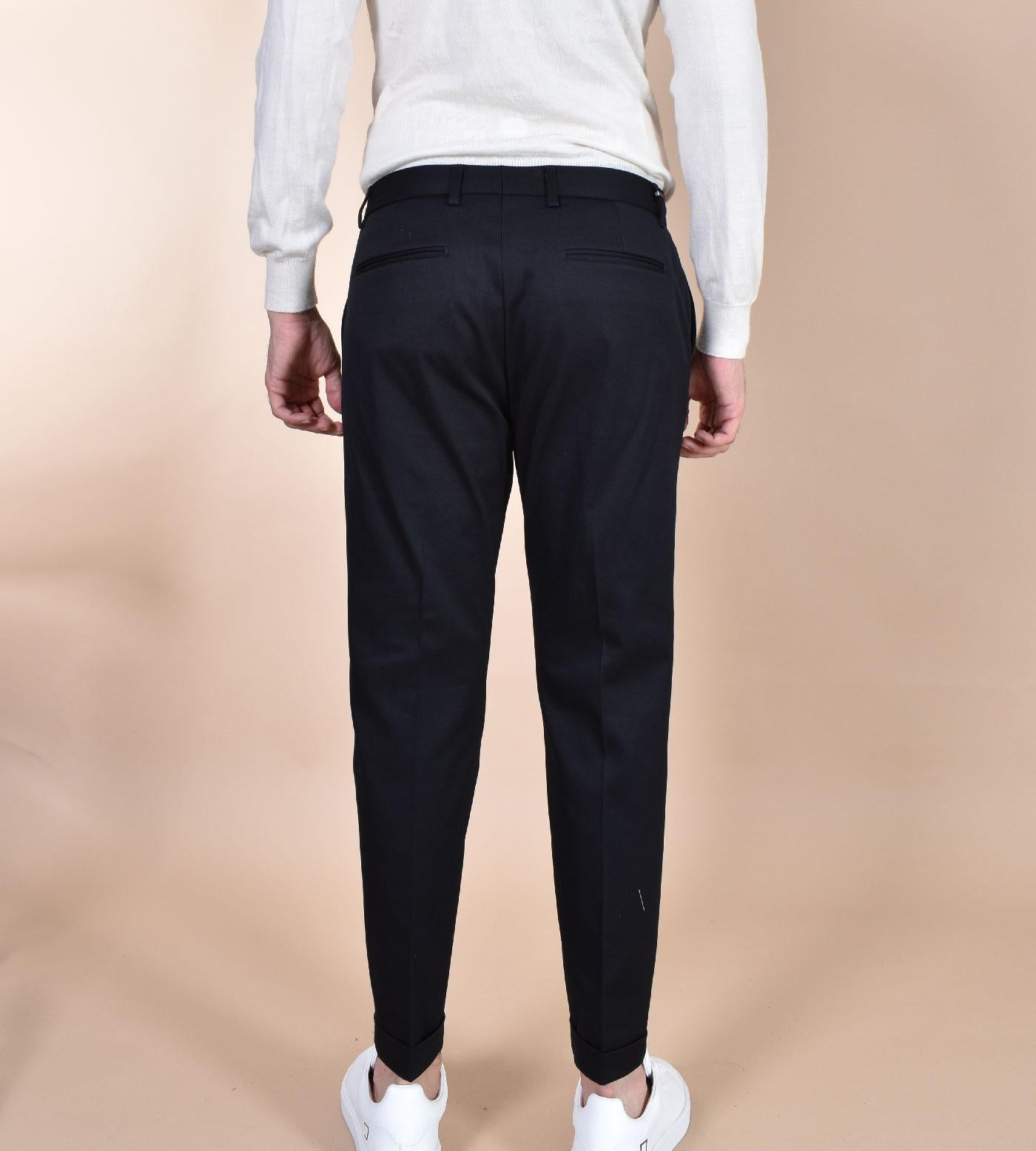 Pantalone tasca america colore nero, vestibilità slim e corta, tessuto twill. Risvoltini cuciti sul fondo. COmposizione 97% cotone, 3% elastan. Made in Italy.