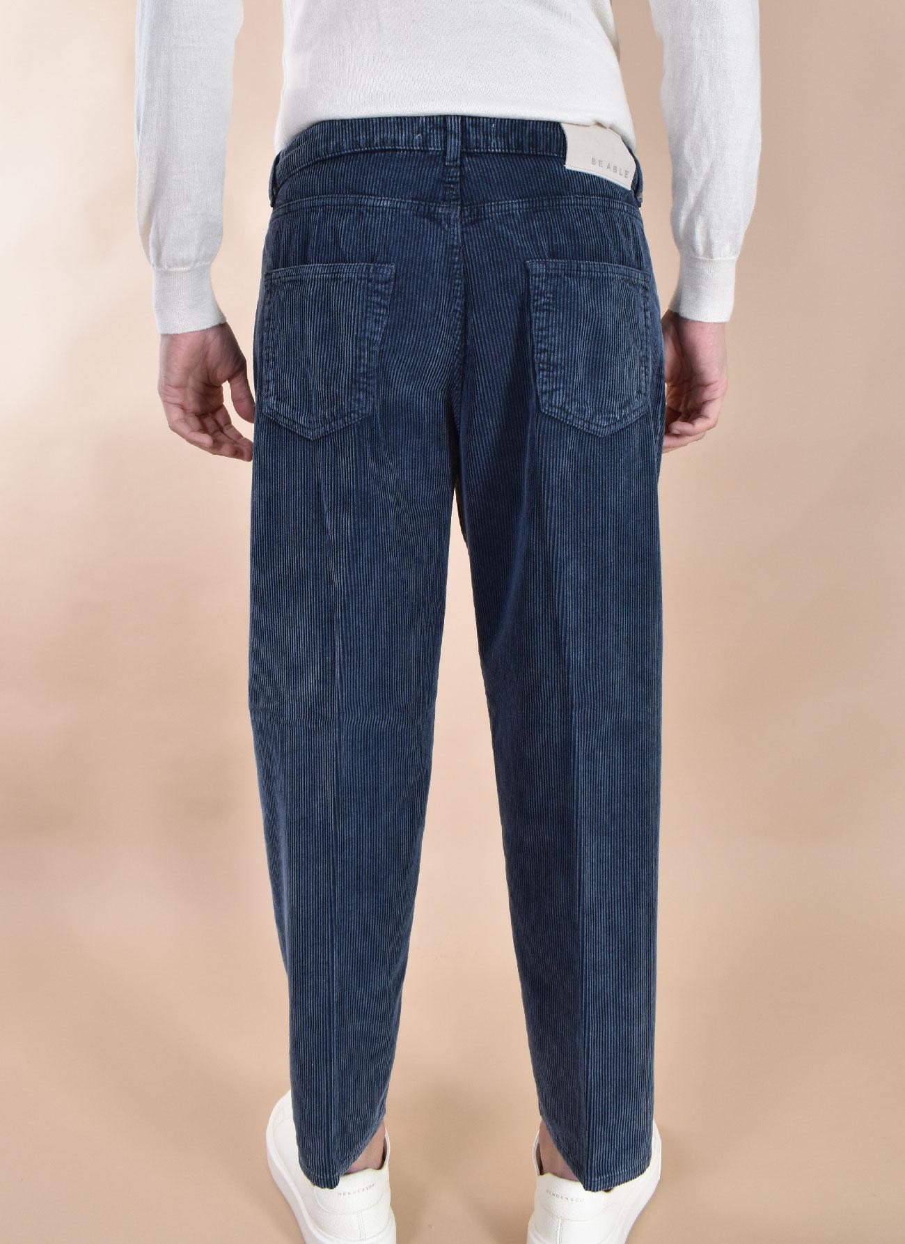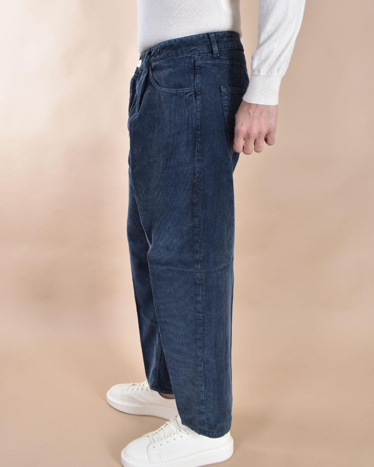 Pantalone in velluto a costine, modello 5 tasche, vestibilità comoda e corta. Colore blu notte. Chiusura in vita a 5 bottoni. Made in Italy.