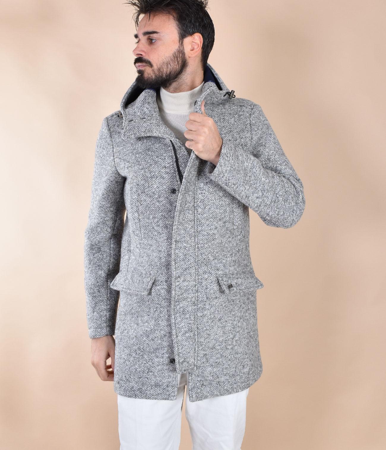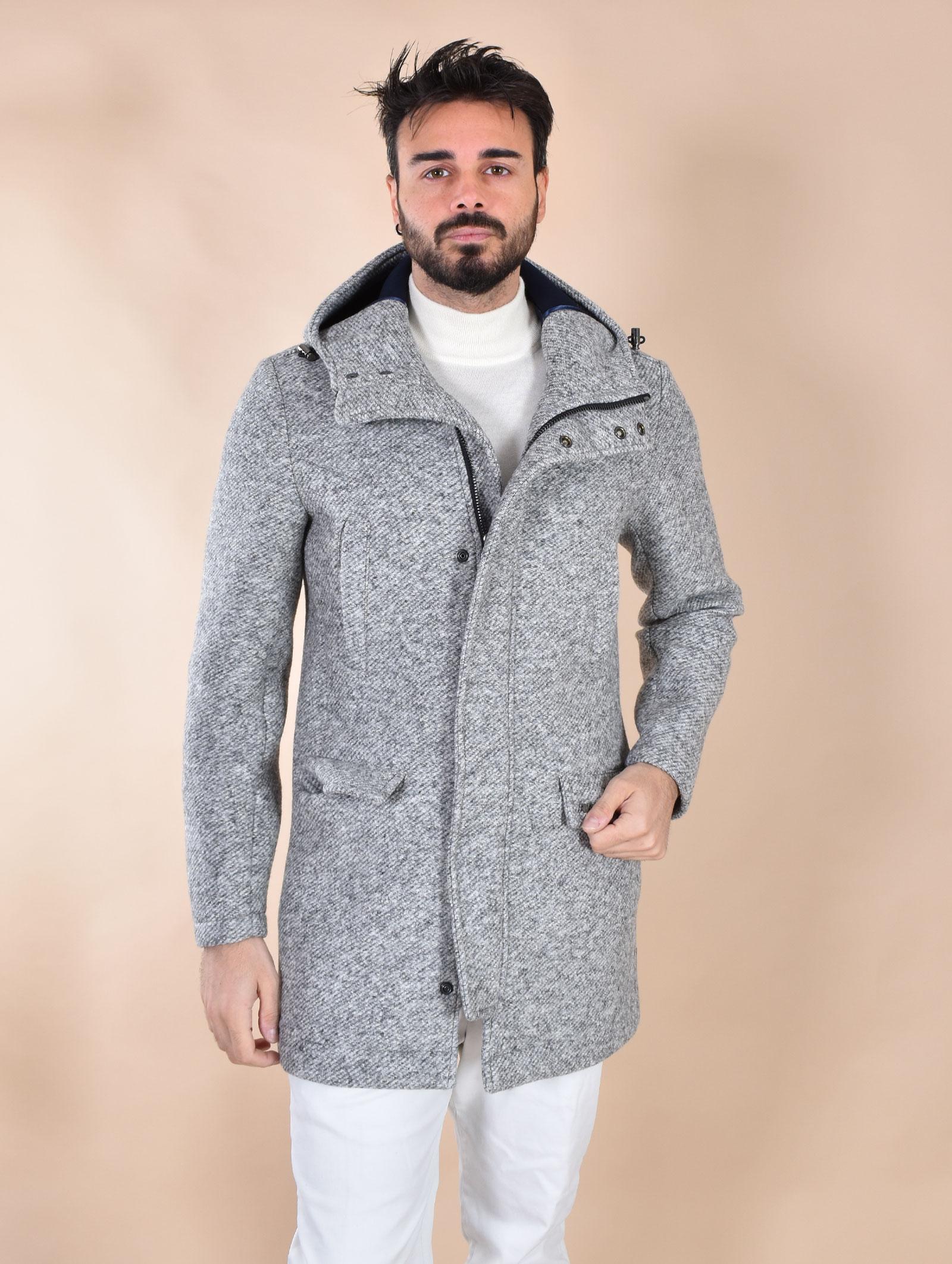 Cappotto con cappuccio vestibilità slim, colore grigio argento, tessuto in panno. Chiusura con cerniera a doppio cursore e bottini a pressione. Tasche a filo con patta. Composizione 56% poliestere, 21% cotone, 21% lana vergine, 2% elastan. Made in Italy. Collezione Autunno/Inverno 2026 Il modello in foto è alto 1.80 x 81 kg, veste taglia 50