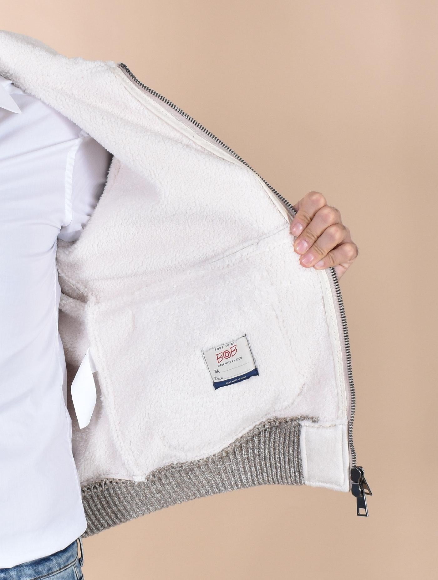 Giubbotto eco-pelle scamosciata colore bianco panna con colletto in pelliccia, maniche in magia a contrasto beige. Chiusura con cerniera in metallo a doppio cursore. Made in Italy.