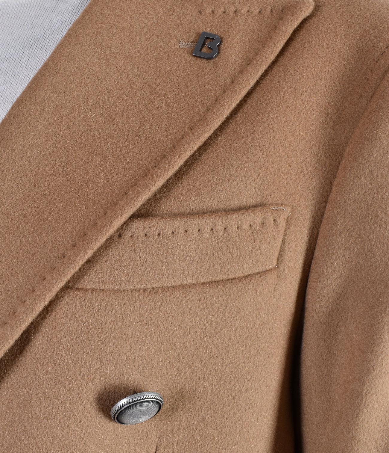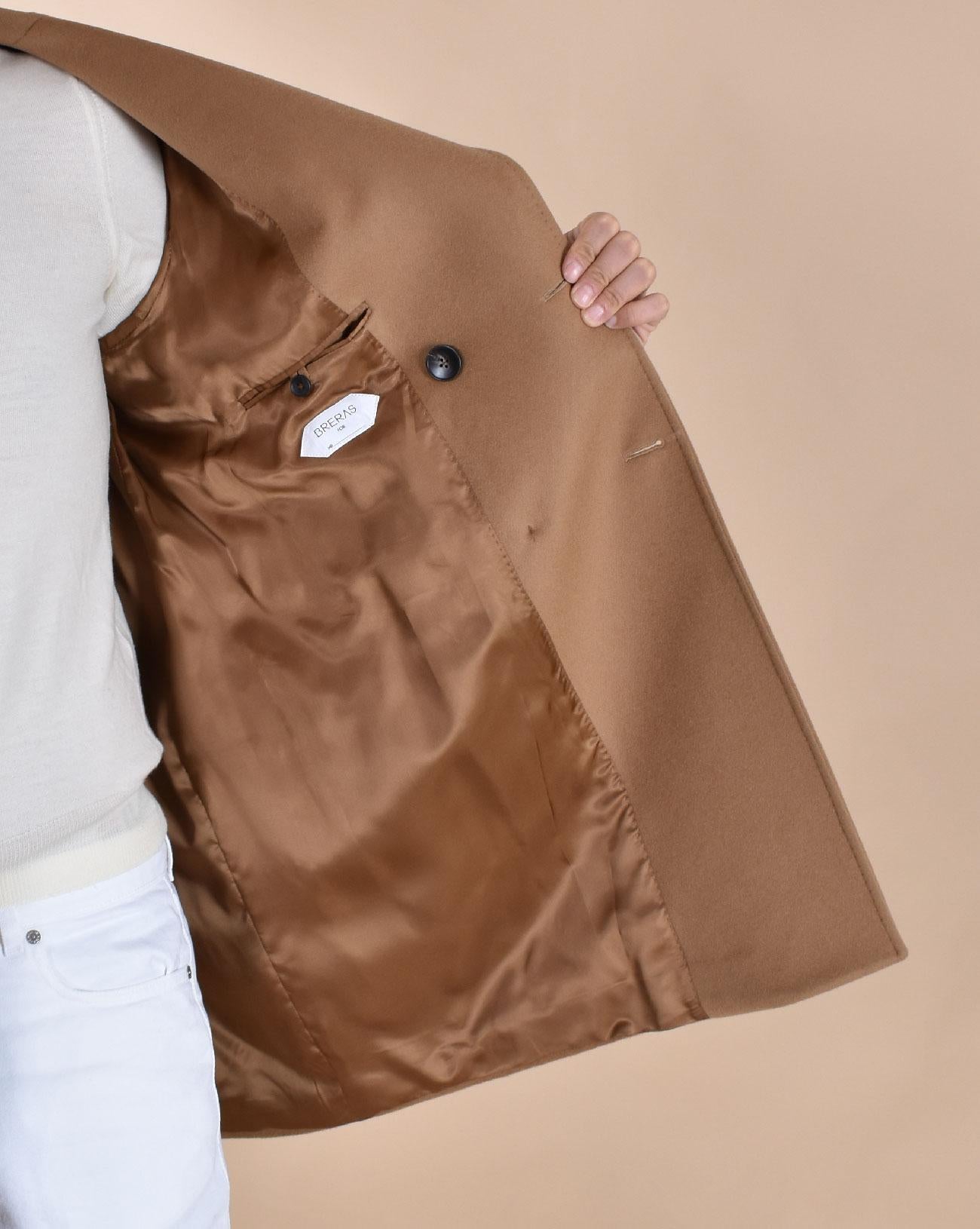 Cappotto in morbida lana modello doppiopetto colore cammello, vestibilità slim. Tasche a toppa con patta, martingala sul retro, bottoni in metallo. composizione 70% lana, 20% poliammide, 10% cashmere. Made in italy.