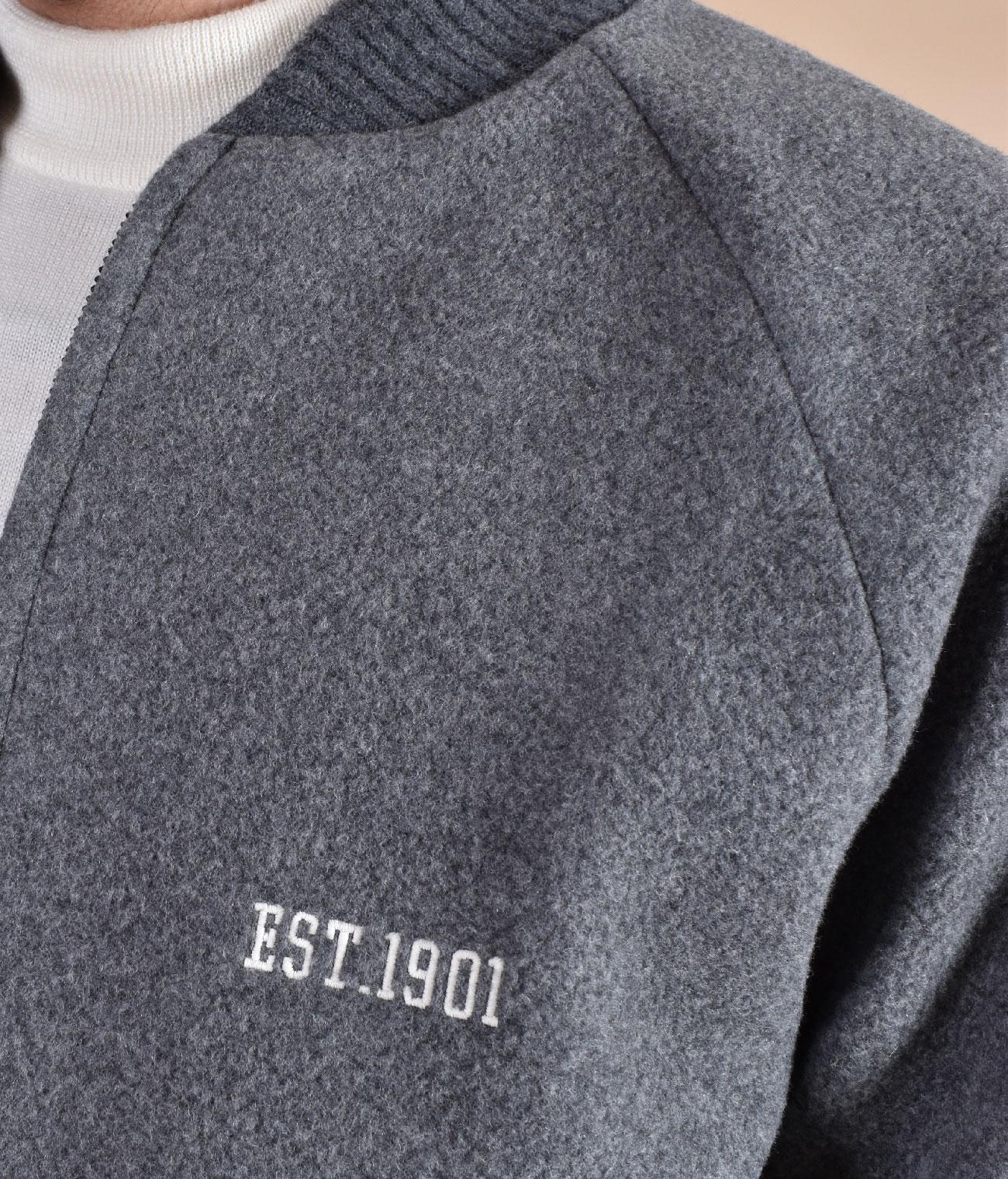 Bomber modello college in lana colore grigio, vestibilità slim. Composizione 90% lana, 10% cashmere. Patch con scritta Humans sul retro. Made in Italy. Collezione Autunno/Inverno 2026 Il modello in foto è alto 1.80 x 81 kg, veste taglia L