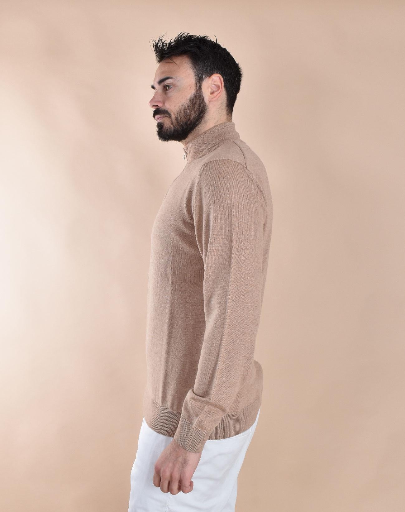Maglia modello lupetto con apertura a cerniera, in lana rasata color cammello. Vestibilità slim. Tessuto morbido e soffice, non provoca fastidio a contatto con la pelle. Composizione 100% lana merino extrafine. Made in Italy.