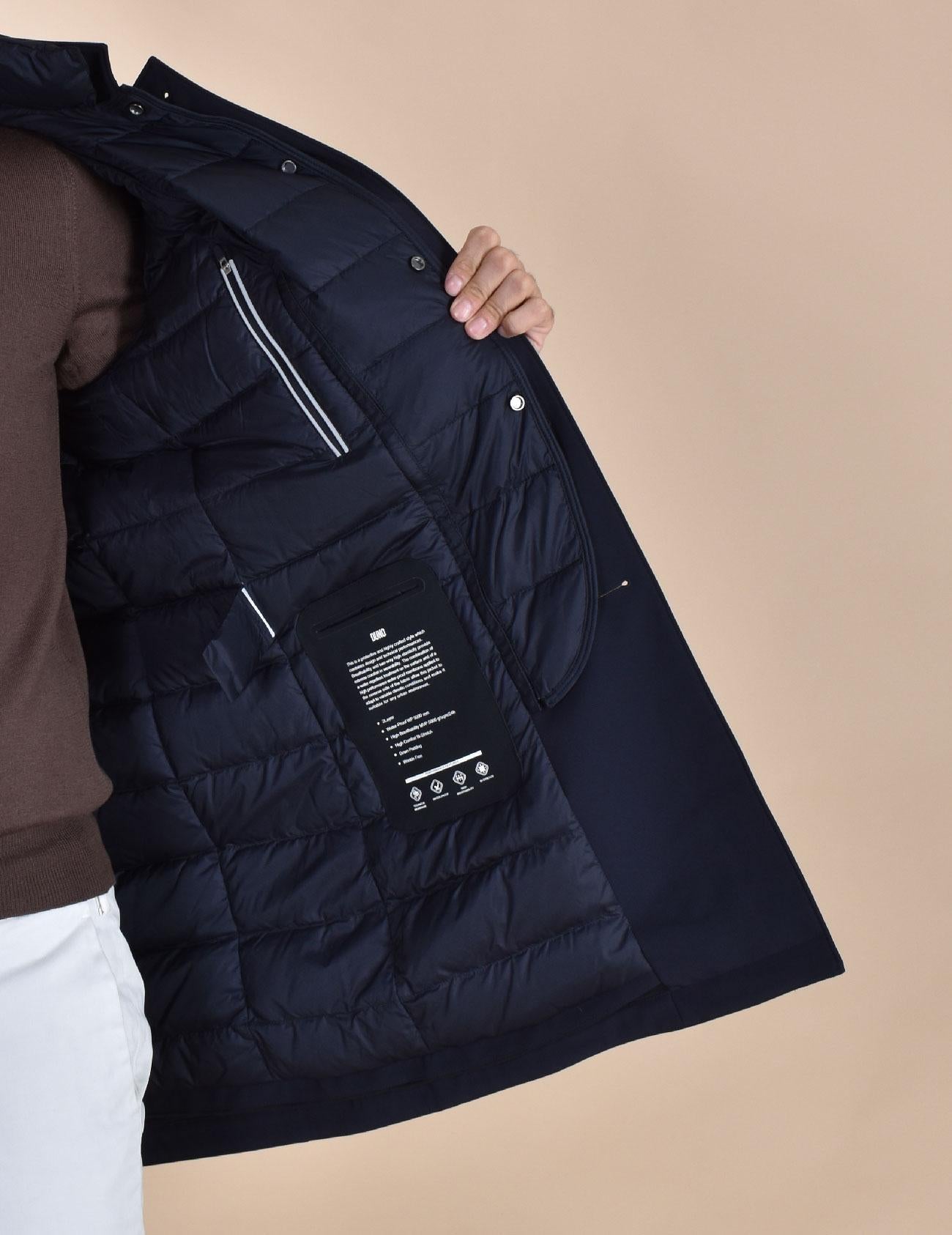 Giubbotto modello parka coreano lungo trapuntato, vestibilità regolare, con pettorina interno removibile tramite zip. Tessuto bi-stretch antivento resistente alla pioggia. Chiusura a bottoni e zip, collo coreano con cinturino. Colore blu notte. Imbottitura 90% piumino, 10% piuma. Collezione Autunno/Inverno 2026