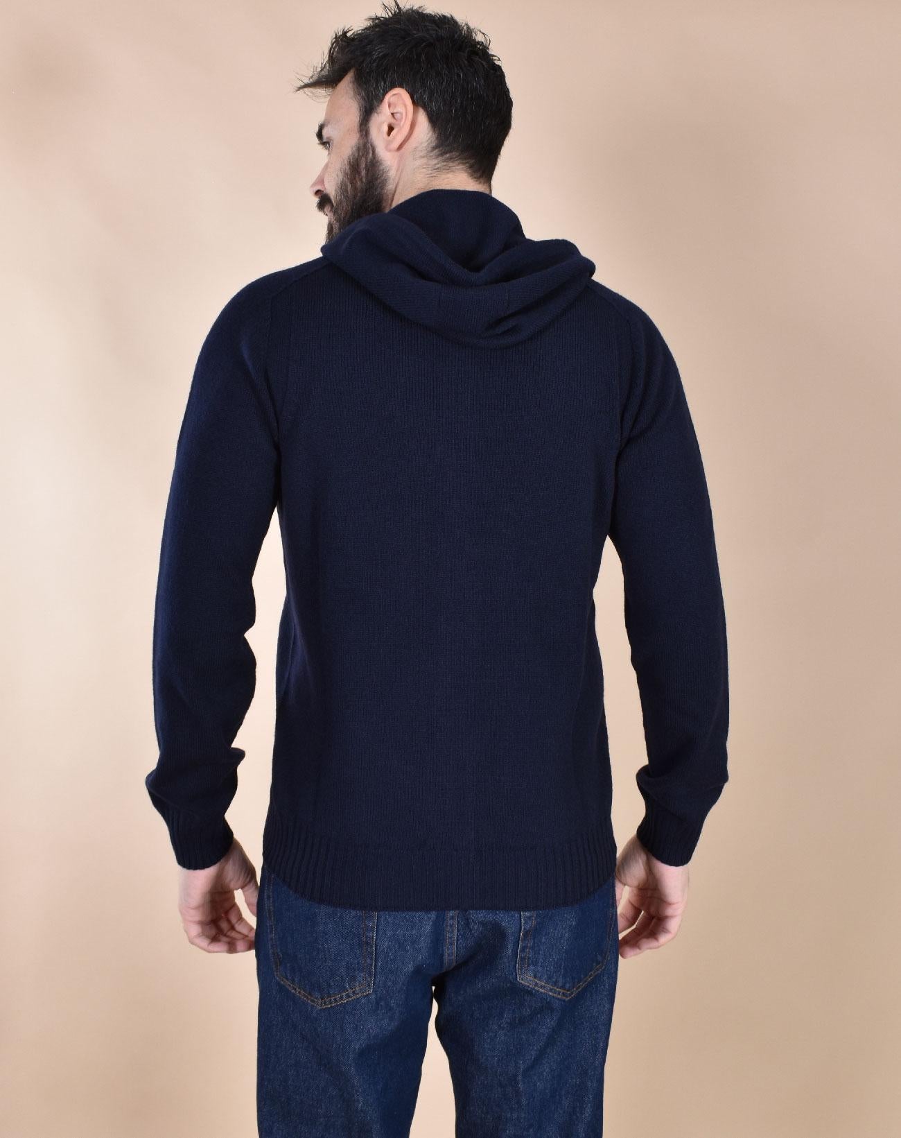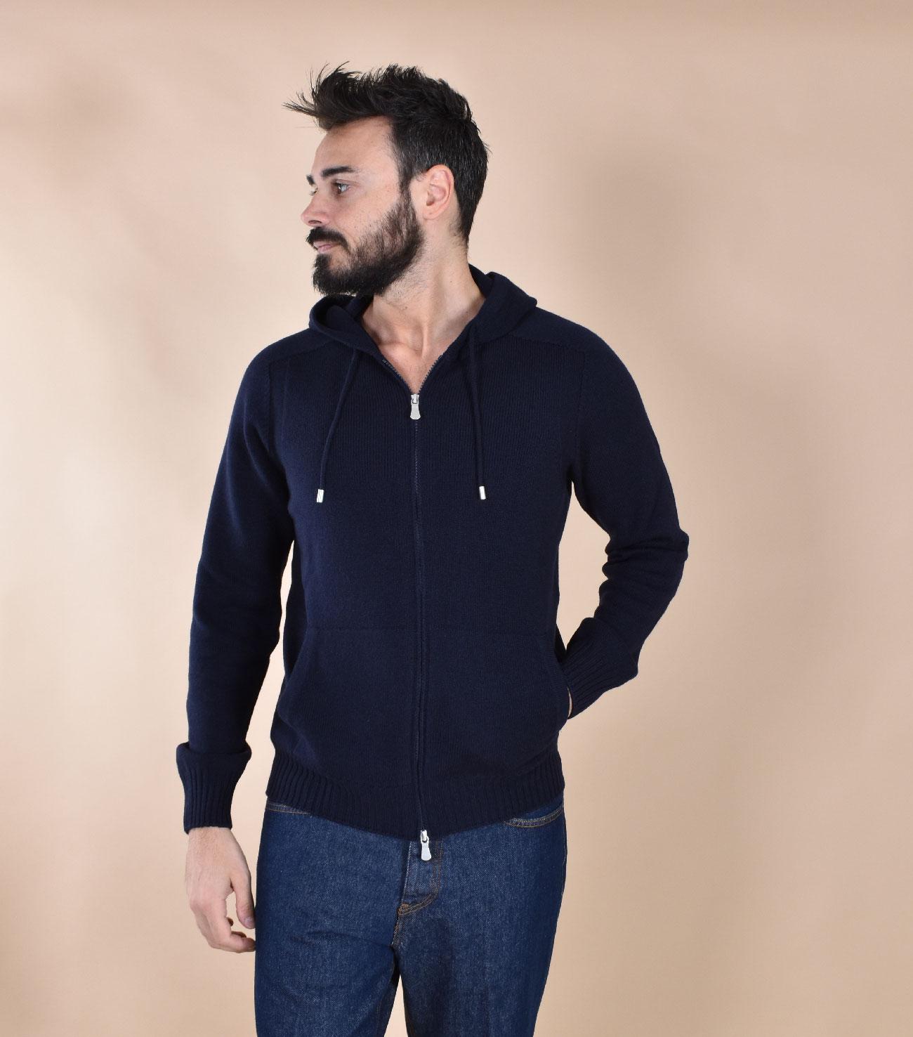 Maglia modello felpa vestibilità regolare in 100% lana vergine ultra soffice, lavorazione Super Geelong. Tessuto morbido e soffice, non provoca pungitura a contatto con la pelle. Colore blu navy, apertura con cerniera a doppio cursore, cappuccio regolabile con coulisse. Made in Italy.