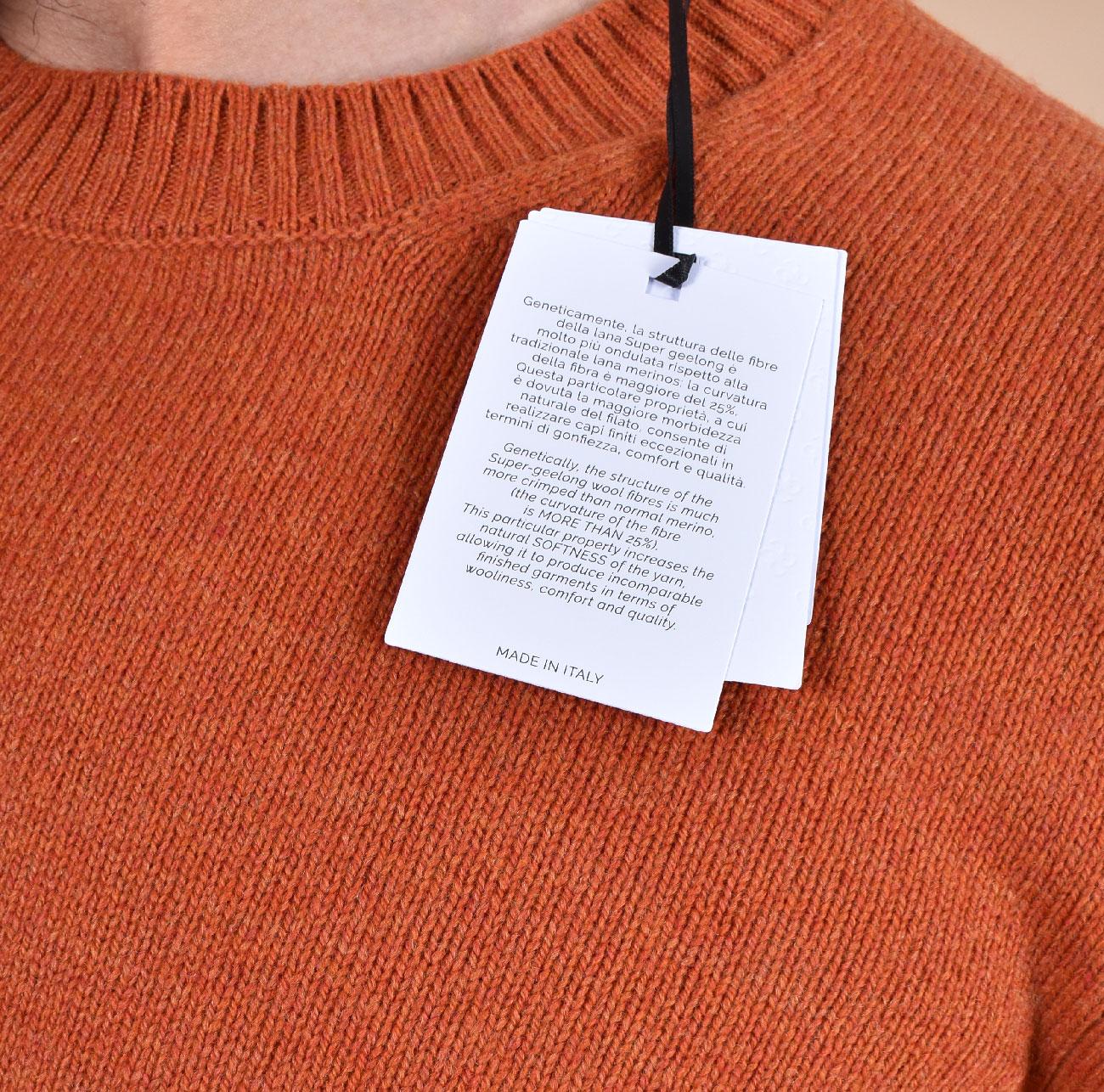 Maglia girocollo colore ruggine, vestibilità regolare, lavorazione Super Geelong con strutture delle fibre più ondulate rispetto alla tradizionale lana merinos, rendendo il capo più morbido e confortevole. 100% lana vergine. Tessuto morbido e soffice, non provoca pungitura a contatto con la pelle. Made in Italy. Collezione Autunno/Inverno 2026