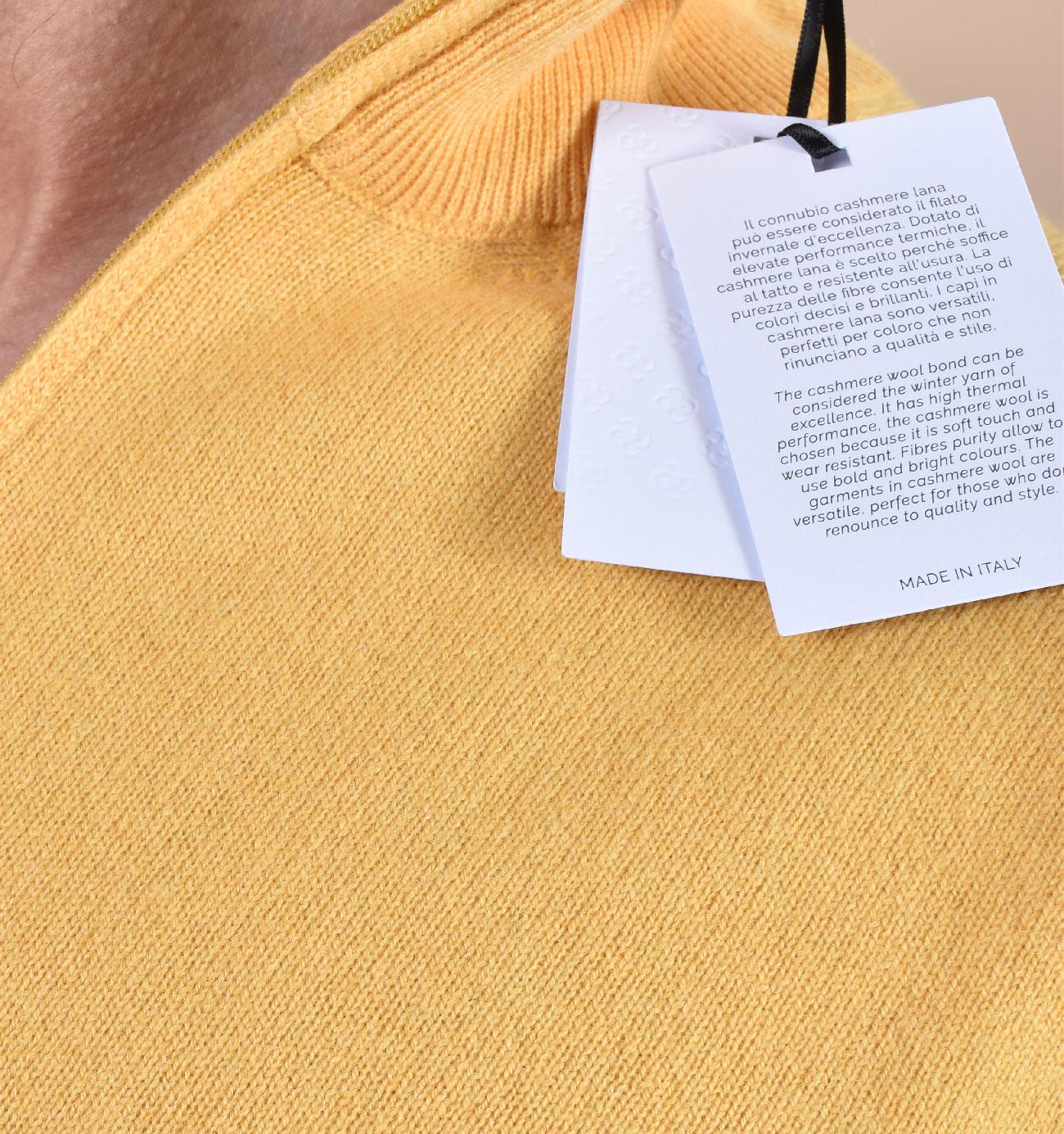 Maglia modello lupetto collo alto con zip, colore ocra. Composizione 80% lana, 10% viscosa, 10% cashmere. Tessuto morbido e soffice, non provoca pungitura a contatto con la pelle. Made in Italy.