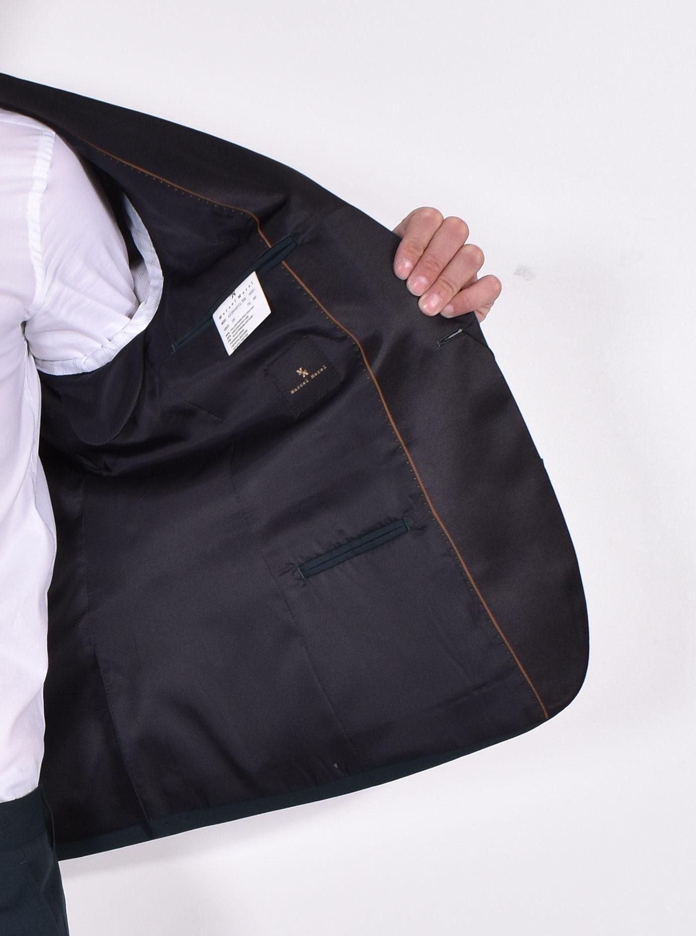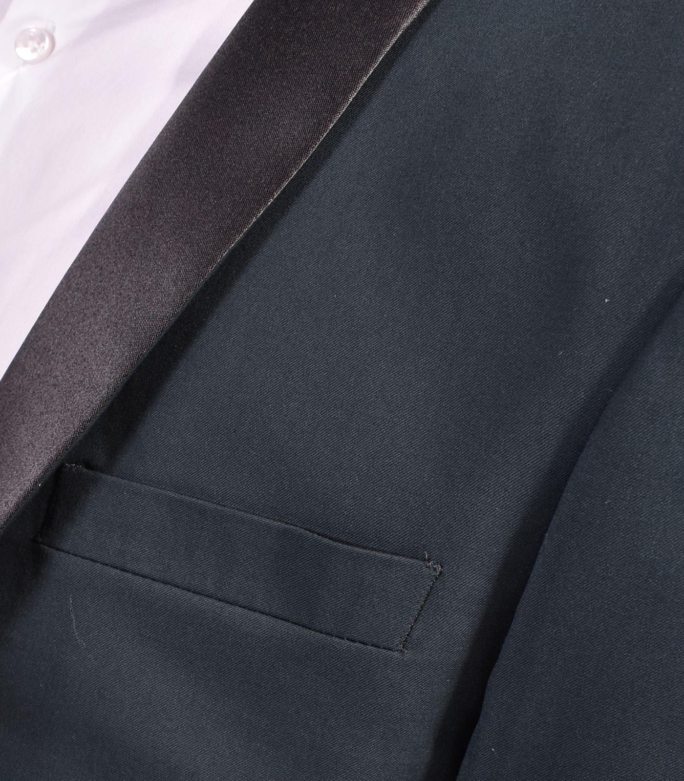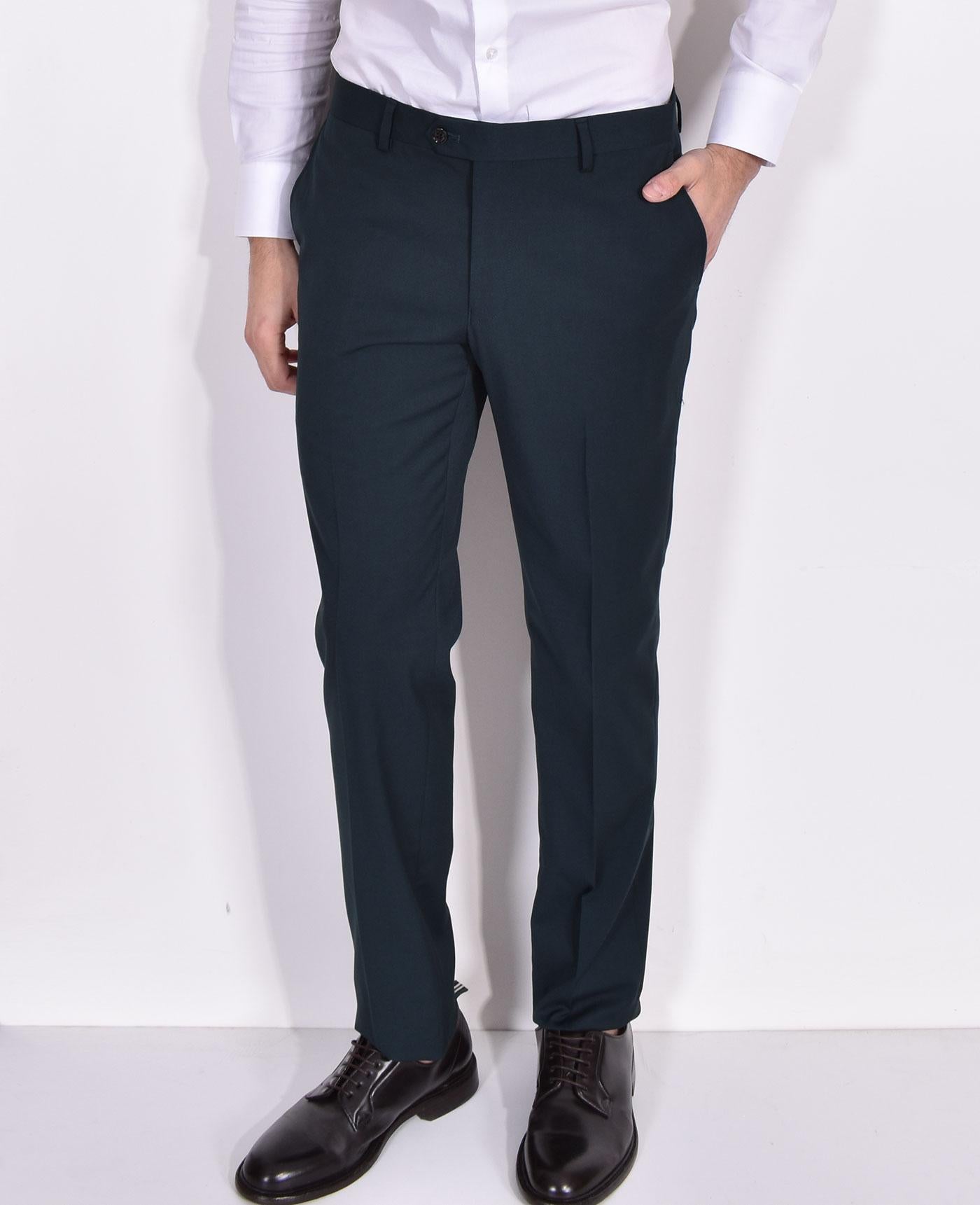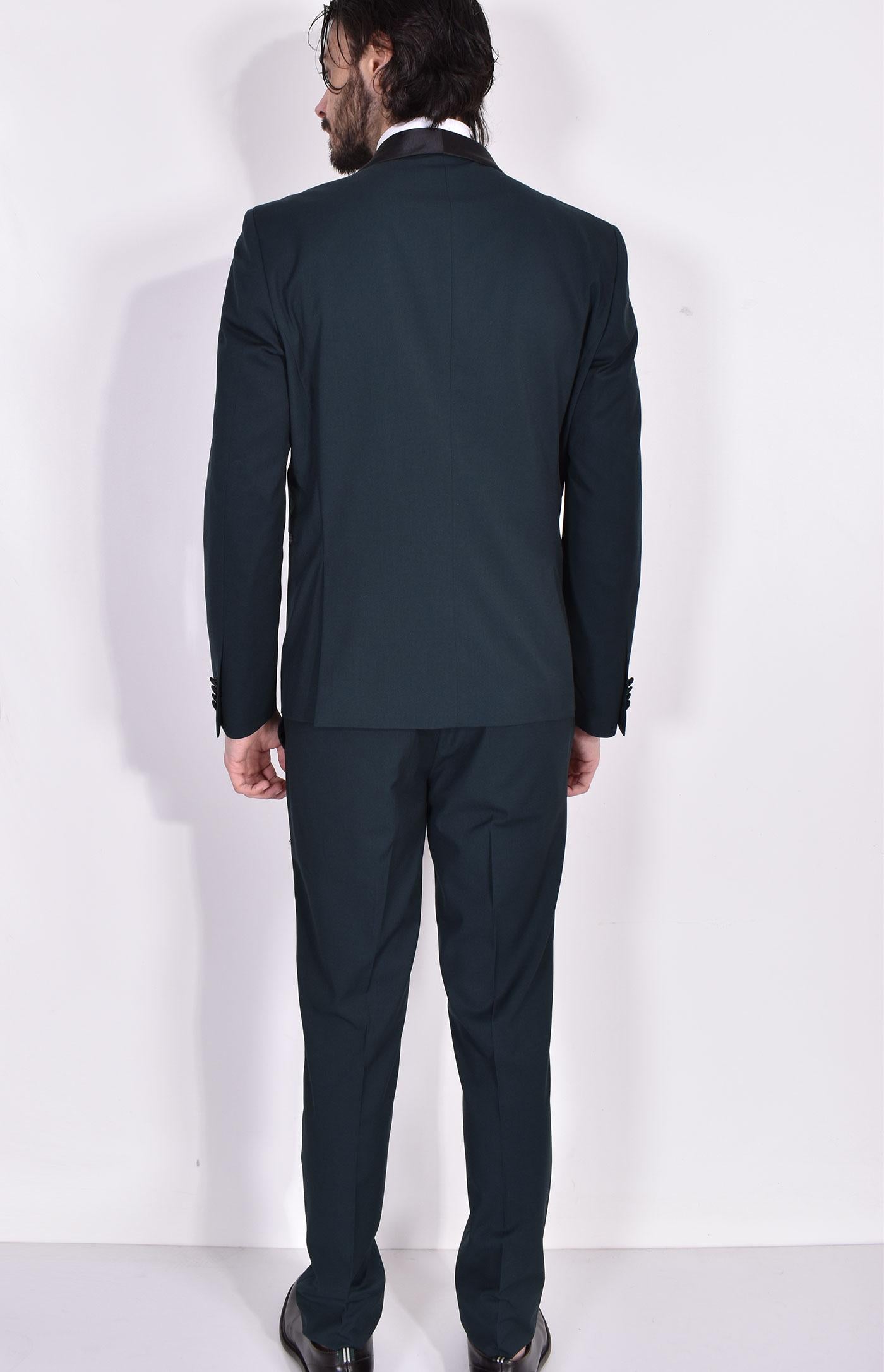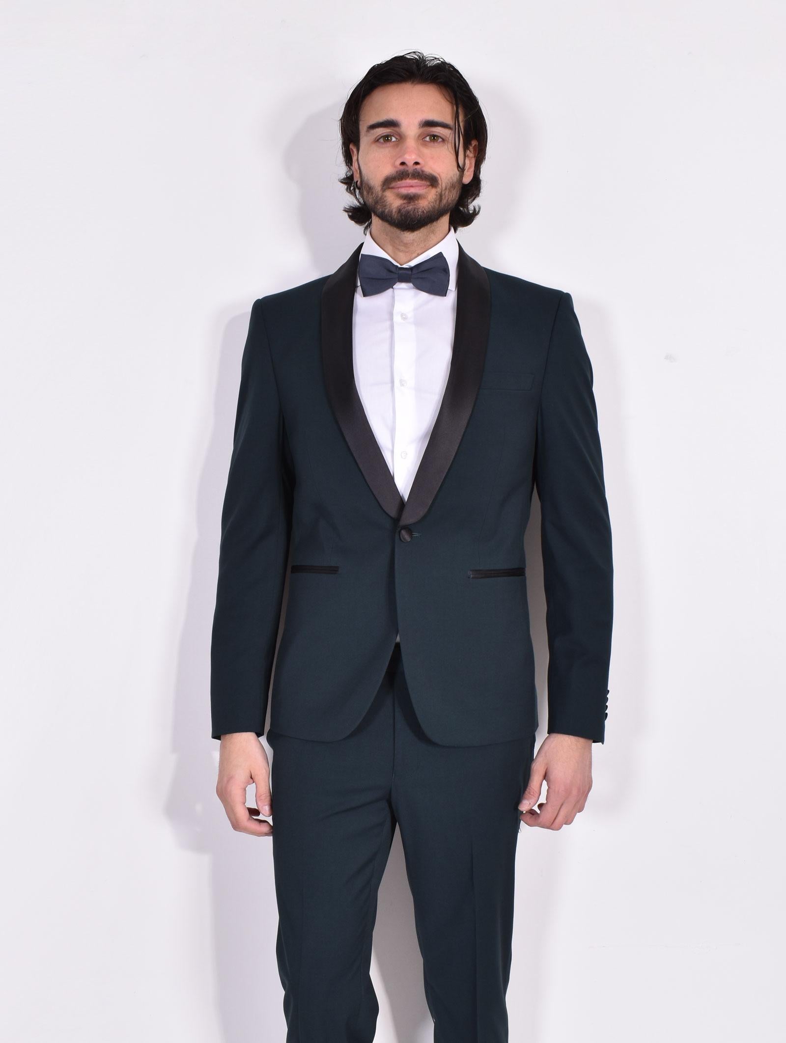 Abito colore verde modello smoking a un bottone, revers sciallato in raso. Vestibilità slim. Pantalone tasca america, apertura con cerniera e doppio bottone. Composizione 68% poliestere, 30% viscosa, 2% elastan. Made in Italy. Collezione Primavera/Estate 2024