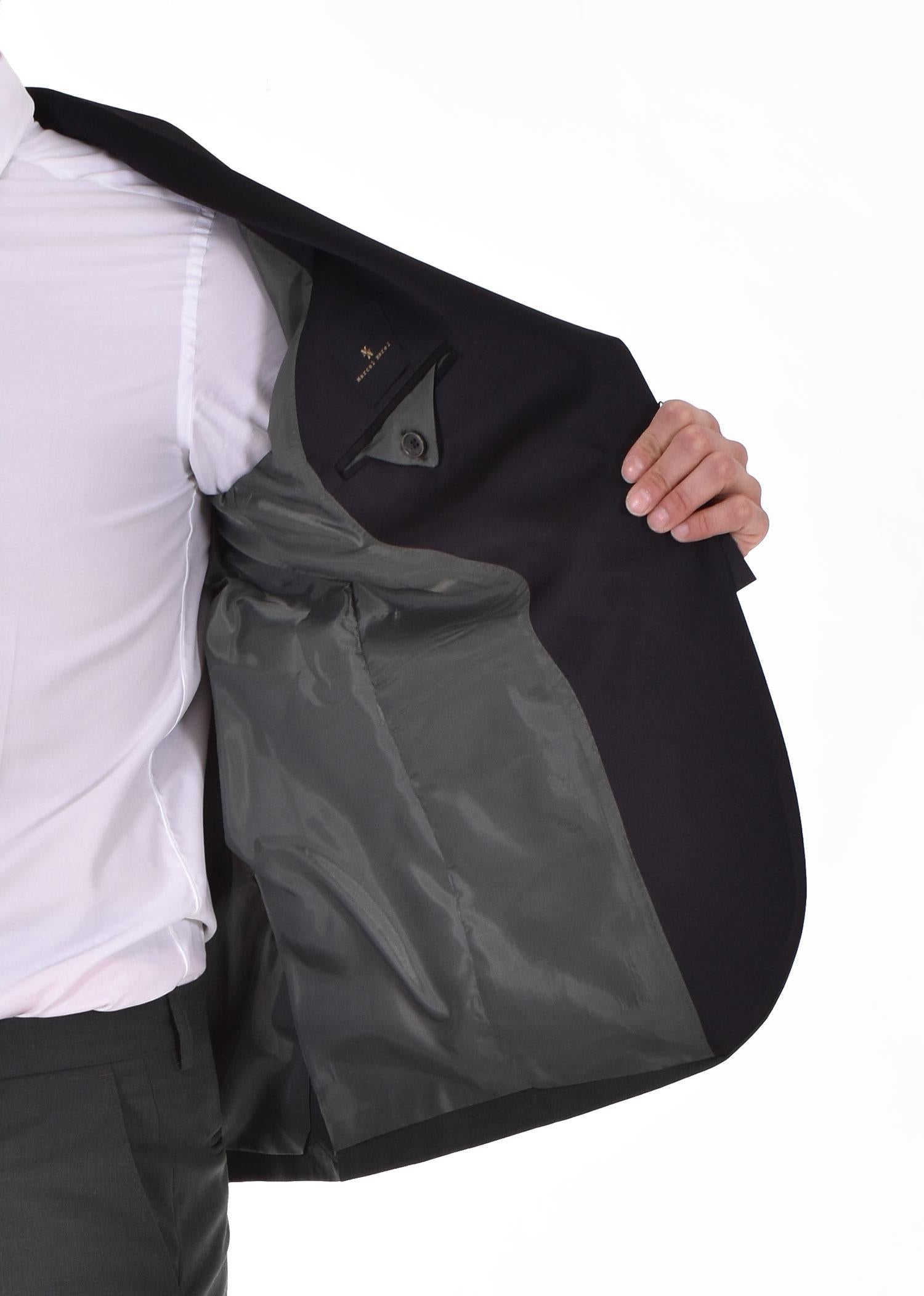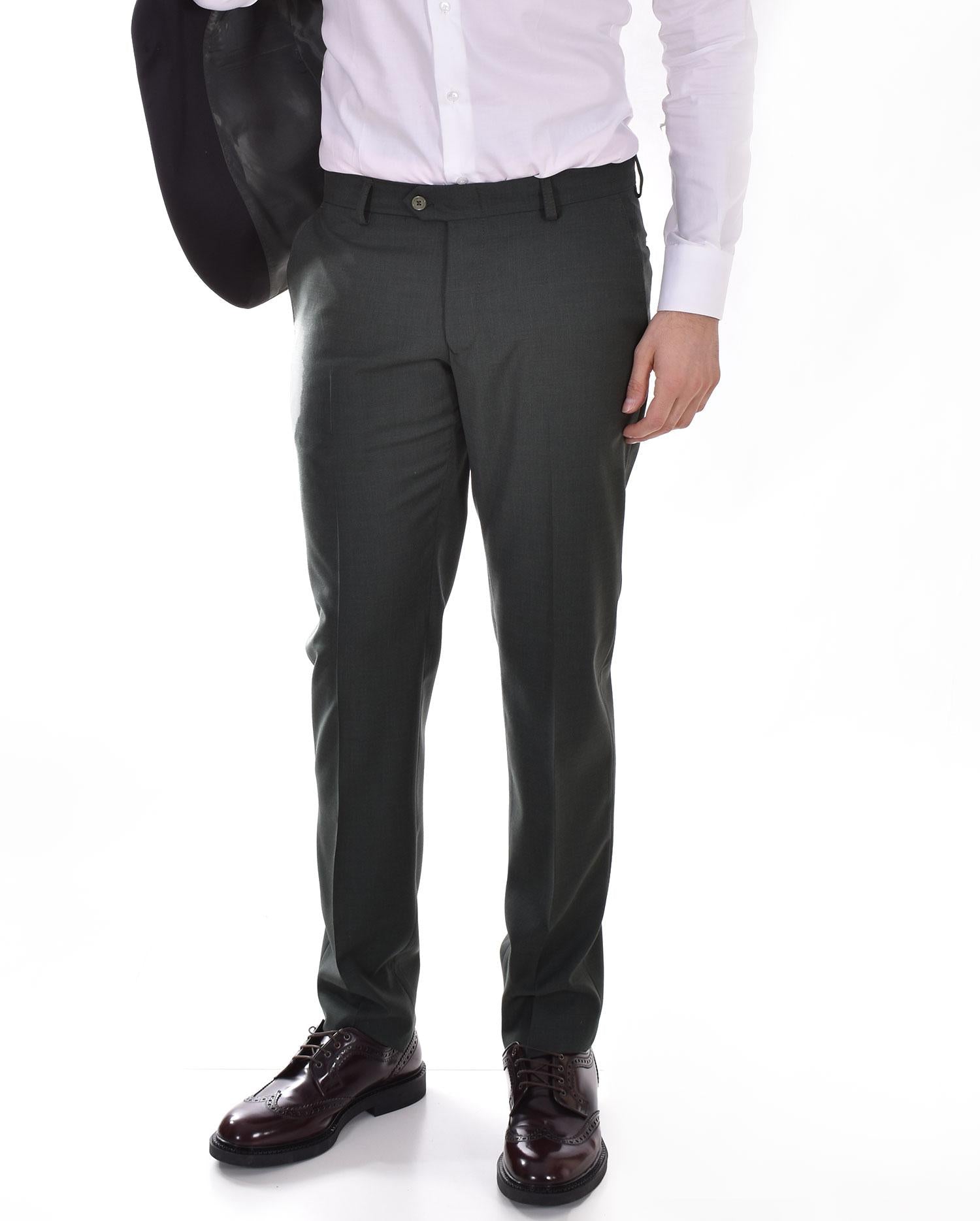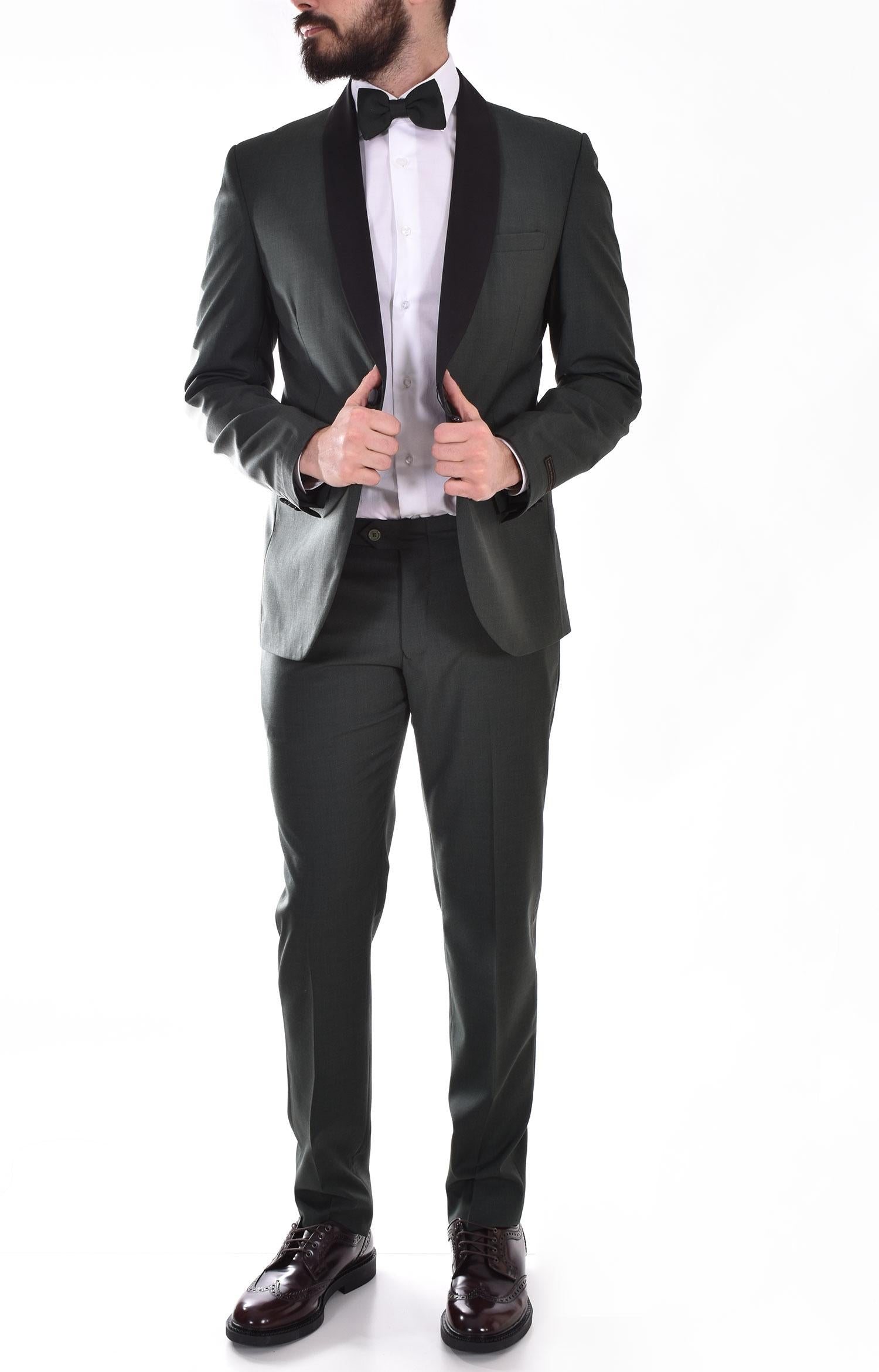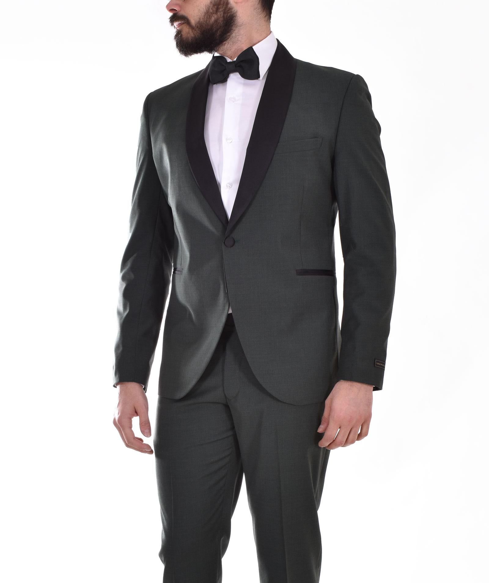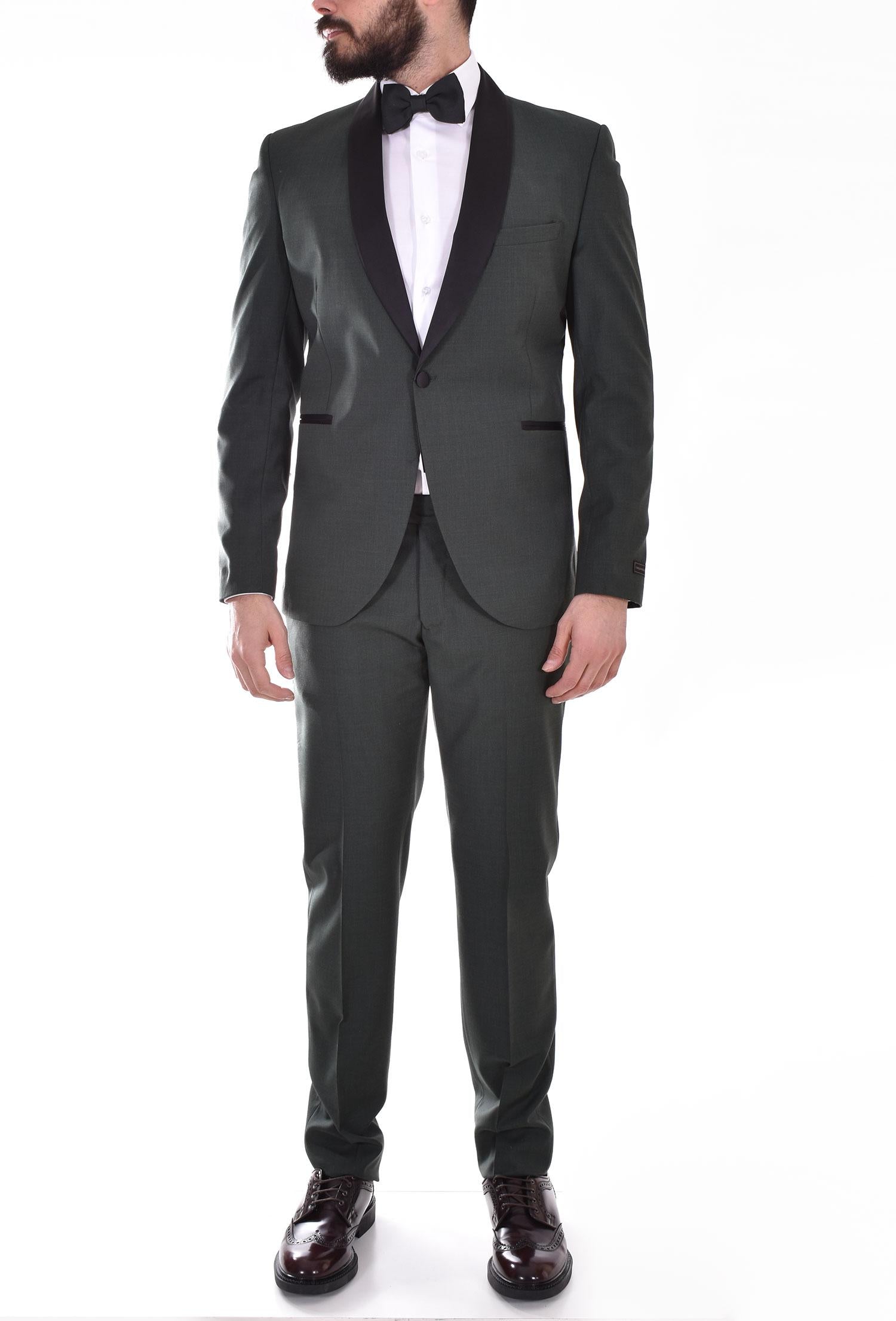 Abito modello smoking vestiblità slim colore verde. Giacca collo sciallato in raso nero, chiusura a 1 bottone, retro con doppio spacco spacco. Pantalone tasca america, chiusura in vita con cerniera, gancio e doppio bottone. Composizione 54% poliestere, 44% lana, 2% elastan. Made in Italy. Collezione Primavera/Estate 2022