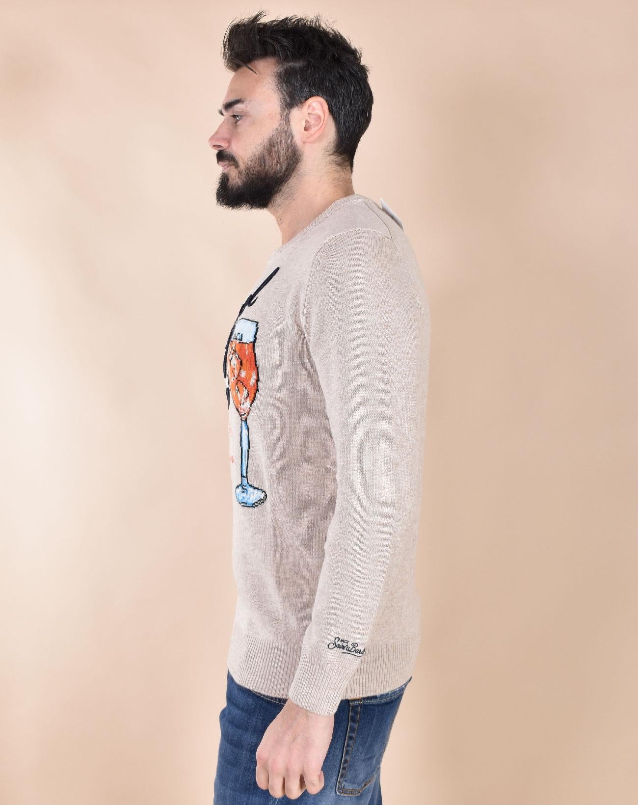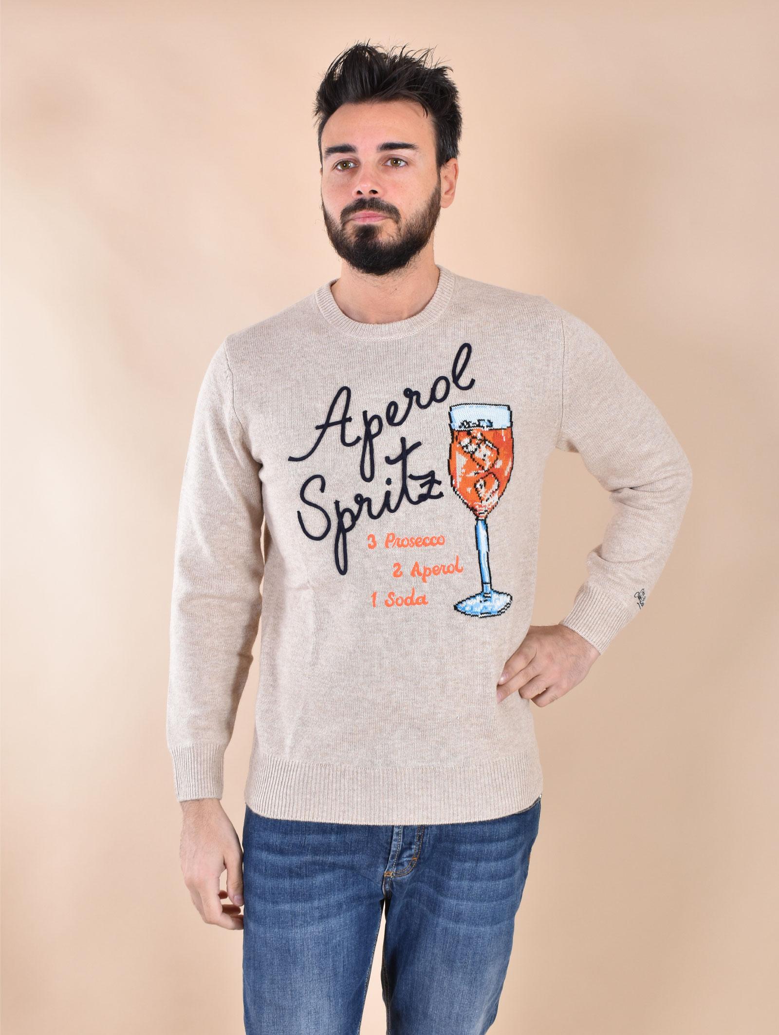 Maglia girocollo vestibilità slim, colore beige con stampa Aperol Spritz ingredienti. Edizione Apres ski. Tessuto morbido e soffice, non provoca pungitura a contatto con la pelle. Composizione 40% lana, 25% viscosa, 25% poliammide, 10% cashmere.