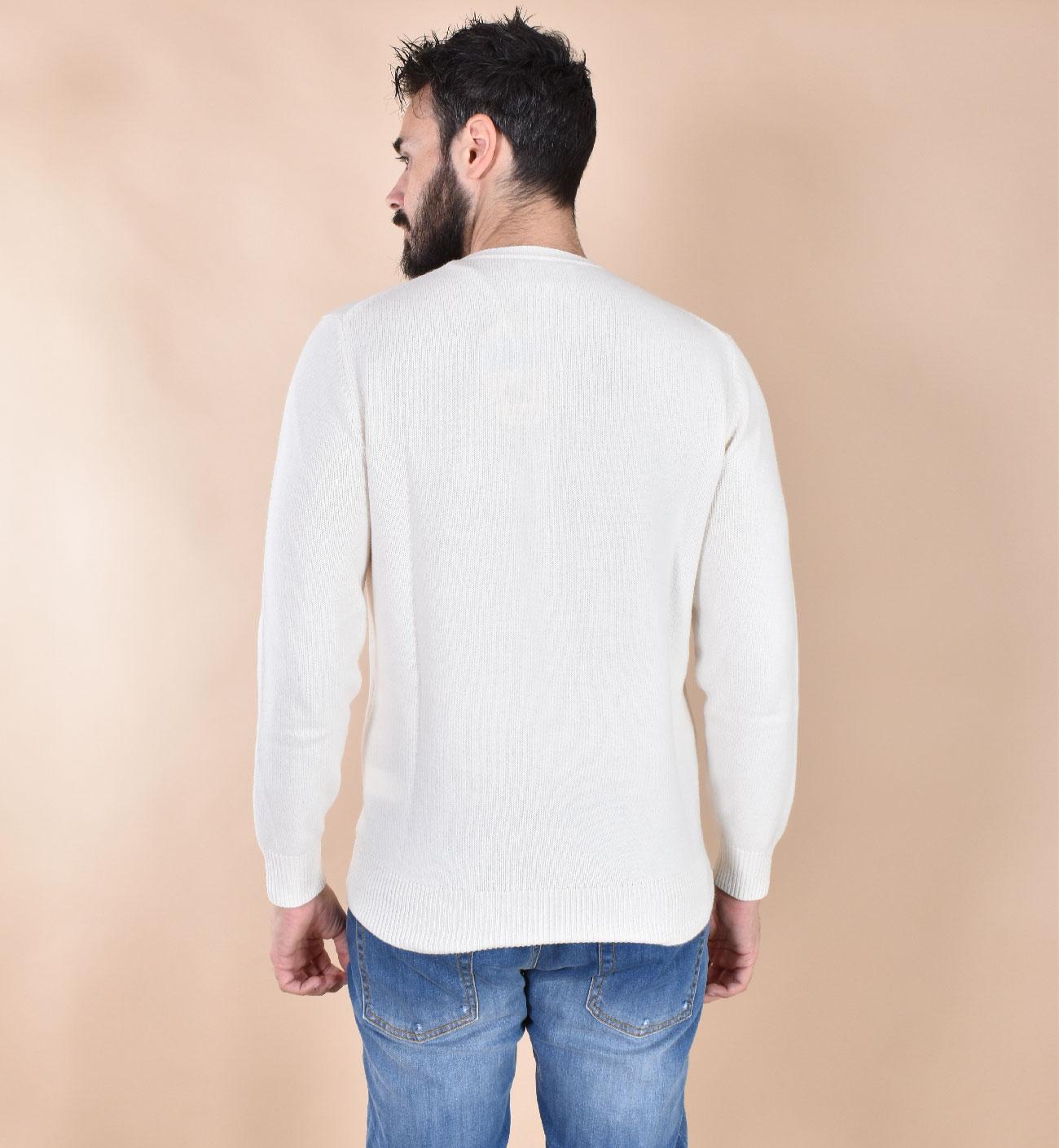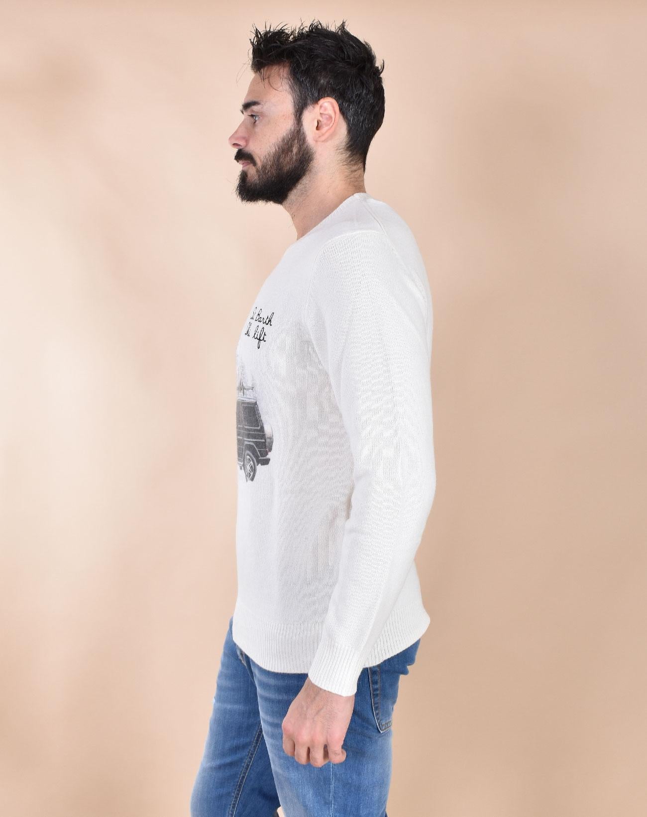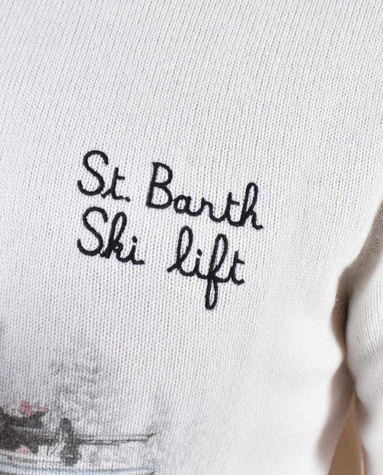 Maglia girocollo vestibilità slim, colore bianco con stampa e scritta ricamata. Apres Ski collection. Tessuto morbido e soffice, non provoca pungitura a contatto con la pelle. Composizione 40 % lana, 25% viscosa, 25% poliammide, 10% cashmere. Collezione Autunno/Inverno 2026 Il modello in foto è alto 1.80 x 81 kg, veste taglia L
