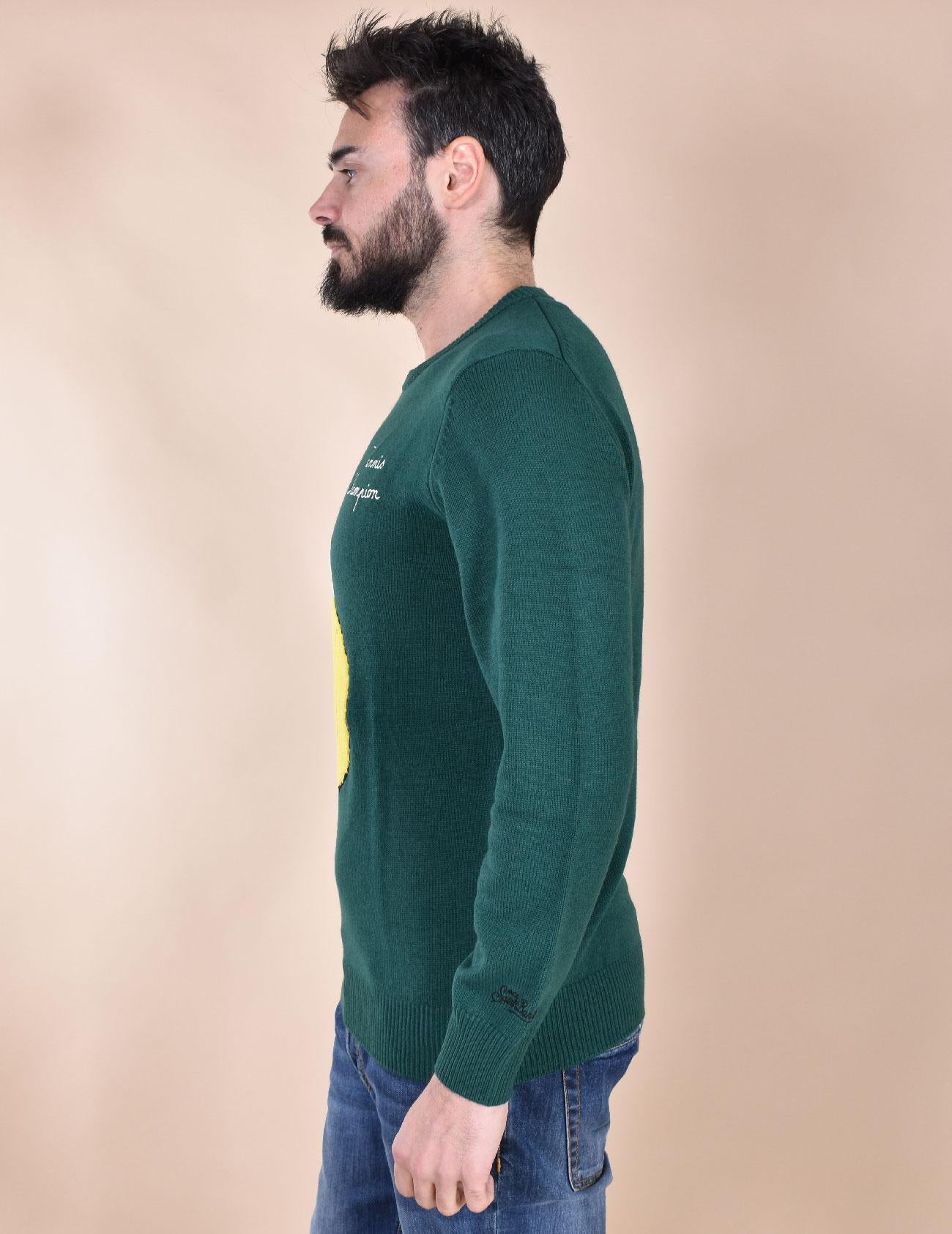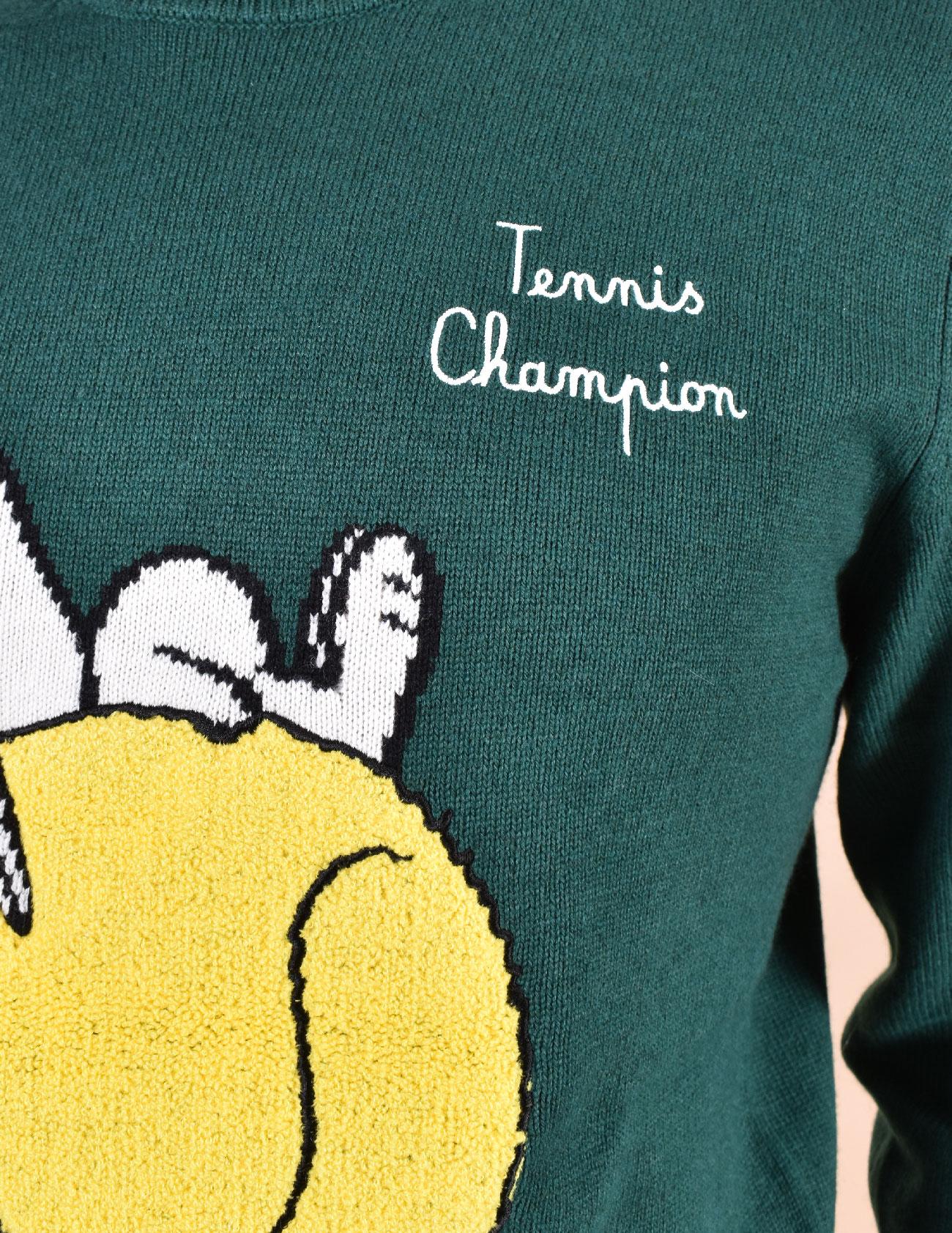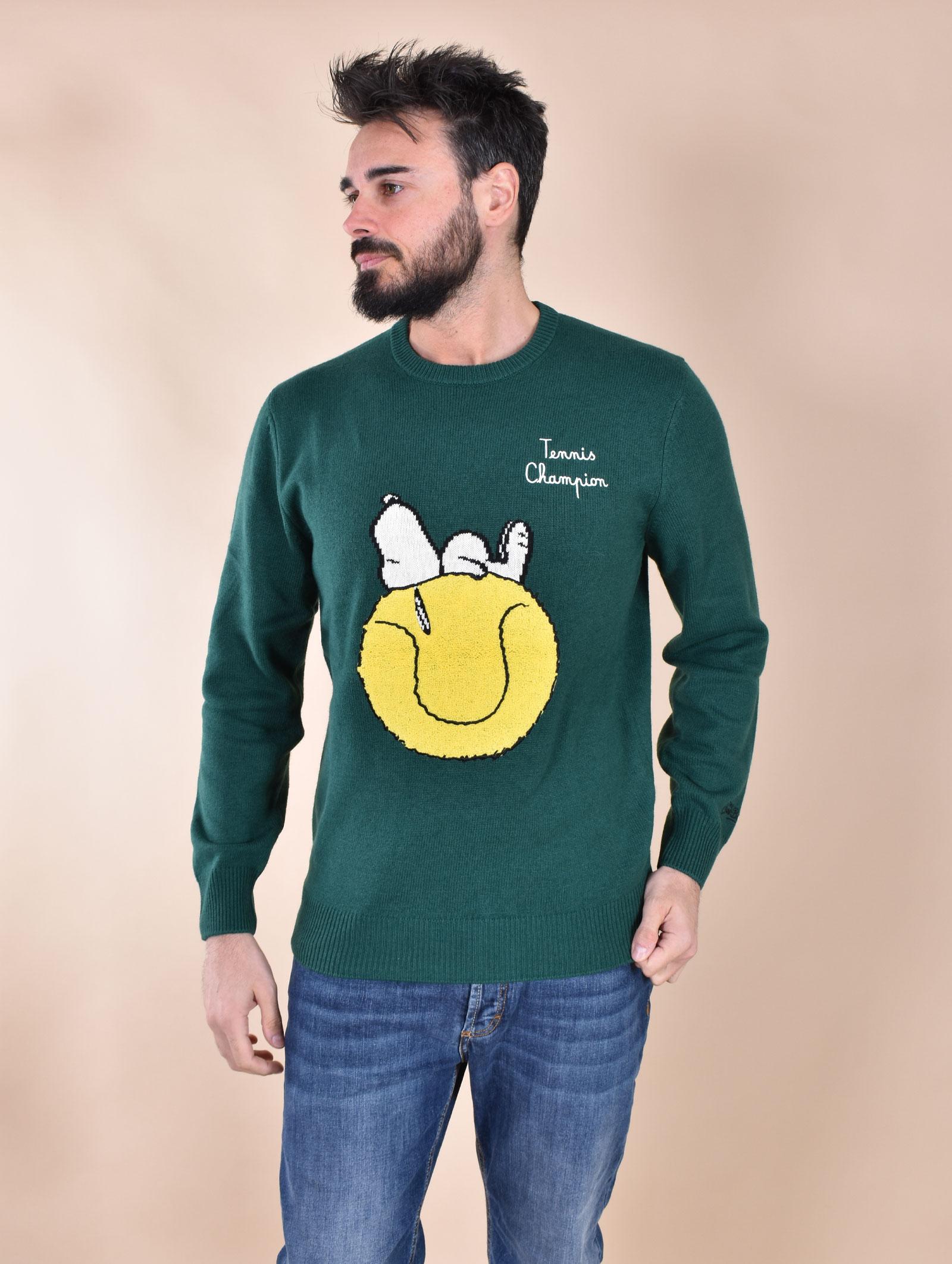 Maglia girocollo vestibilità slim, colore verde con stampa Snoopy tennis.Edizione Peanuts. Tessuto morbido e soffice, non provoca fastidio a contatto con la pelle. Composizione 40% lana, 25% viscosa, 25% poliammide, 10% cashmere.