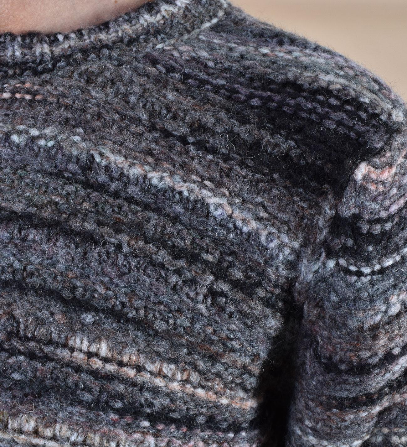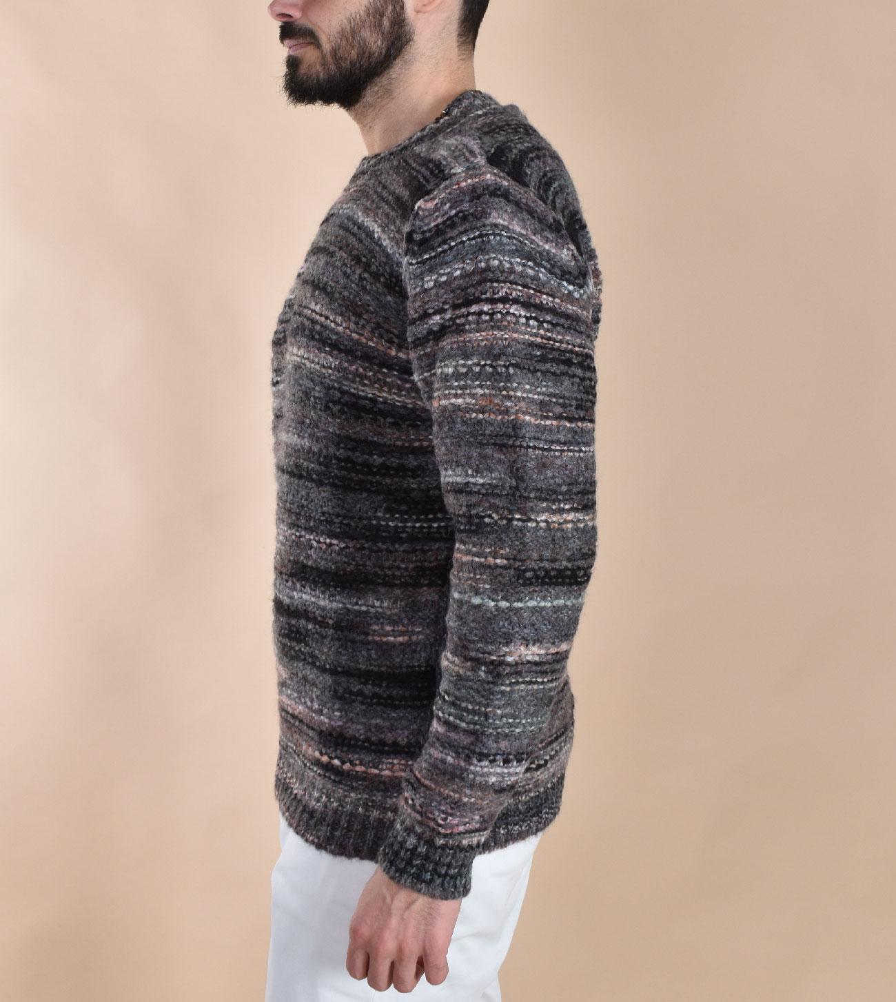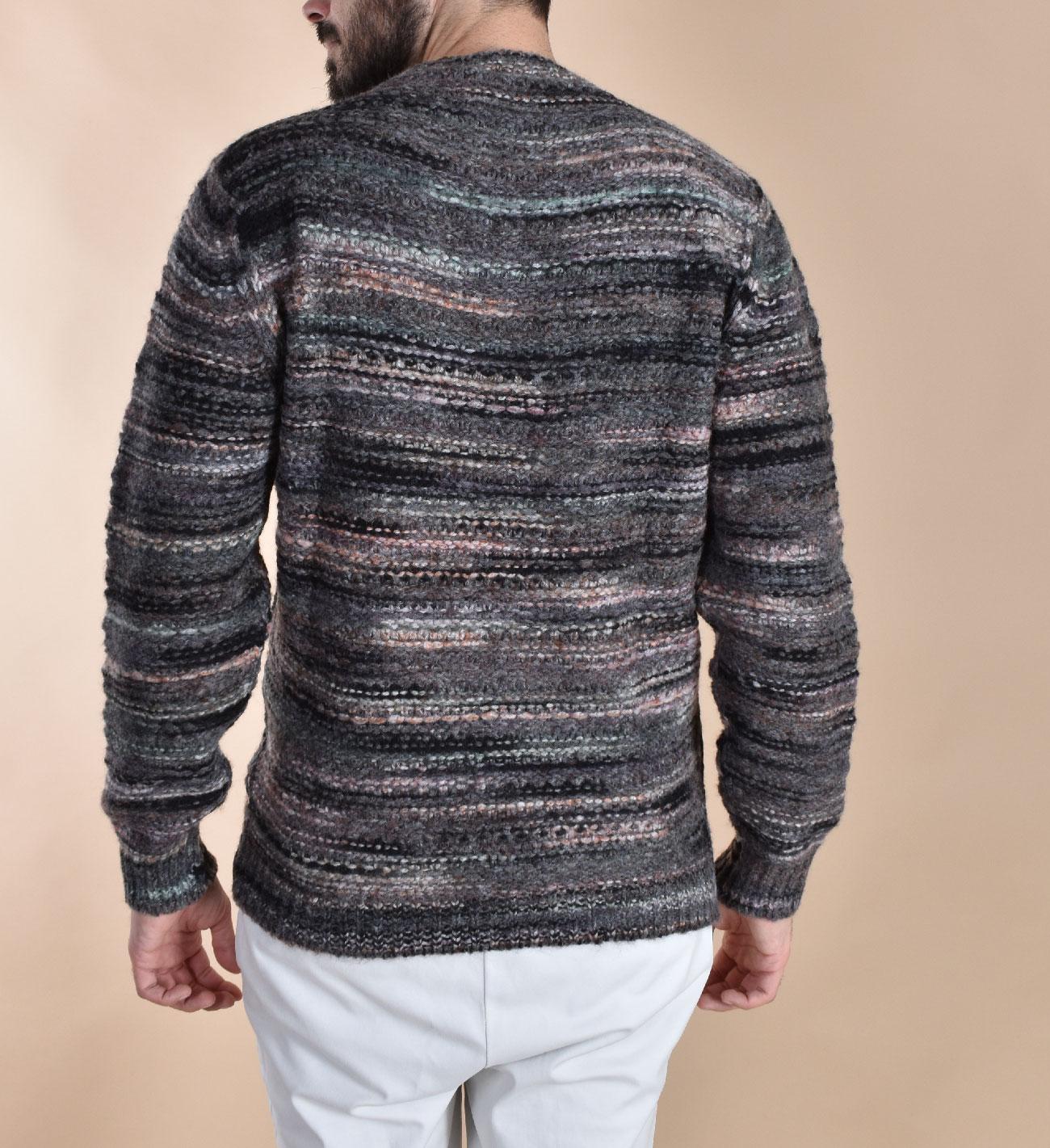 Maglione girocollo in lana soft, colore grigio e nero, vestibilità regolare. Composizione 65% acrilico, 21% lana, 14% poliammide.