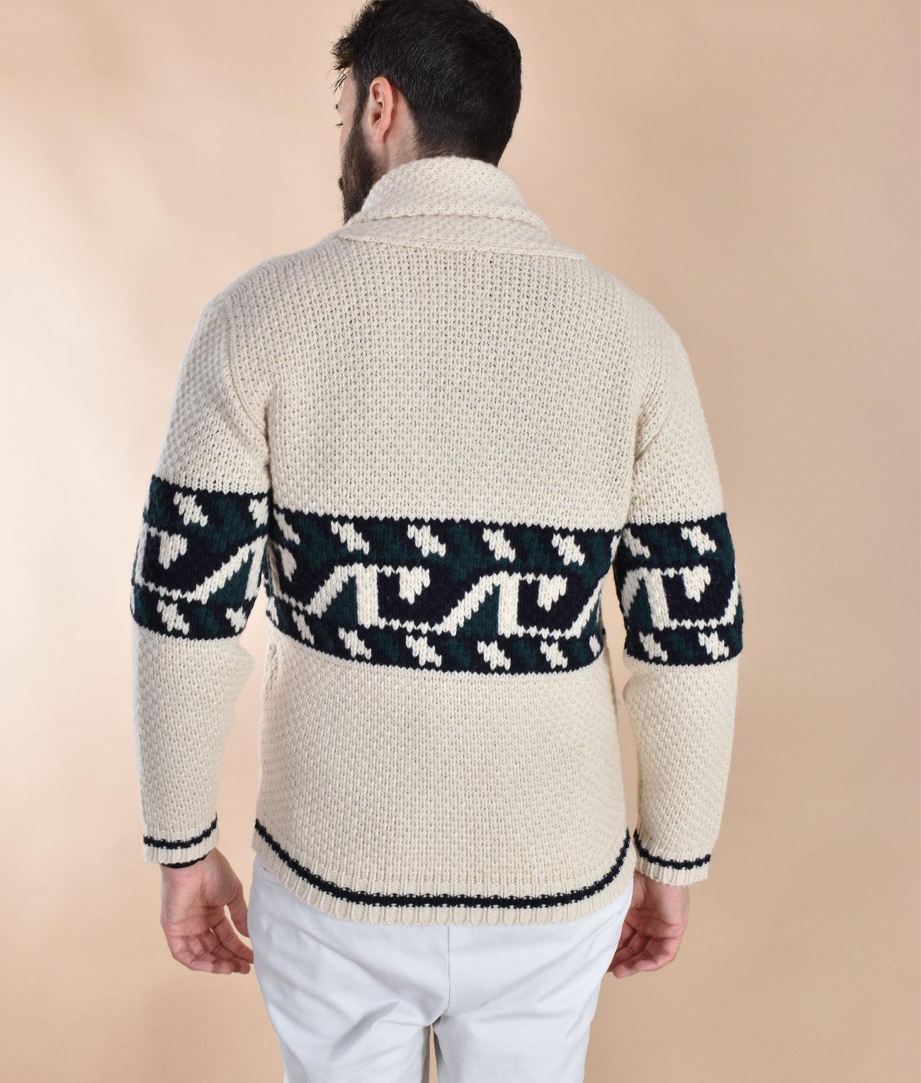 Cardigan artigianale in lana baby lambswool, morbida al tatto, colore bianco avorio in fantasia jacquard. Modello ispirato a Steve McQueen 1966. Vestibilità regolare. Chiusura con bottoni in pelle intrecciata, tasche a toppa. Made in Italy. Collezione Autunno/Inverno 2026 Il modello in foto è alto 1.80 x 81 kg, veste taglia 50