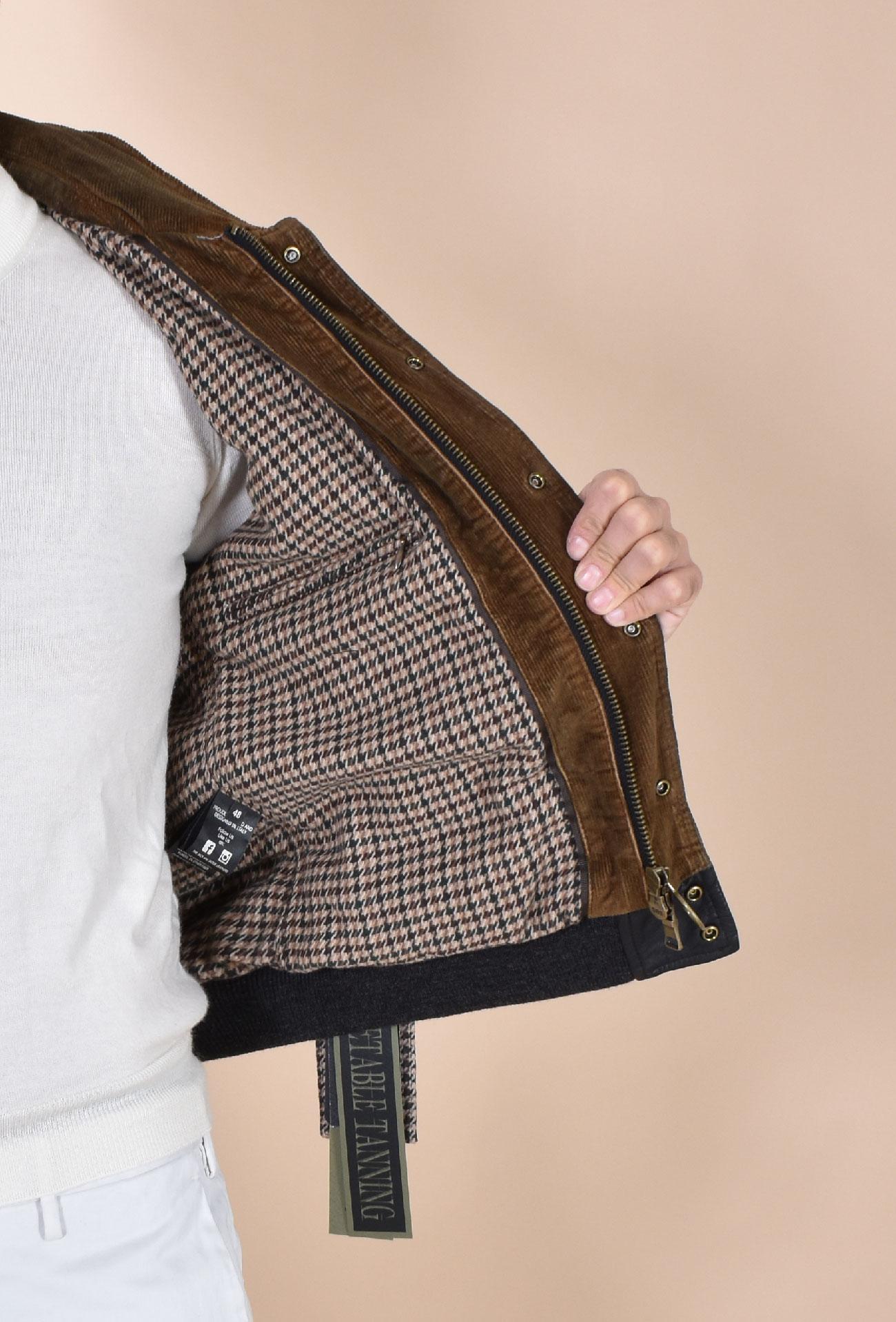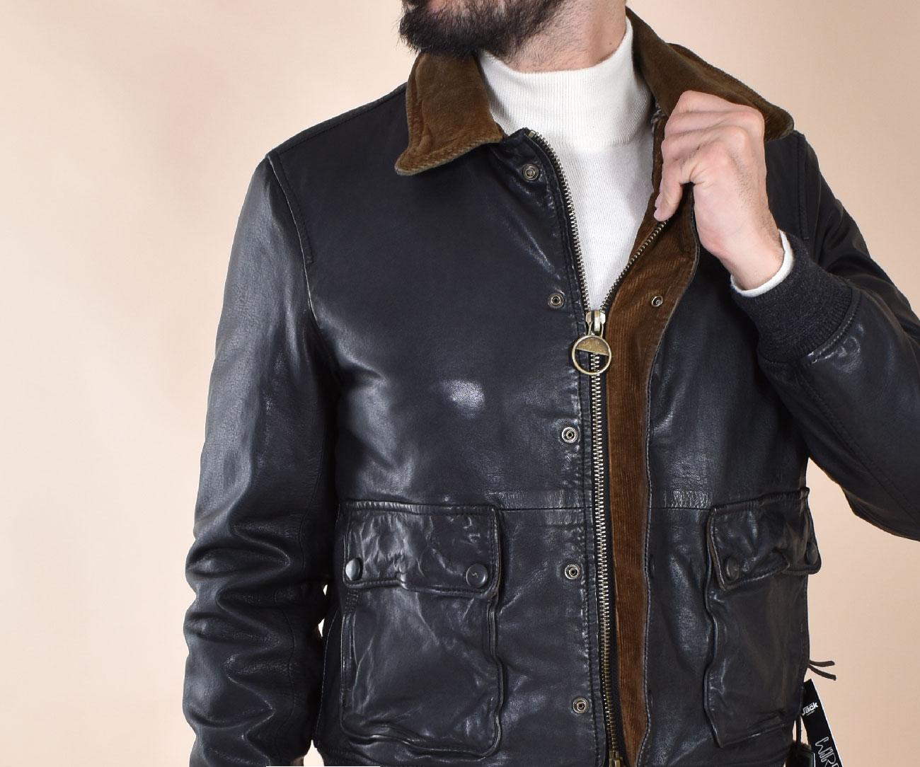 Giubbotto modello bomber in vera pelle con collo a camicia in contrasto a costine marrone. Chiusura con cerniera ad anello a doppio cursore e bottoni a pressione. Vestibilità slim. Colore nero. Fodera in flanella. Collezione Autunno/Inverno 2026 Il modello in foto è alto 1.80 x 81 kg, veste taglia 50
