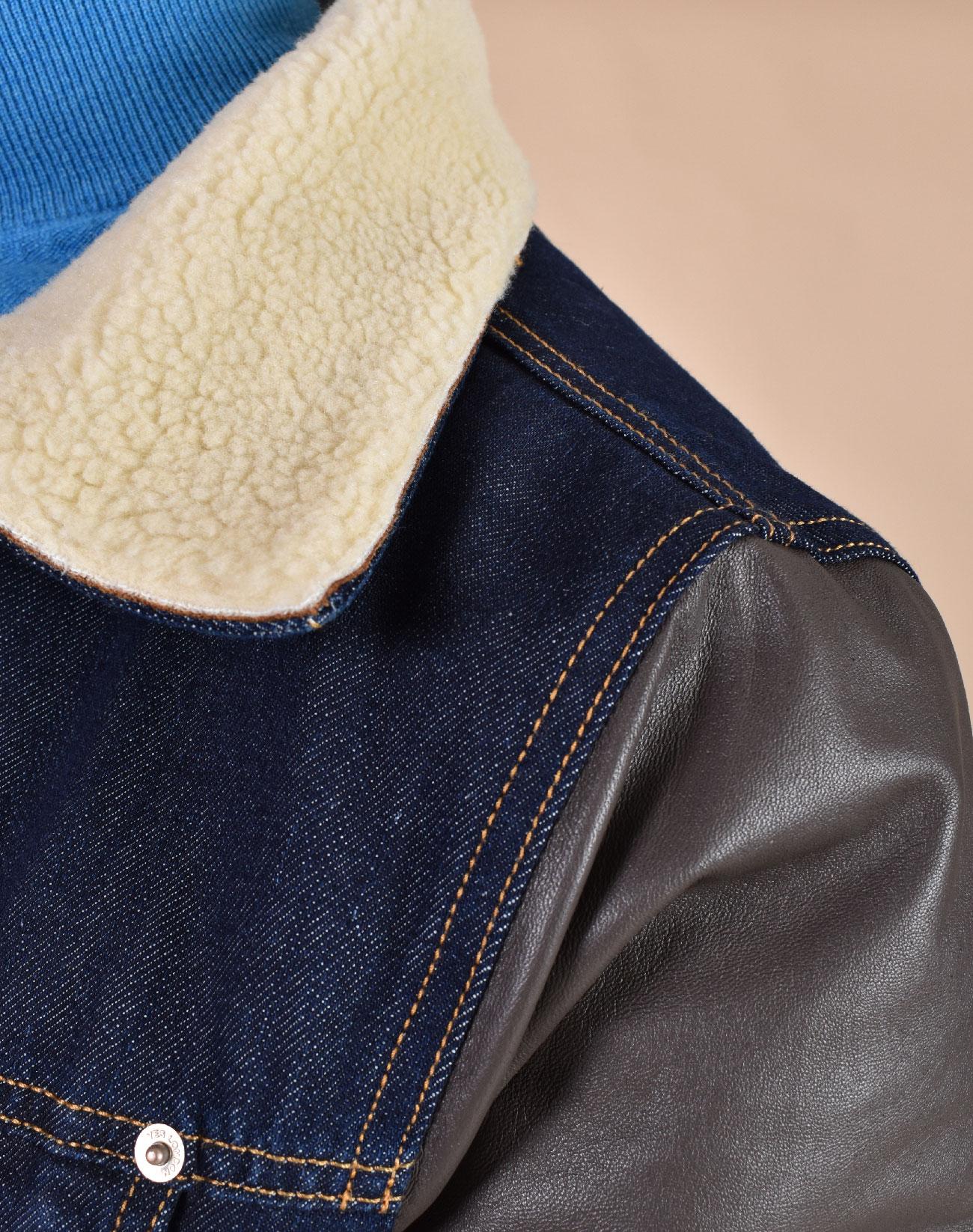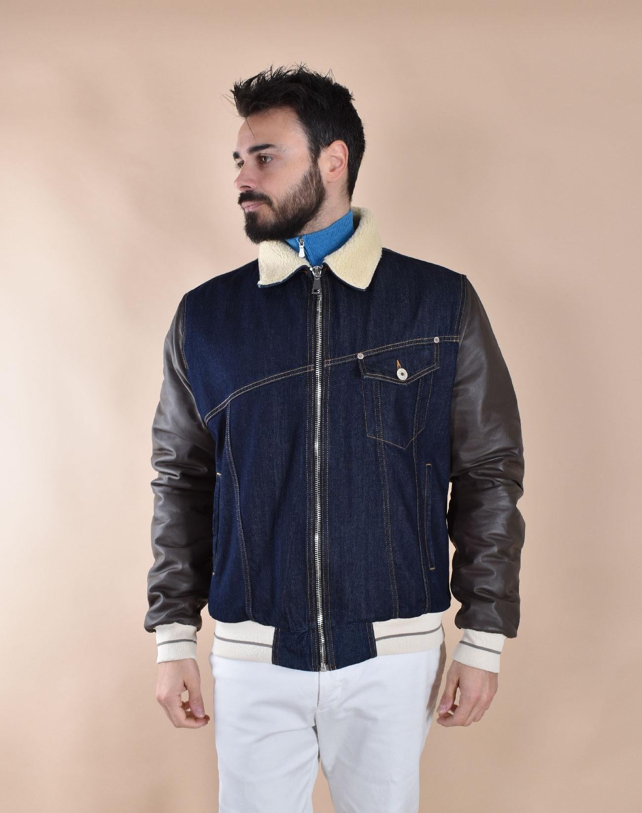 Giubbotto modello bomber in doppio tessuto, jeans sul busto e maniche in vera pelle colore marrone. Colletto in pelliccia beige. Vestibilità regolare.