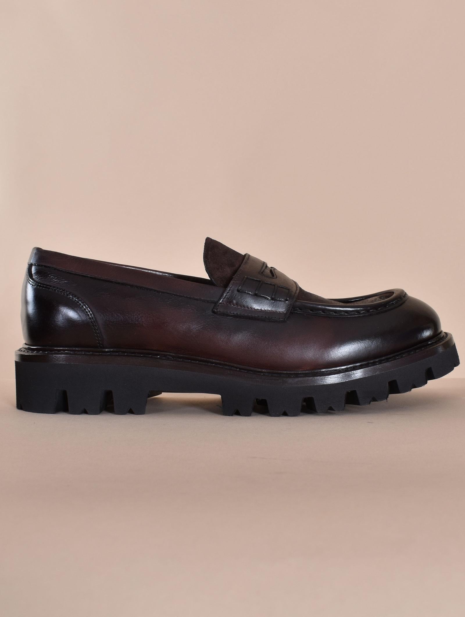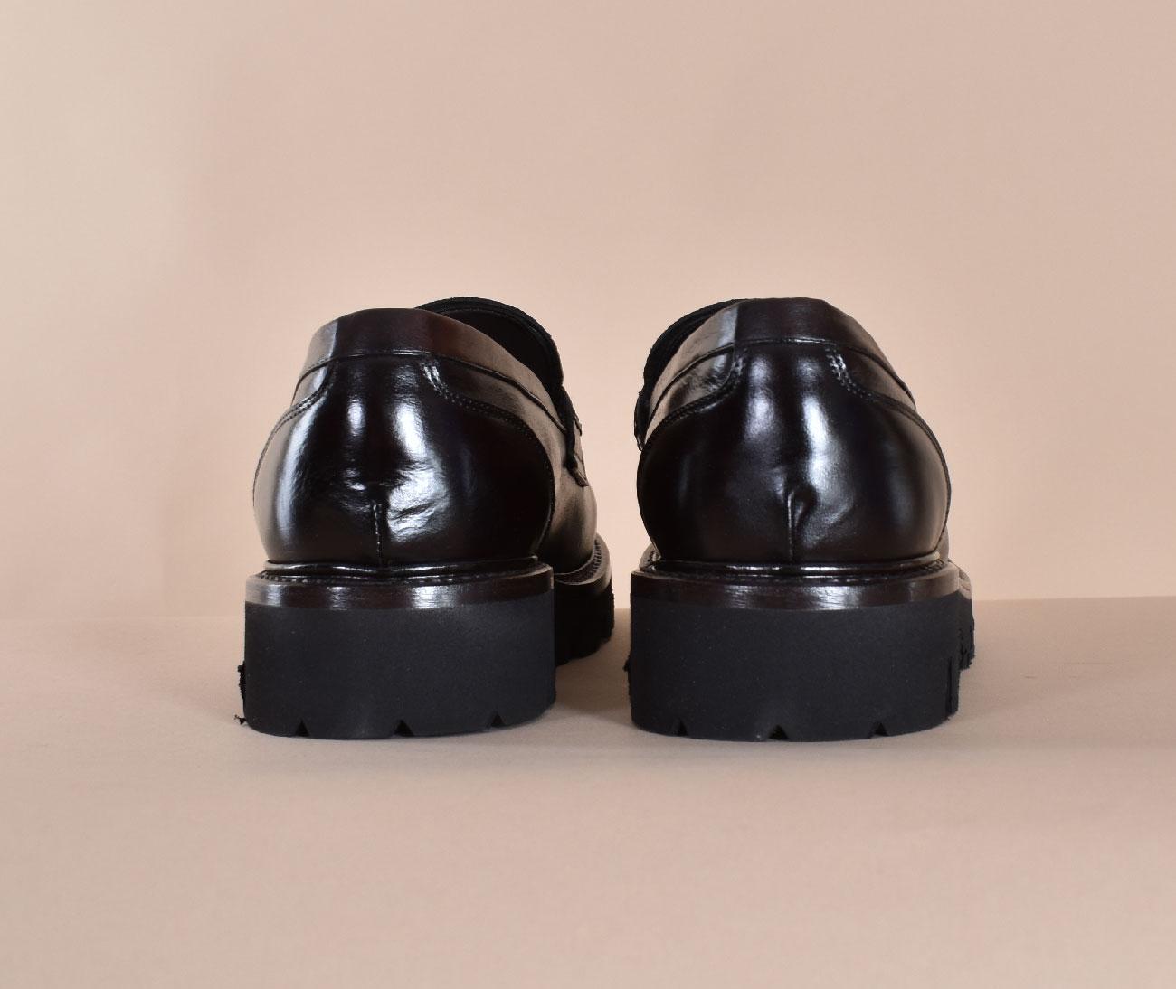 Scarpe artigianali fatte a mano modello mocassini alti, in vera pelle colore testa di moro. Suola in gomma leggera. Made in Italy.