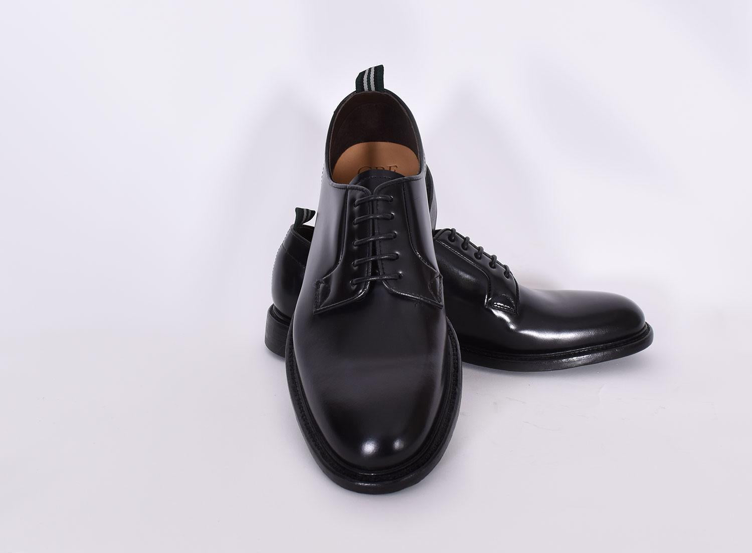 Scarpe modello derby stringate in vera pelle opaca, colore nero. Suola in cuoio. Made in Italy.