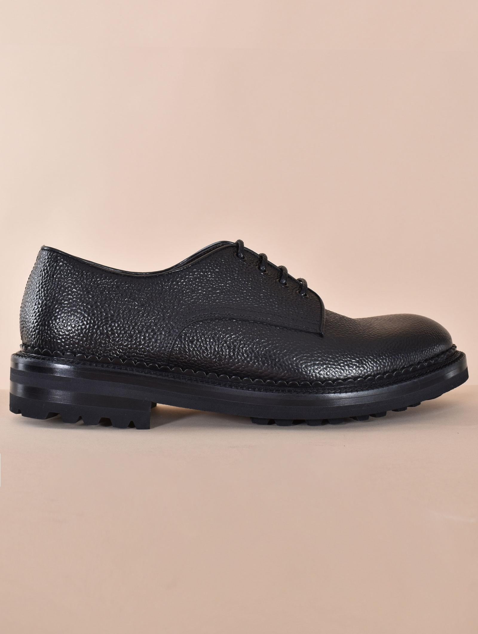 Scarpe modello derby in pelle micro tramata, colore nero. Made in Italy.