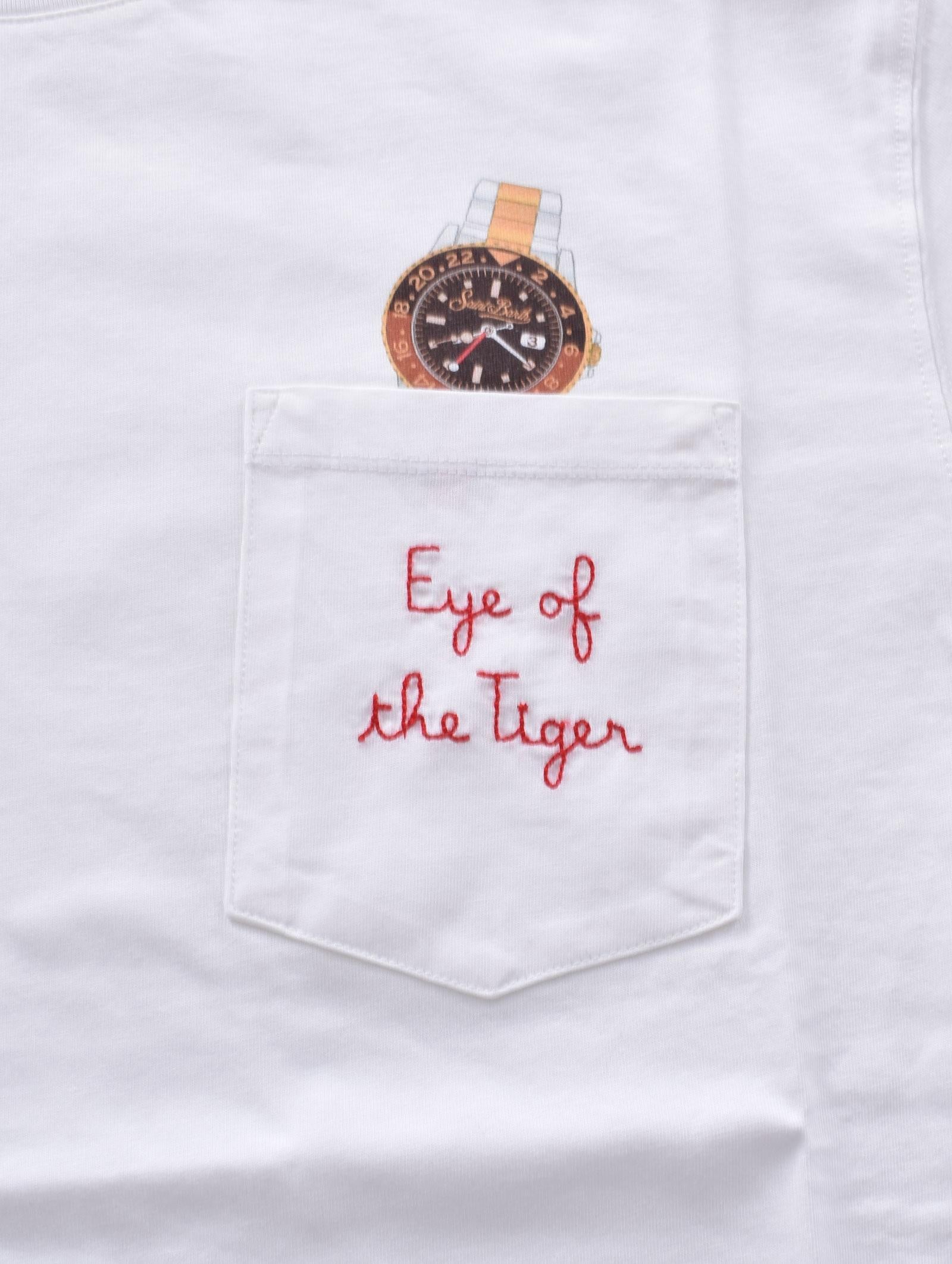 T-shirt vestibilità regolare, colore bianco con stampa orologio e scritta sul taschino.