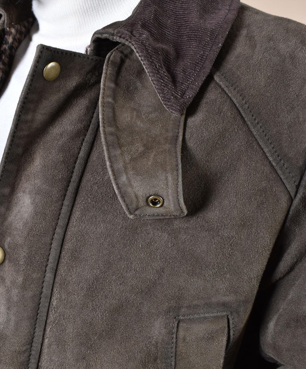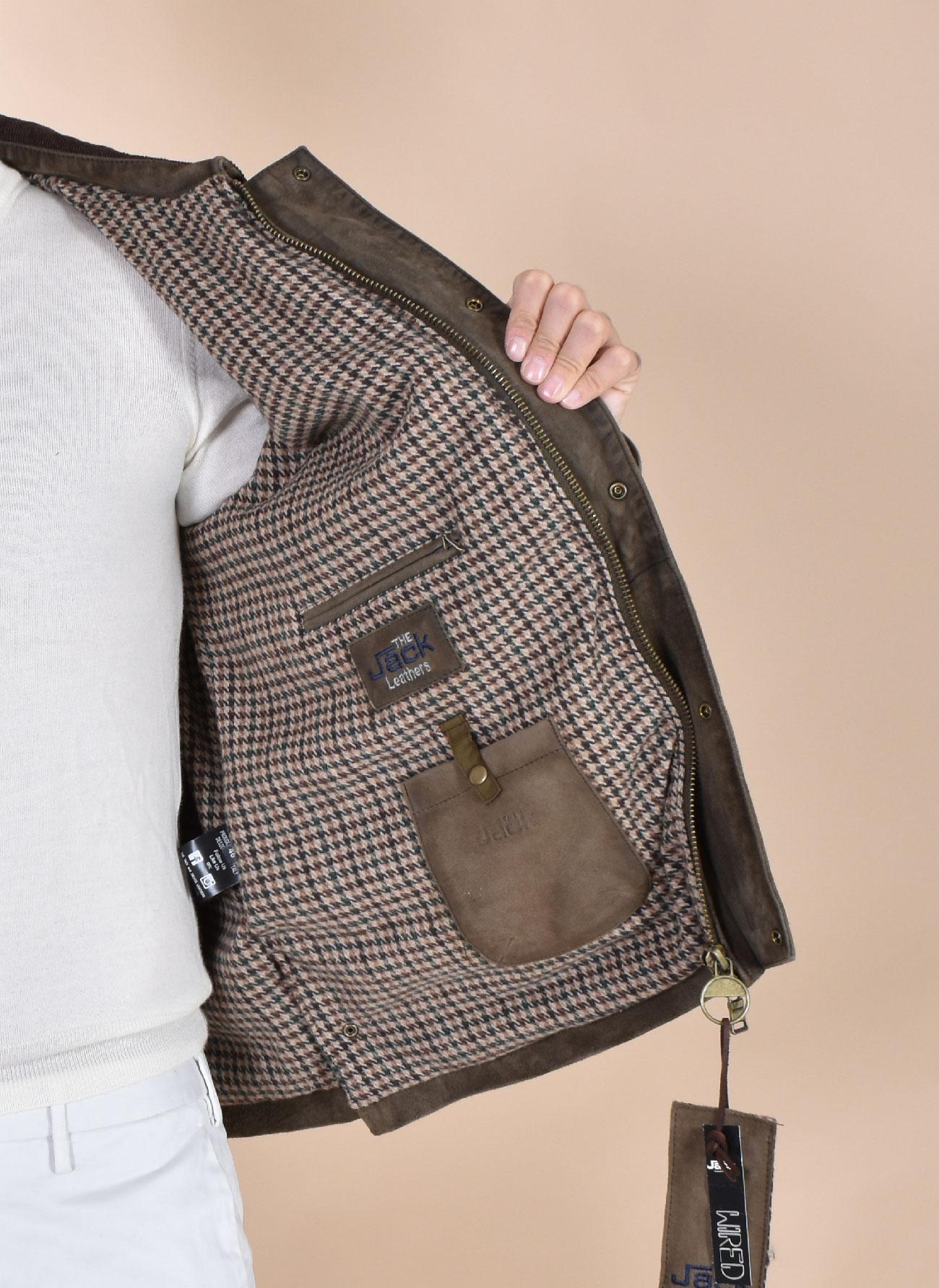 Giubbotto stile da caccia in vera pelle scamosciata con texture morbide, vestibilità regolare, colletto a camicia a costine. Chiusura con cerniera a doppio cursore ad anello e bottoni a pressione. Collezione Autunno/Inverno 2026 Il modello in foto è alto 1.80 x 81 kg, veste taglia 50