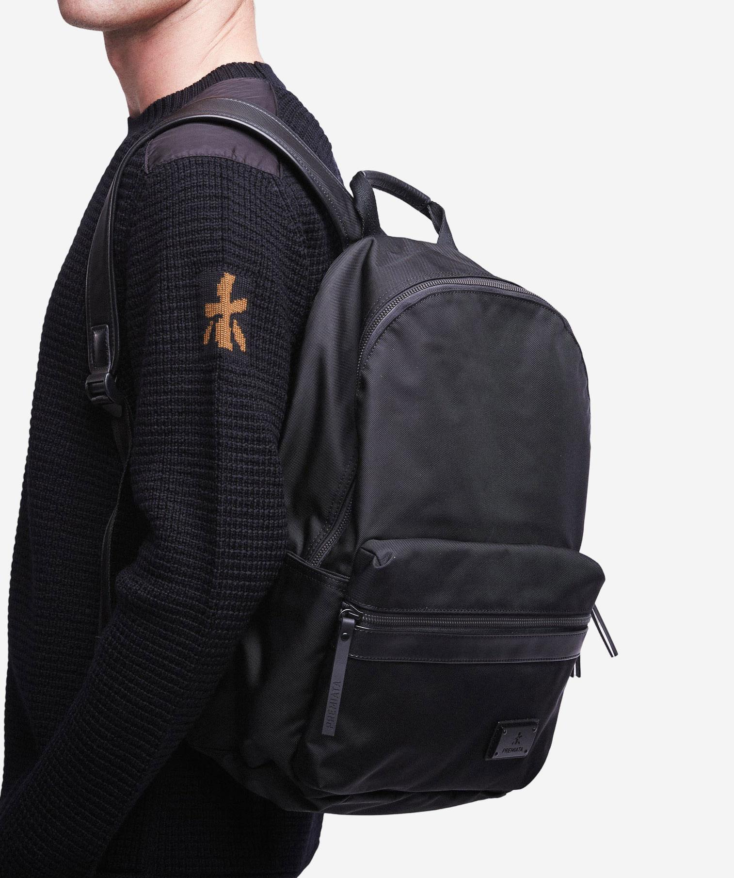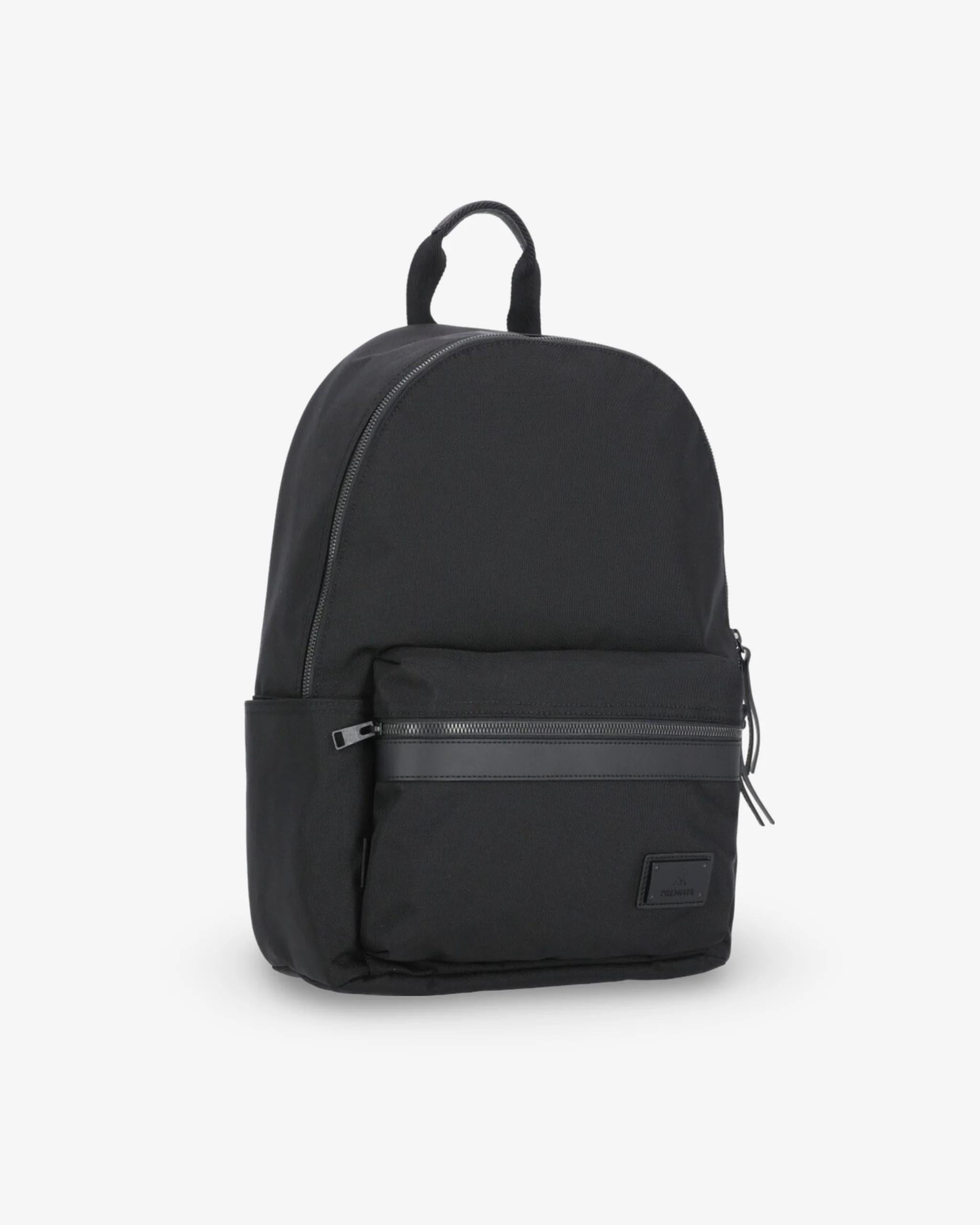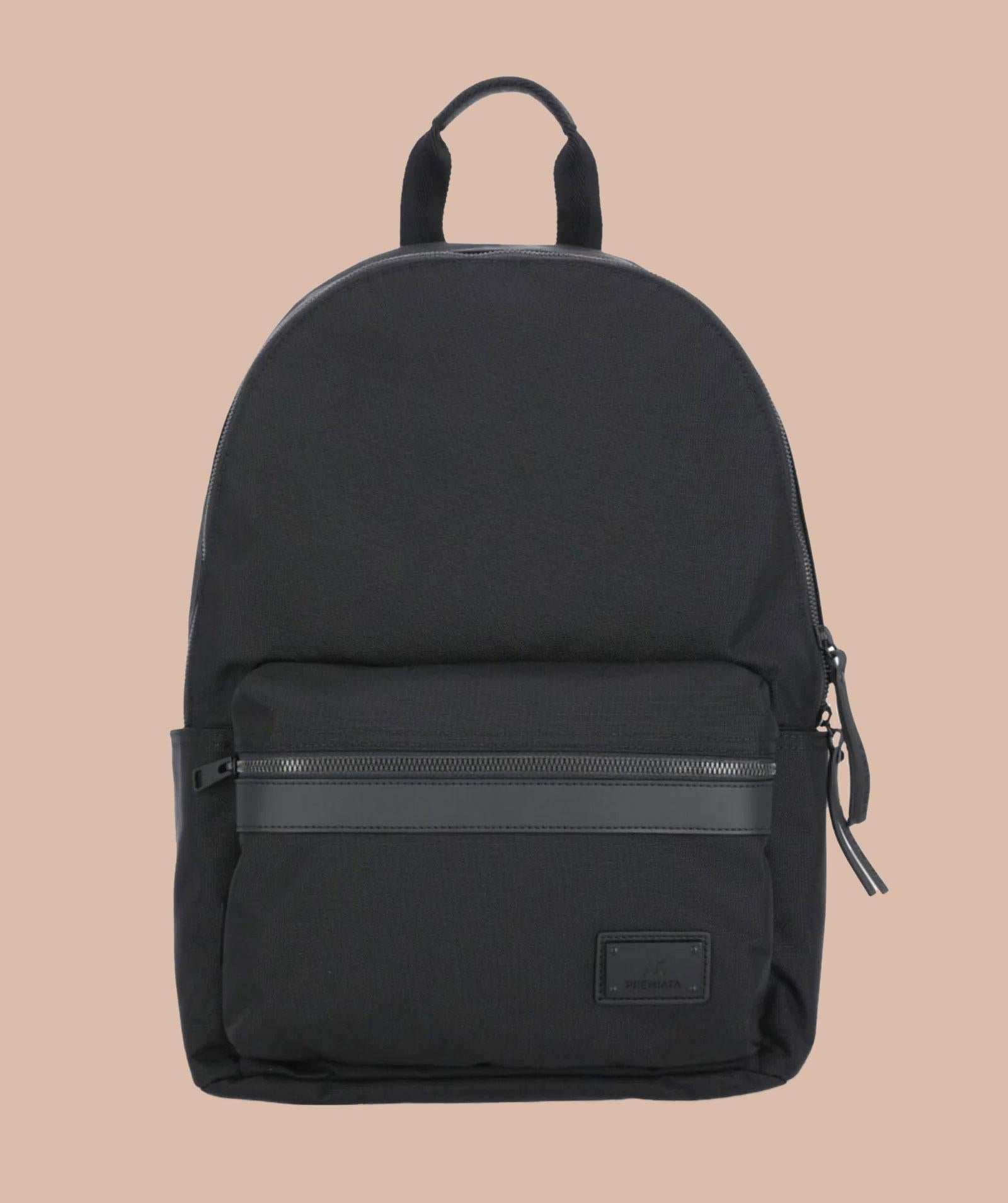 Zaino in gabardine di nylon, trattamento antisfilacciamento a prova di pioggia. Spallacci regolabili imbottiti, chiusura con cerniera in metallo a doppio cursore. Colore nero. Dimensioni: 44x30x14 cm.