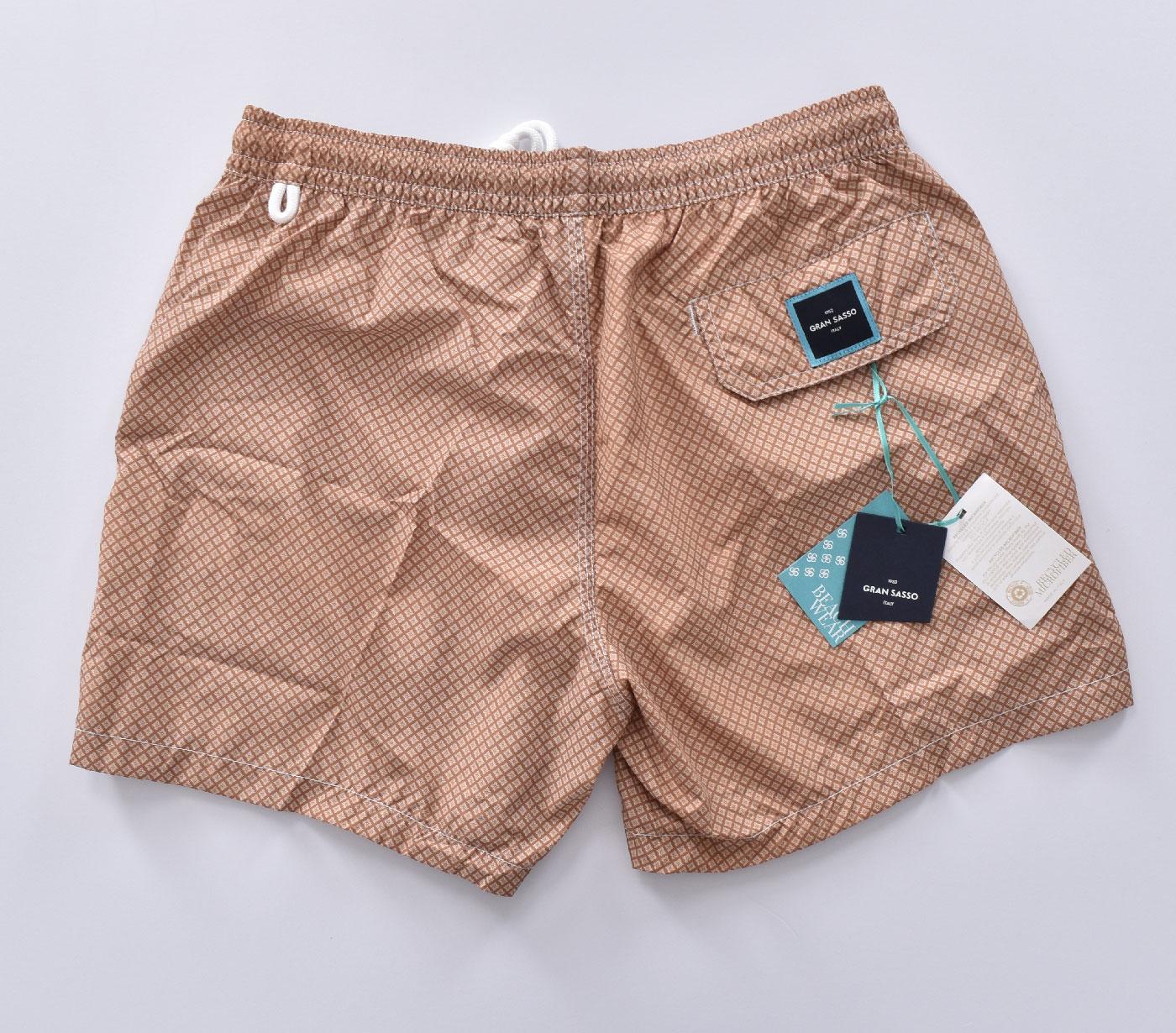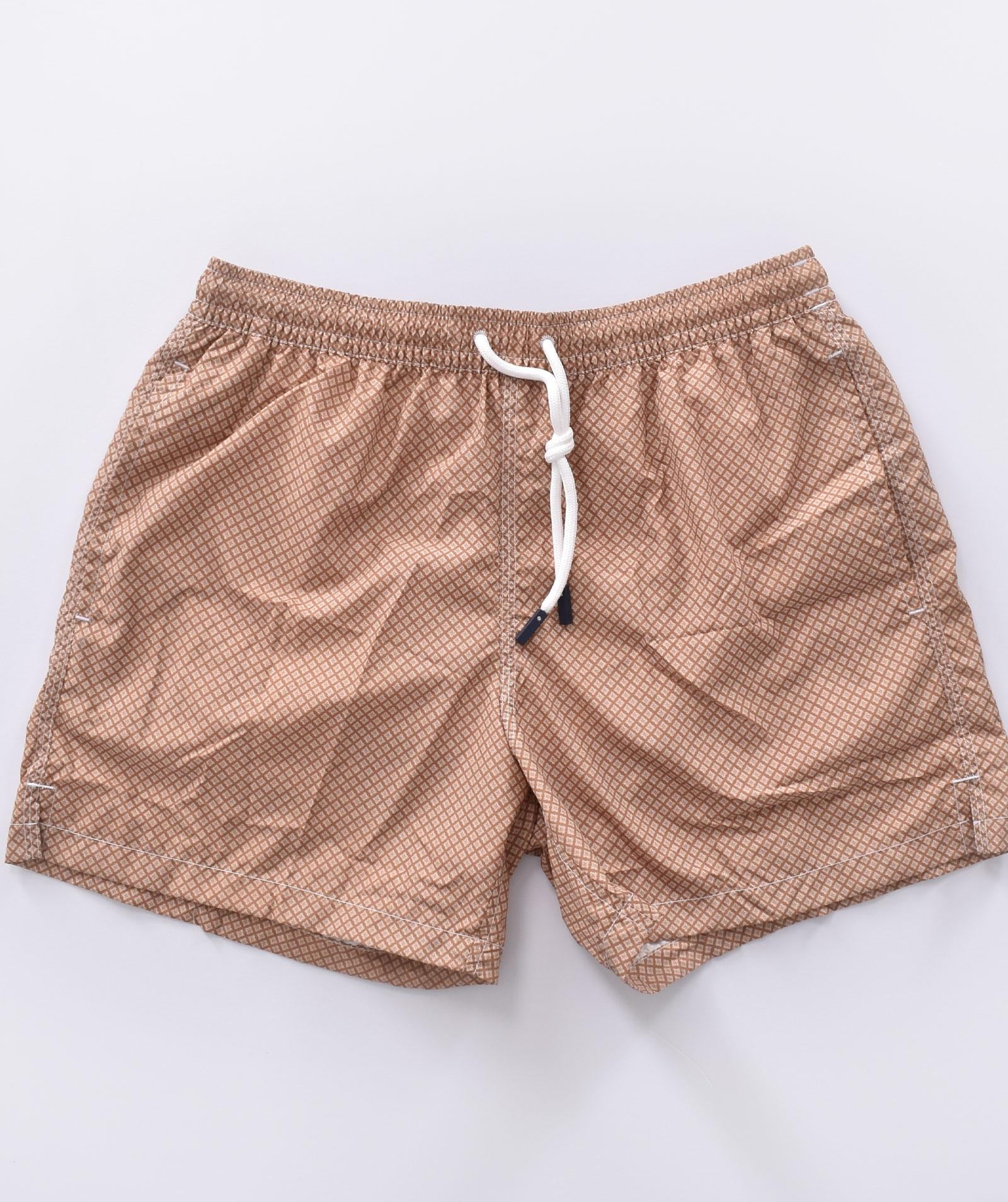 Costume da bagno colore marrone in microfantasia rombi. Tasche america, taschino sul retro, laccio in cotone. Retina antibatterica. Made in Italy.