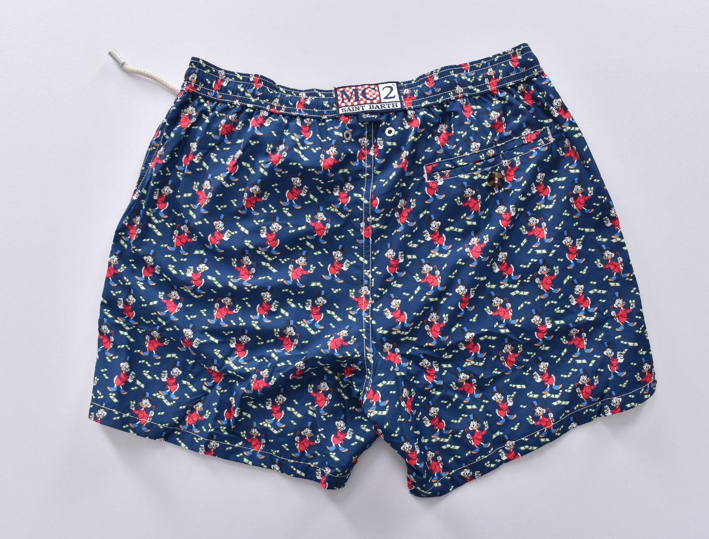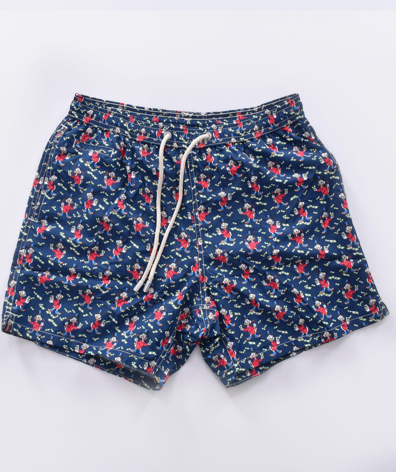 Costume da bagno colore blu con stampe zio paperone, edizione Disney. Elastico in vita, laccio in cotone, tasche ai lati, retina antibatterica. Collezione Primavera/Estate 2025