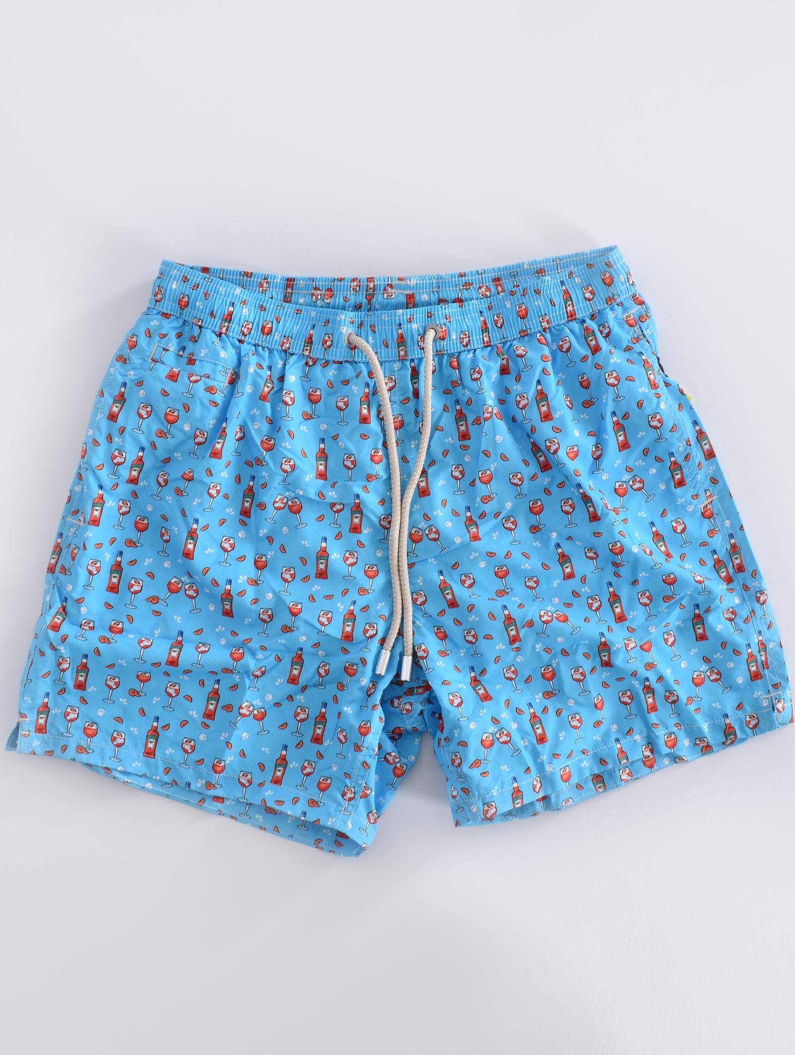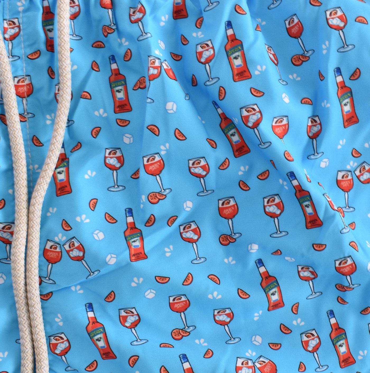 Costume da bagno colore celeste con stampe micro spritza drink. Elastico in vita, laccio in cotone, tasche ai lati, retina antibatterica. Collezione Primavera/Estate 2025