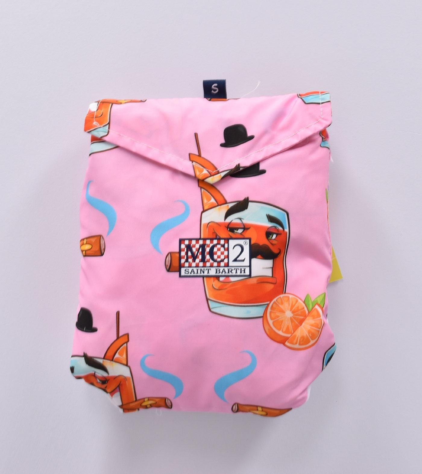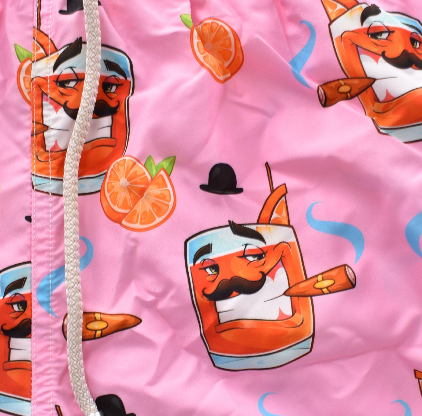 Costume da bagno colore rosa con stampe drink Crypto Puyppets. Elastico in vita, laccio in cotone, tasche ai lati, retina antibatterica. Collezione Primavera/Estate 2025