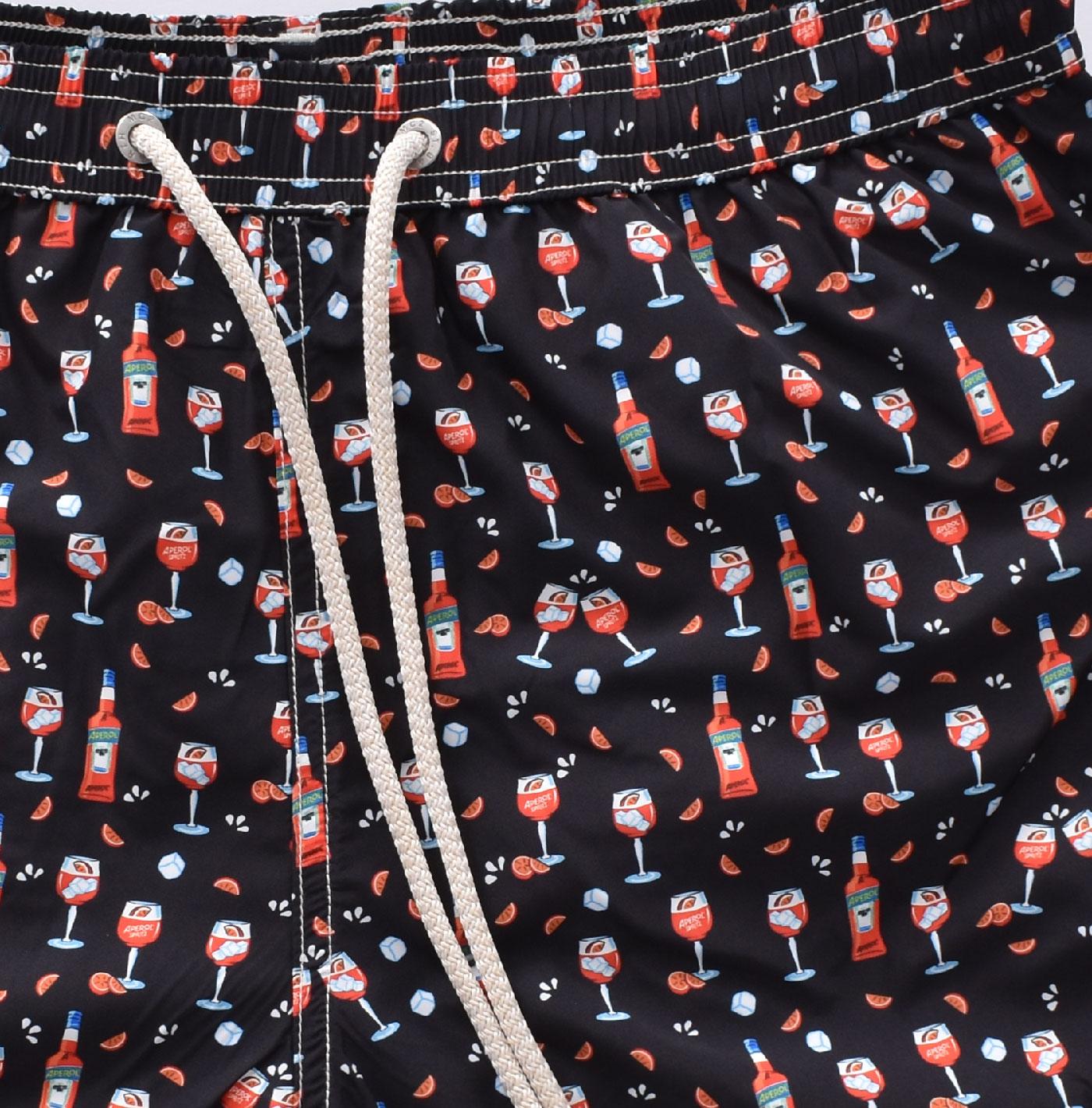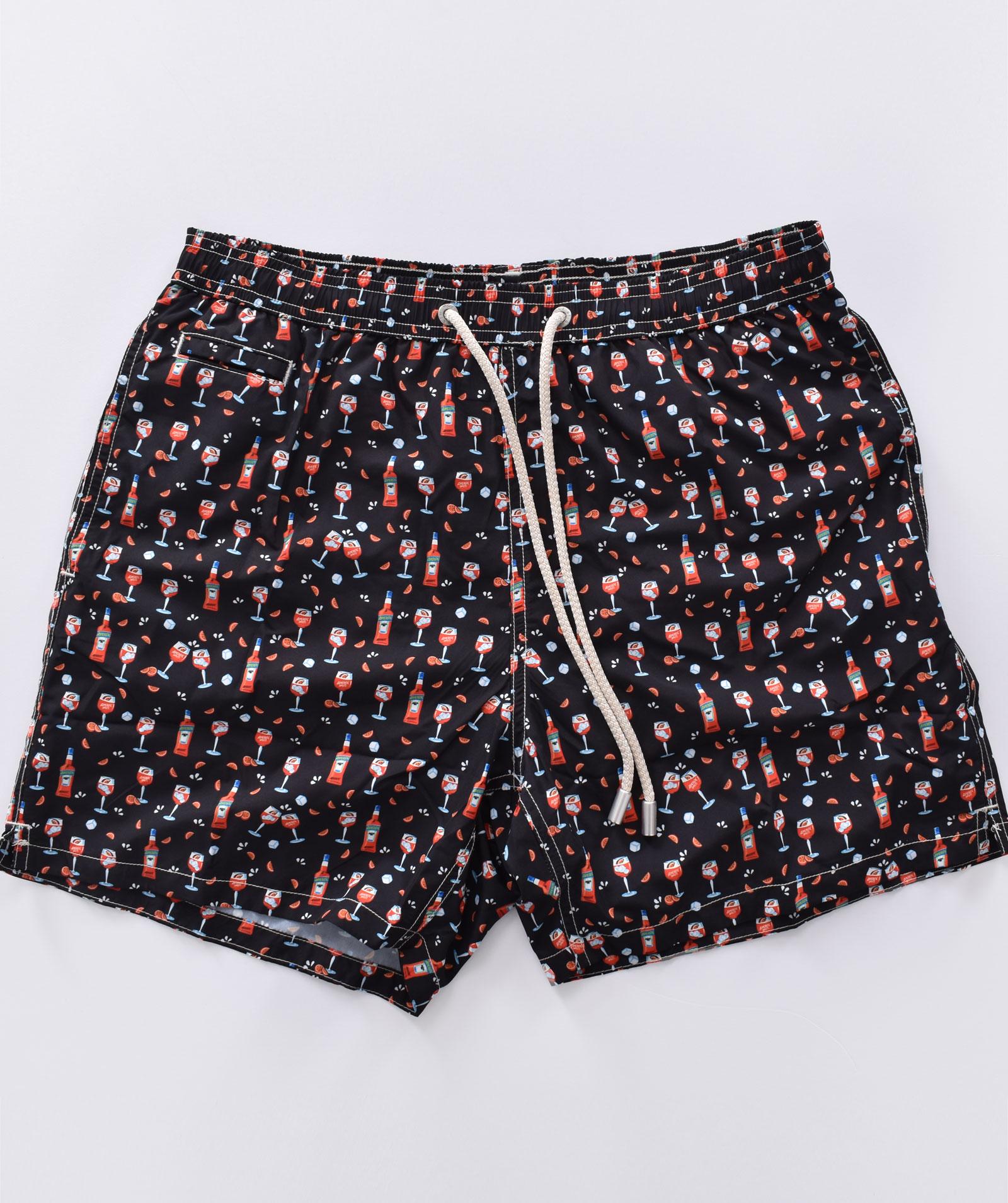 Costume da bagno colore nero con micro stampe spritz. Elastico in vita, laccio in cotone, tasche ai lati, retina antibatterica.