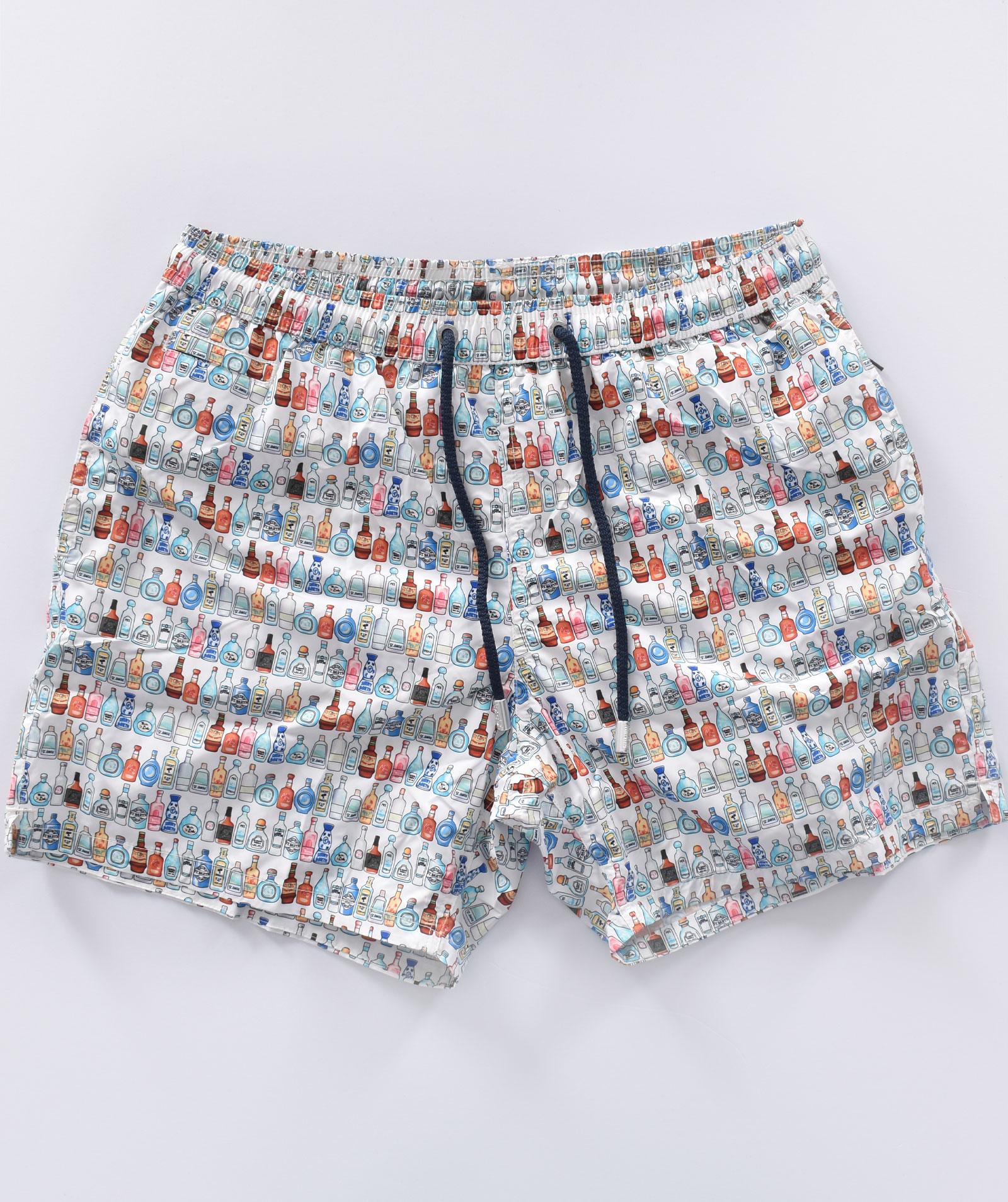 Costume da bagno colore bianco con stampe bottiglie alcolici colorate. Elastico in vita, laccio in cotone, tasche ai lati, retina antibatterica. Collezione Primavera/Estate 2025