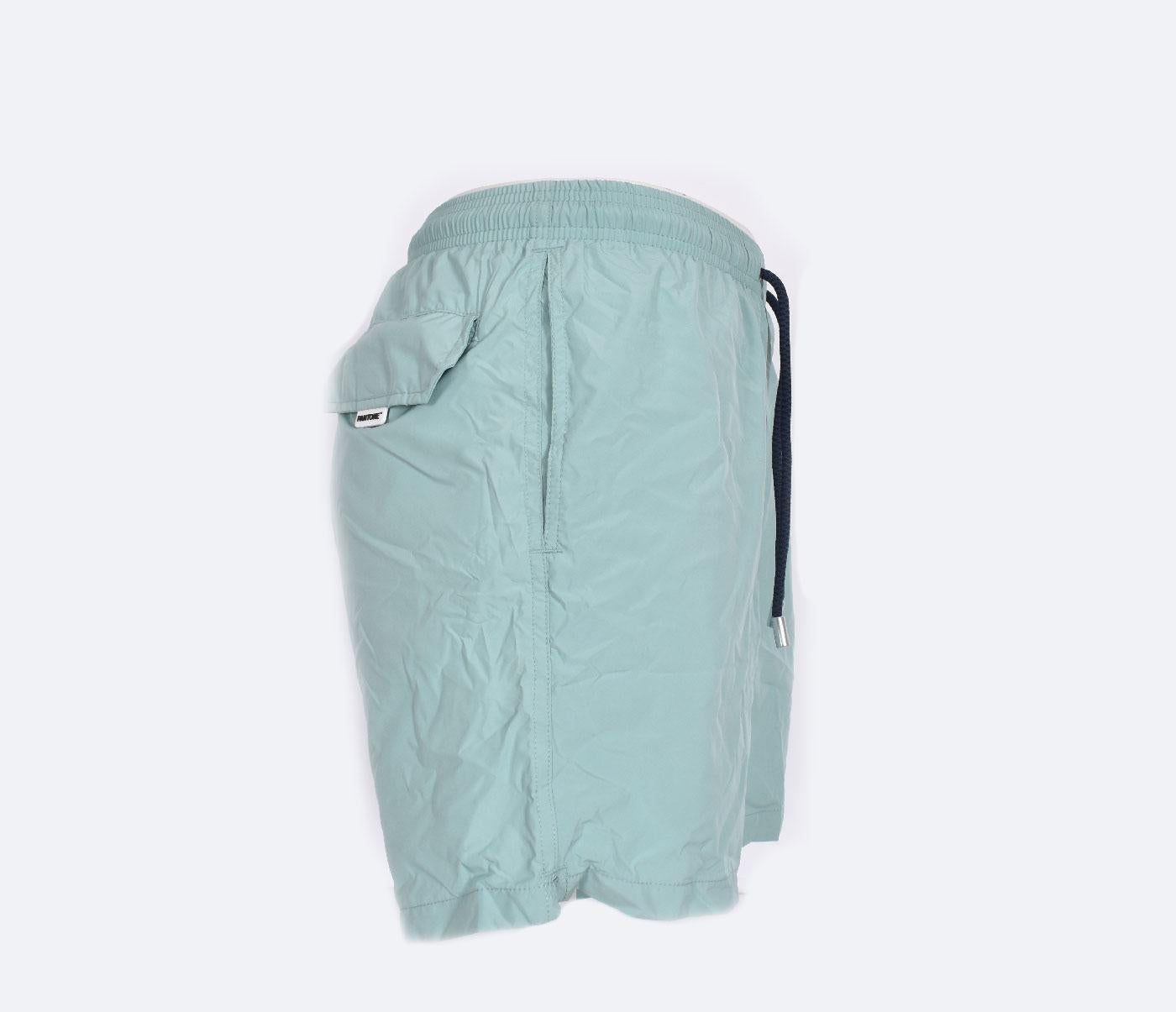 Costume da bagno modello corto, colore verde acqua tinta unita. Elastico in vita, laccio in cotone, tasche ai lati, retina antibatterica. Collezione Primavera/Estate 2025