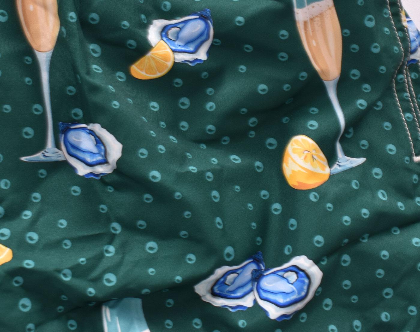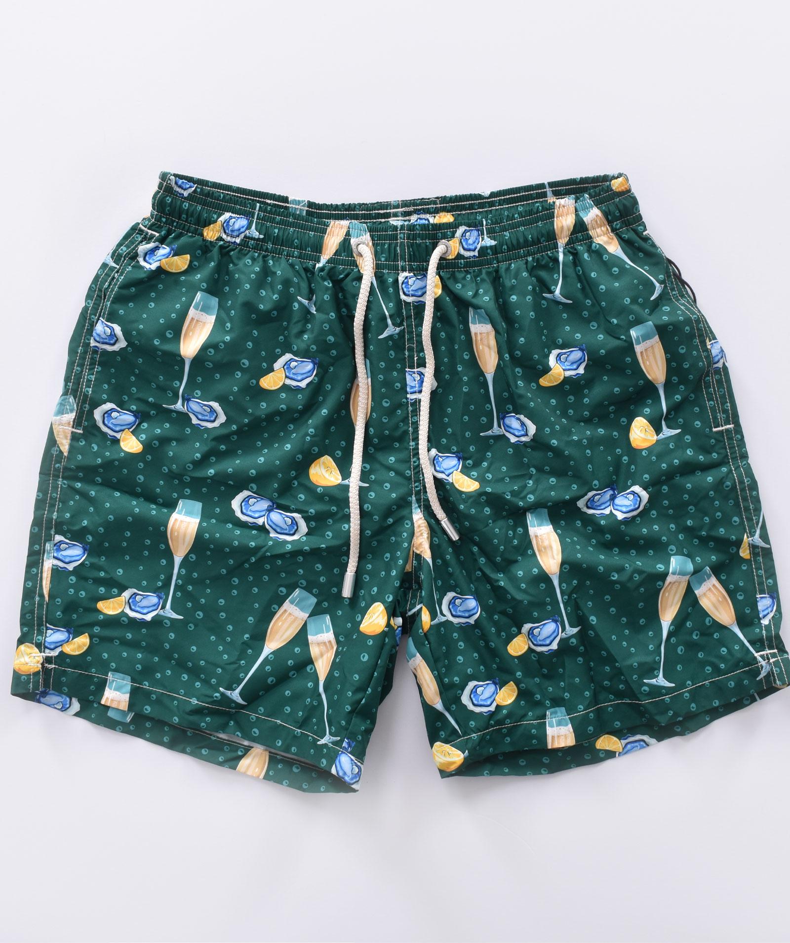 Costume da bagno colore verde con stampe calici spumante. Elastico in vita, laccio in cotone, tasche ai lati, retina antibatterica. Collezione Primavera/Estate 2025