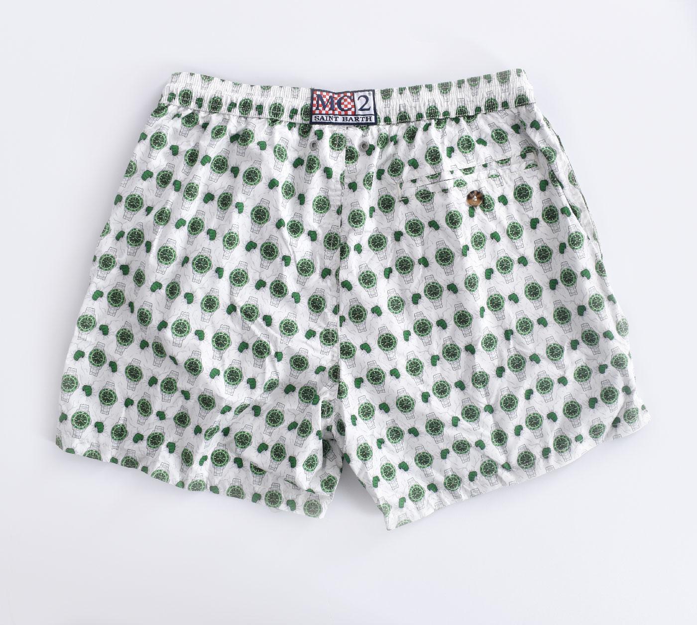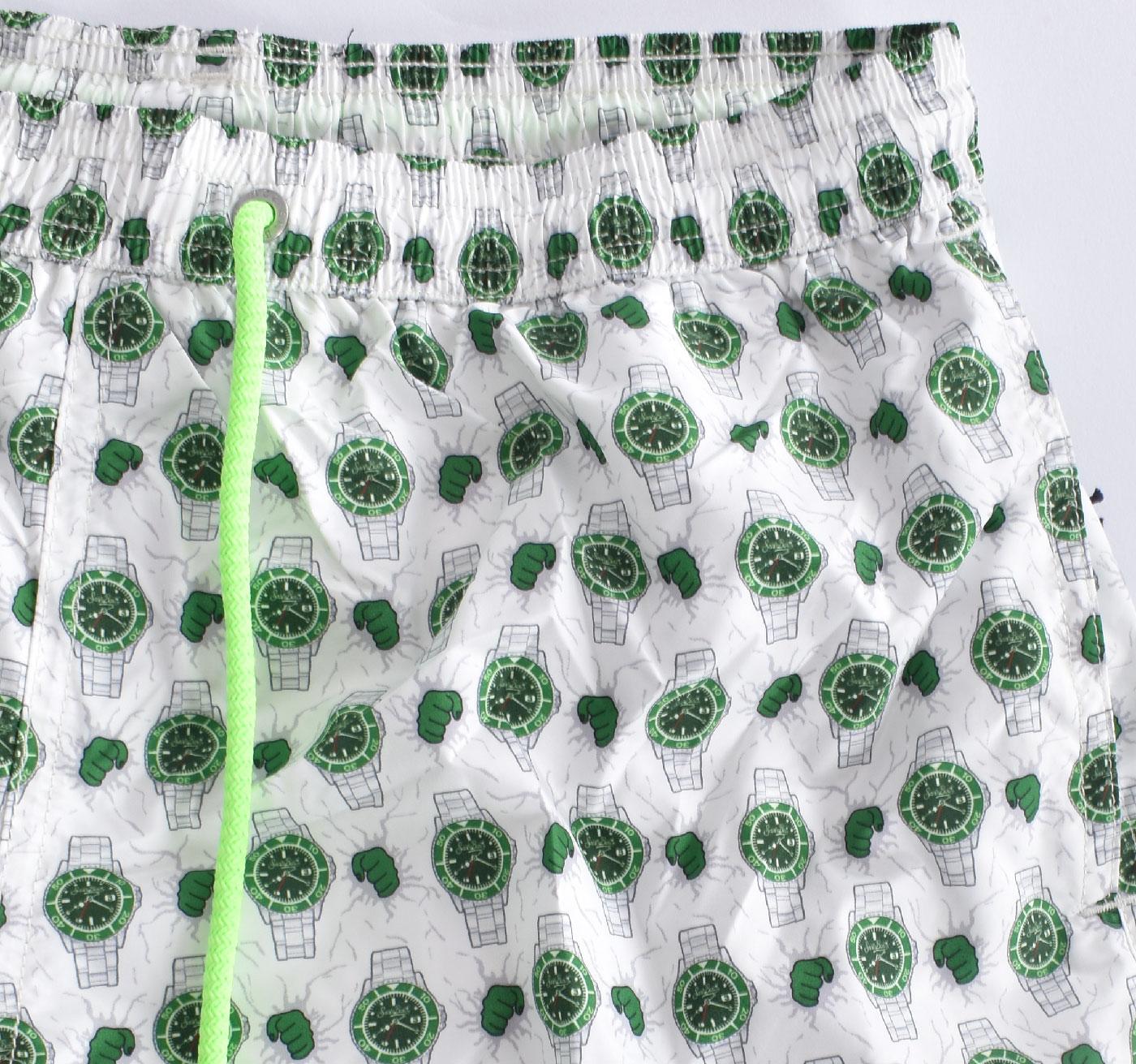 Costume da bagno colore bianco con stampe orologi e pugni. Elastico in vita, laccio in cotone, tasche ai lati, retina antibatterica.