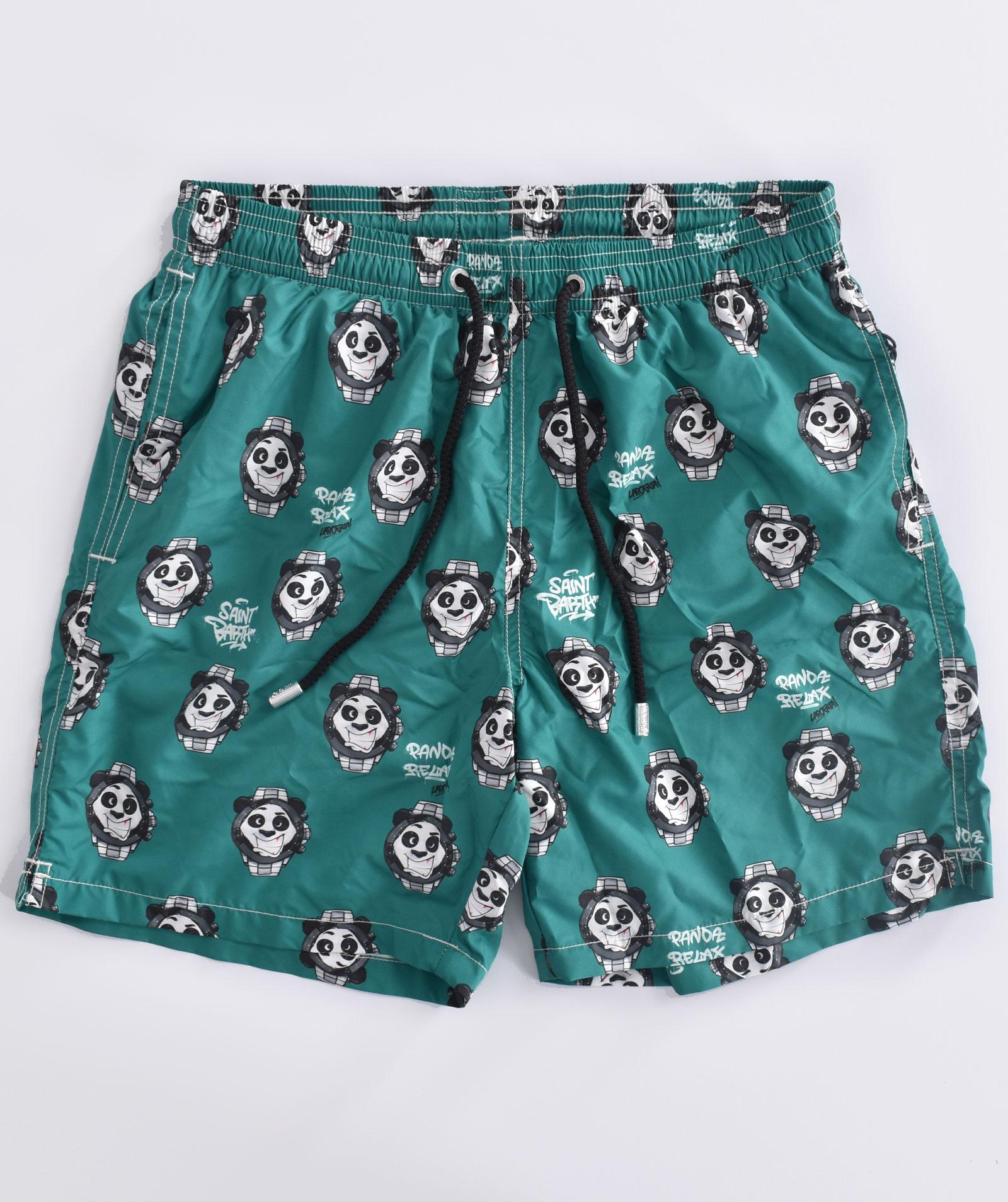 Costume da bagno colore verde con stampe panda e orilogi Crypto Puyppets. Elastico in vita, laccio in cotone, tasche ai lati, retina antibatterica.
