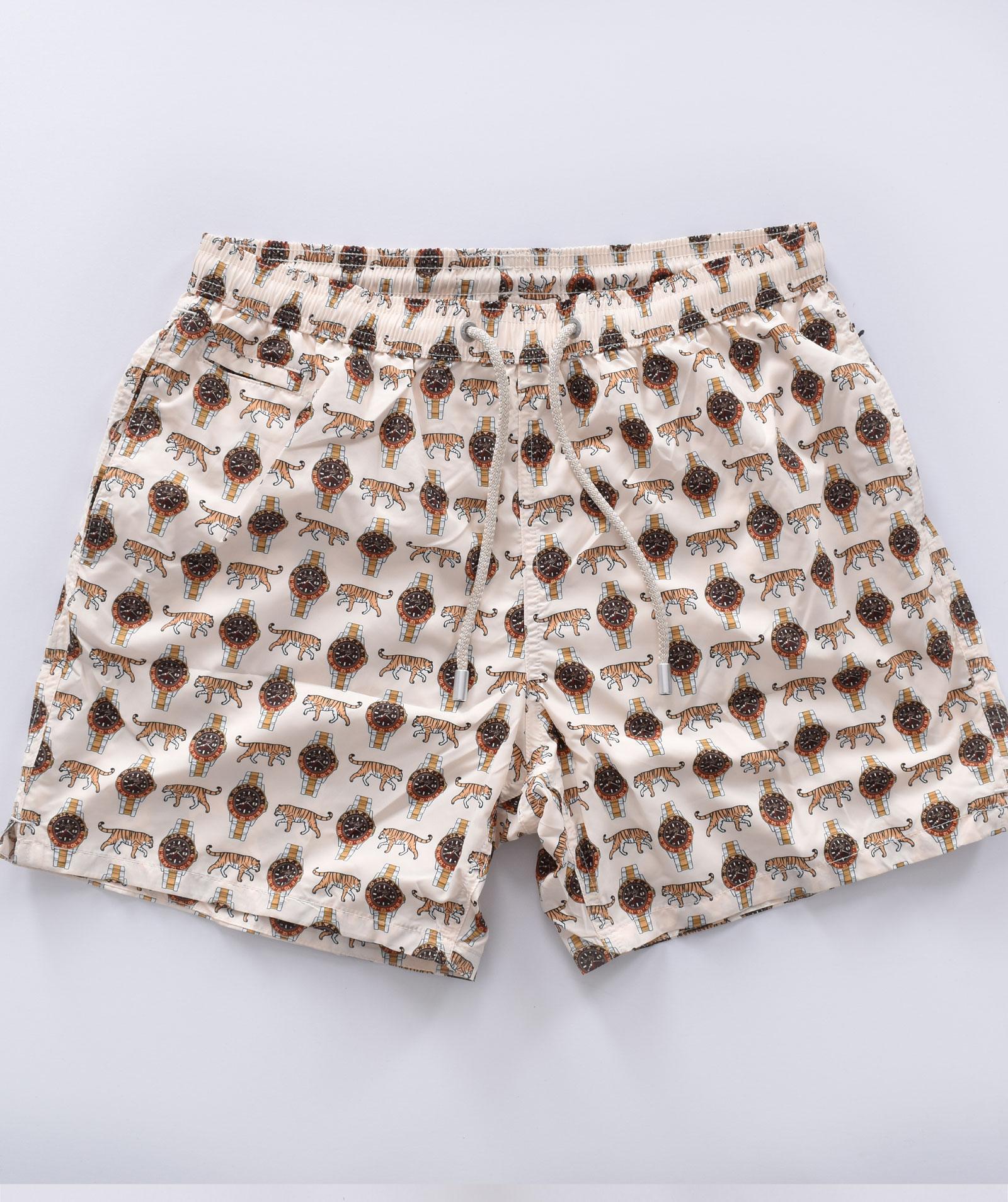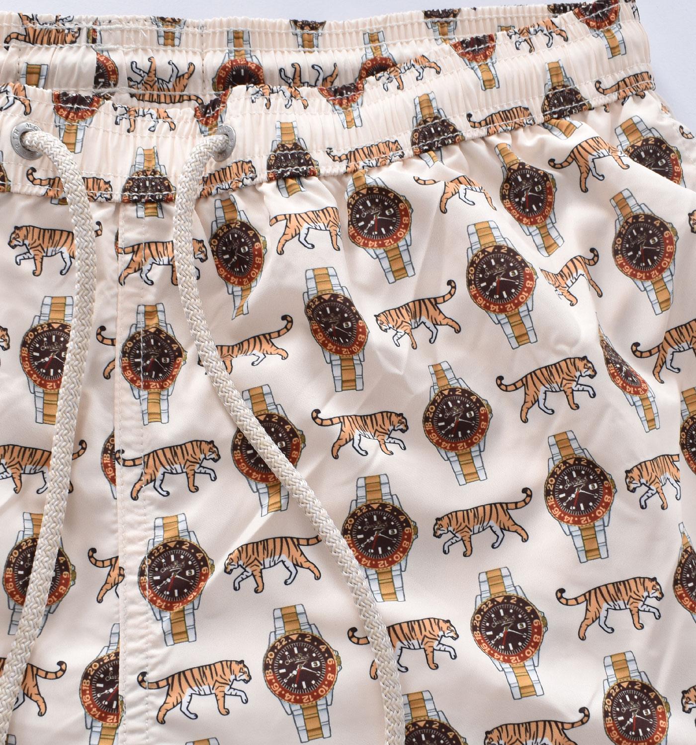 Costume da bagno modello corto, stampe orologi e tigri, colore bianco latte. Elastico in vita, laccio in cotone, retina antibatterica. Collezione Primavera/Estate 2025
